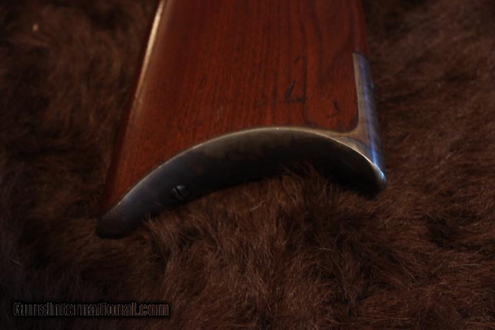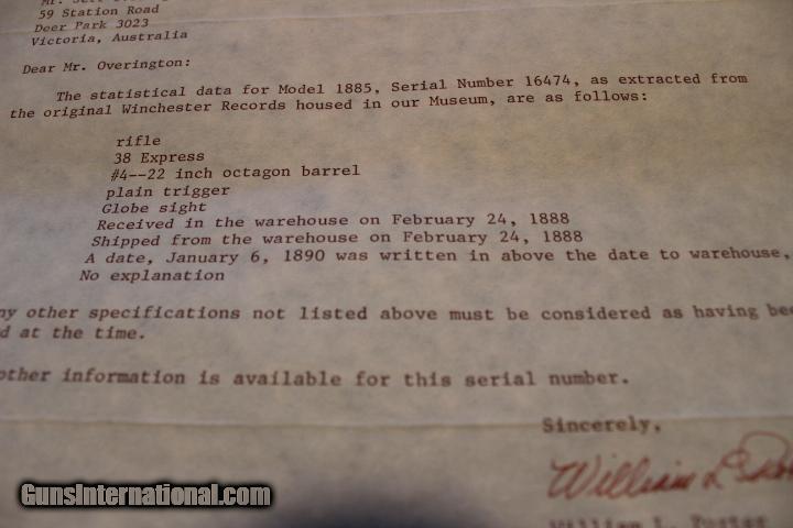 Description: Super Rare Winchester Model 1885 38 Express Caliber, 21" Octogon Barrel, Brilliant C/C, #4 heavy Barrel, globe front sight, Near New original condition. Letter states 22" barrel but barrel actually measures 21" If barrel had been cut one inch half of the dovetail cut would remain so I am certain the rifle left the factory with a 21" barrel. A most unusual and desireable High Wall!! SOLD Antique: Yes |