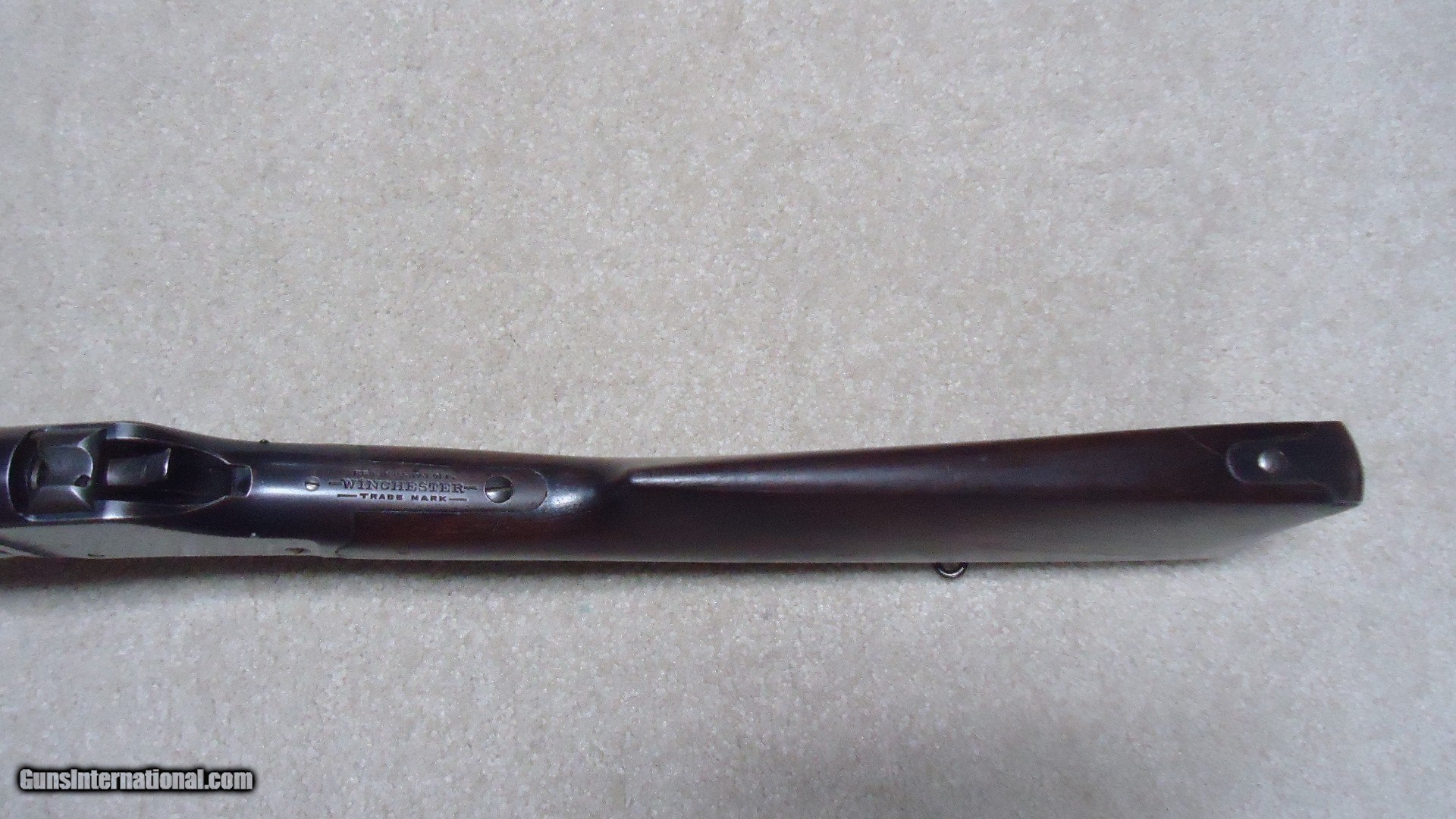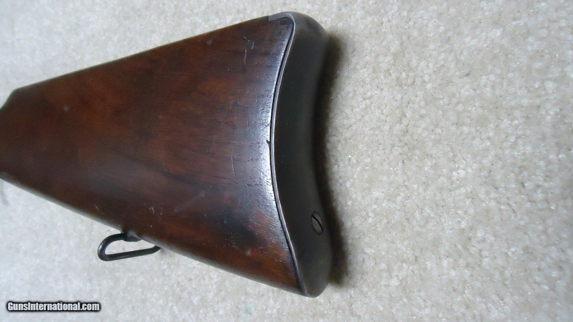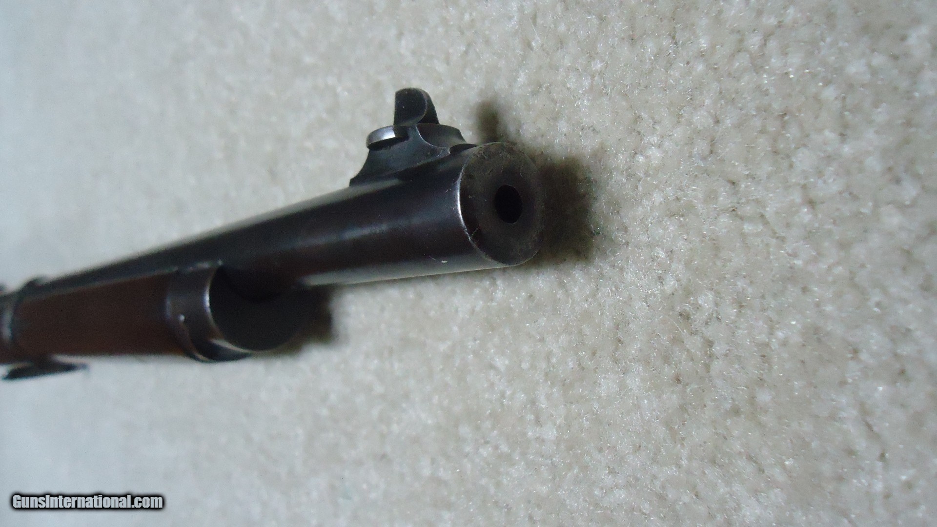 Description: VERY FINE CONDITION 1885 HIGHWALL .22 LONG RIFLE CALIBER MUSKET, #117XXX, MADE DURING WORLD WAR I IN 1916. Quite a bit more scarce than the Lowall Muskets typically made in .22 Short caliber, this example is correct and unaltered. It is fitted with the correct 1901 adjustable rear barrel sight that was also used on the Krag military rifles. The receiver shows fine deep original blue with light very small areas of brown beginning to creep in. Fine lightly aged barrel blue. Excellent butt stock and forend with tight wood to metal fit, nice reddish-brown Winchester finish that has never been sanded, good blue on the forend cap, tight action and excellent bright bore, crisp trigger and strong half cock safety on the hammer. Overall shows just light handling. Very hard to find excellent bores on these as most were shot with corrosive ammunition and not cleaned immediately after firing. This is a very fine example inside and out. SOLD Curio/Relic: Yes Manufacturer: WINCHESTER Model: 1885 MUSKET Serial Number: 117XXX Barrel Length: 28 Condition: FINE+ Bore Condition: EXCELLENT |