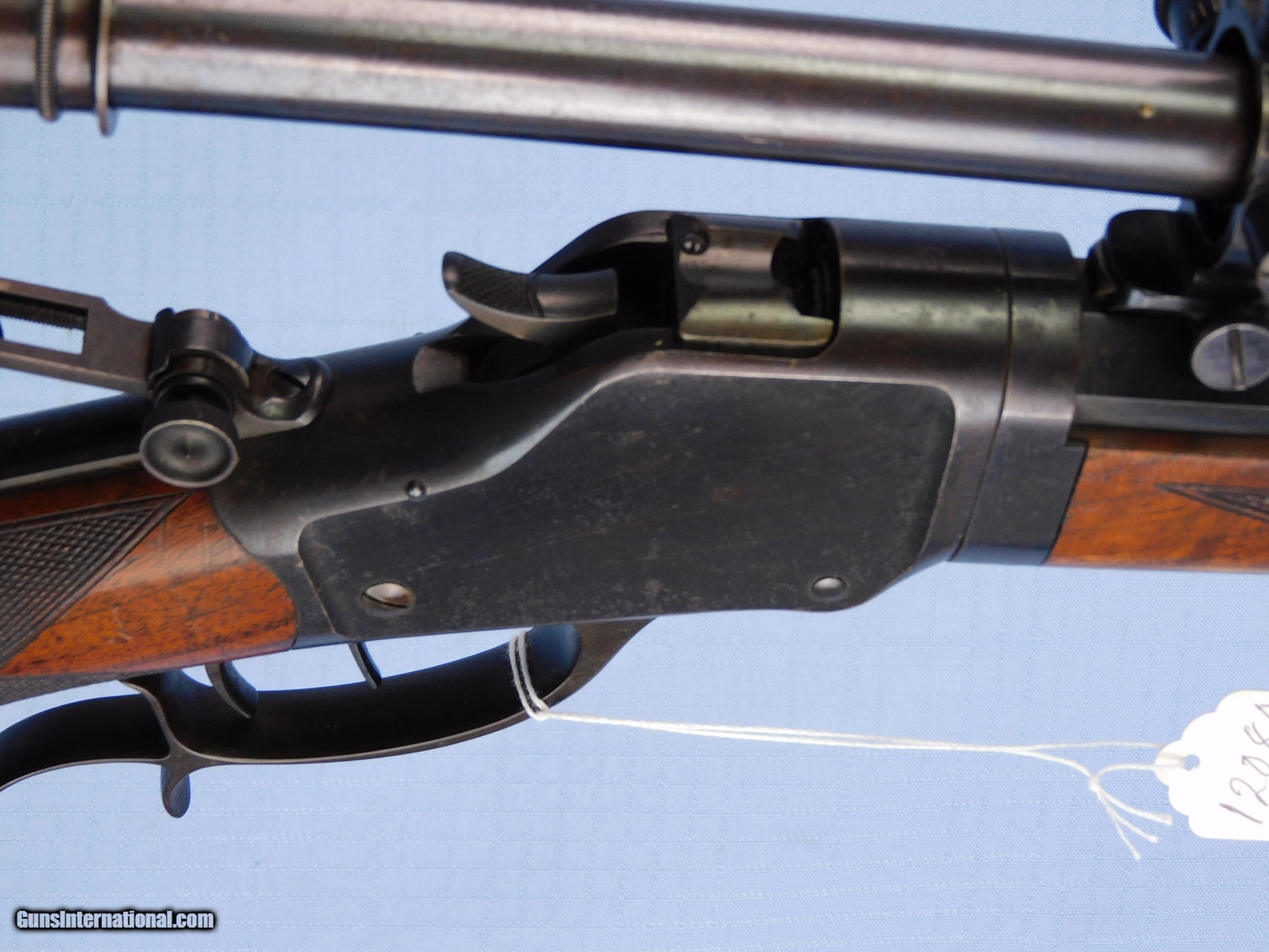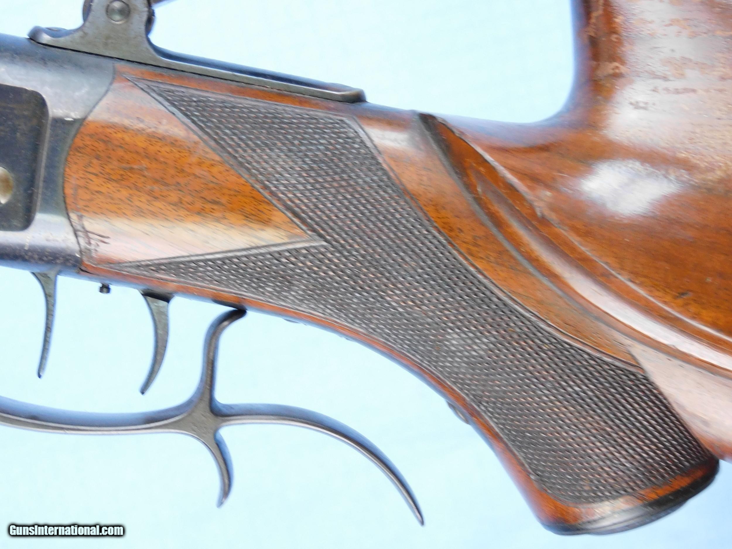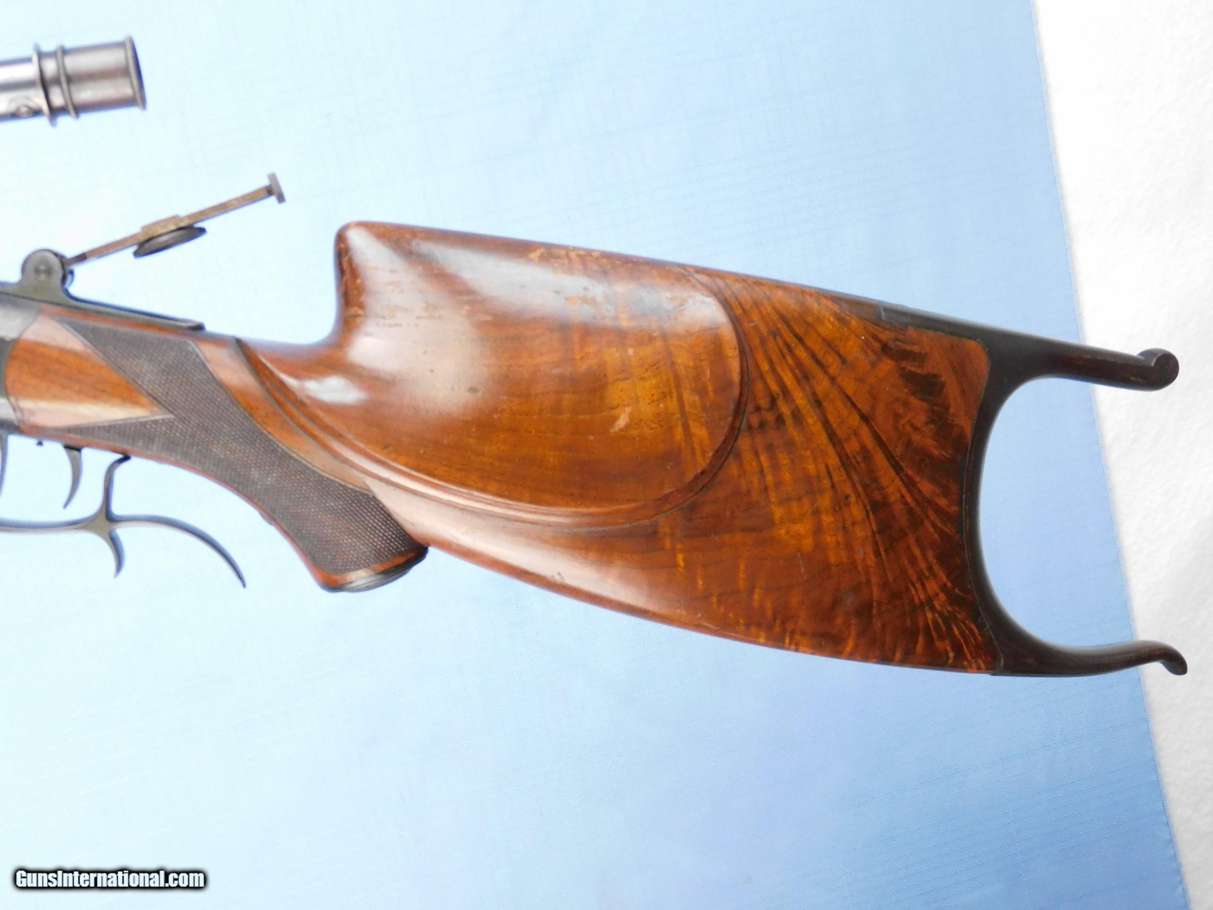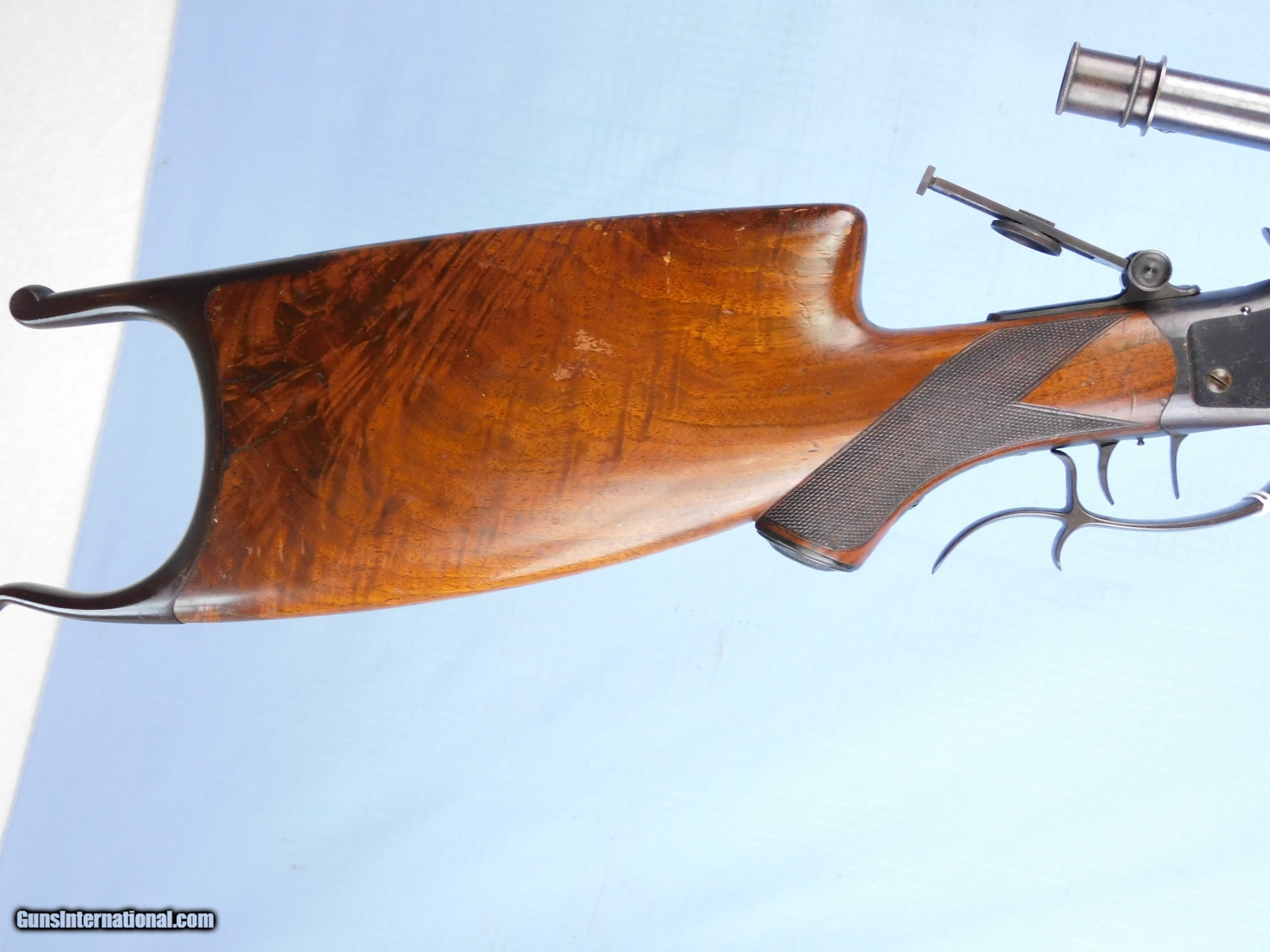 Description: #1208A WIN. MODEL 1885 HI WALL SCHUETZEN TD RIFLE, 22 short, SN 1120XX, 30” oct. bbl., VG checkered Schuetzen stock and forend with some finish wear, vernier tang sight, spirit level vernier front, Win. A5 scope & mounts, DST, Win. palm rest, Schueten buttplate, exc. bore, 97% blue, Cody sheet. $8500 SOLD Antique: Yes Rifle Caliber: .22 Short |