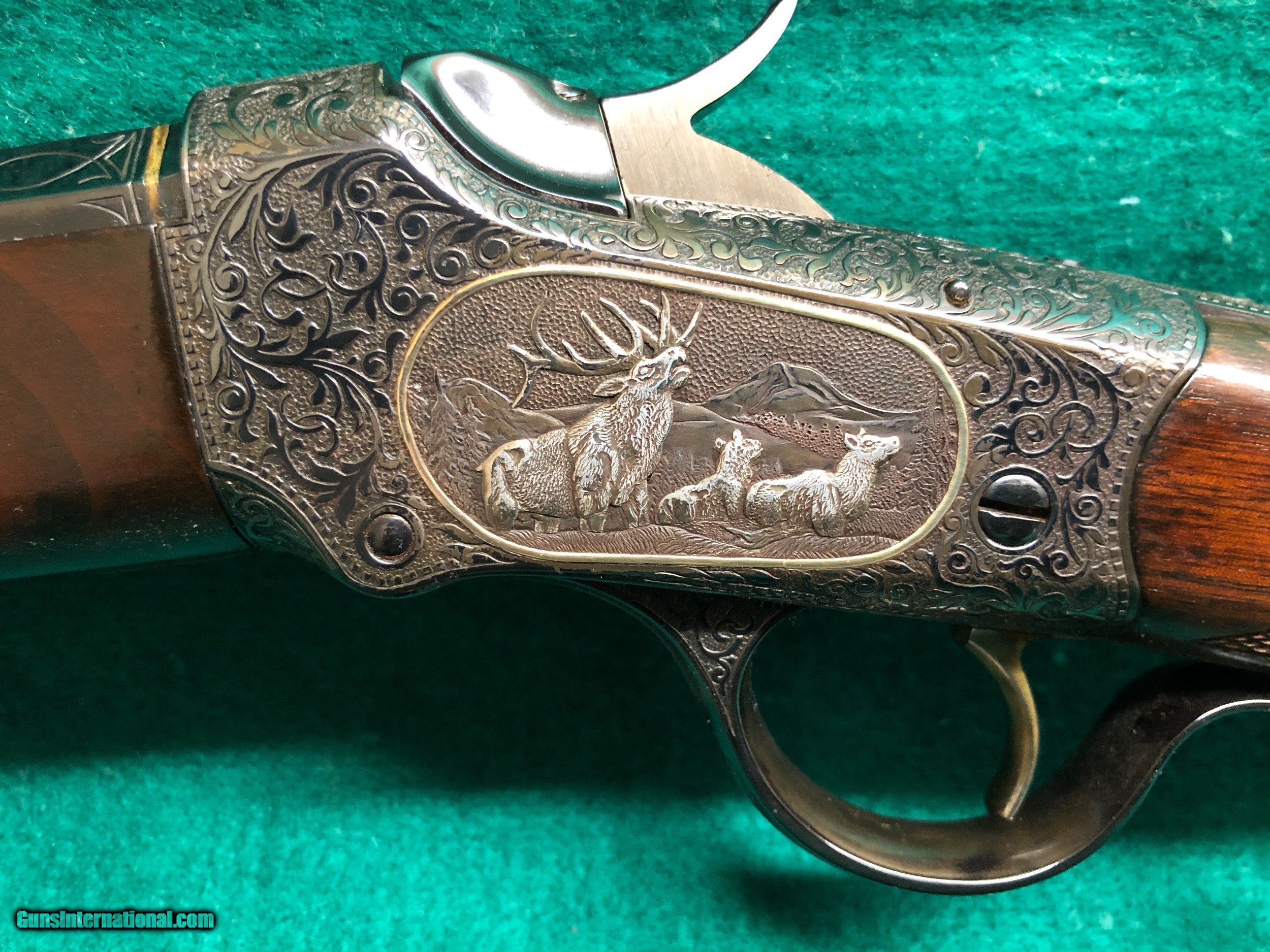Description: ONE OF A KNID WINCHESTER 1885 32-20 CALIBER ENGRAVED BY WILLIAM C SEVERSON SR.ON ONE SIDE THERE IS 1 BULL ELK AND TWO COWS IN THE WHITE WITH A GOLD BORDER, ON THE OTHER SIDE THERE IS A GRIZZLY WITH DOWN MOOSE AND A GOLD BORDER. THE TANG FEATURES A MOUNTAIN LION AND THE BUTT PLATE HAS A ELK ENLAYED. THERE ARE 2 GOLD BANDS INLAYED AT EACH END OF THE BARREL. THIS RIFLE WAS MADE IN 1887 AND IS ANTIQUE. SOME OF BILLS WORK CAN BE SEEN IN THE R.L. WILSON BOOK. SOLD Antique: Yes Rifle Caliber: .32-20 Winchester Manufacturer: WINCHESTER Model: 1885 Barrel Length: 28 Condition: EXCELLENT Engraving: WILLIAM C SEVERSON SR |