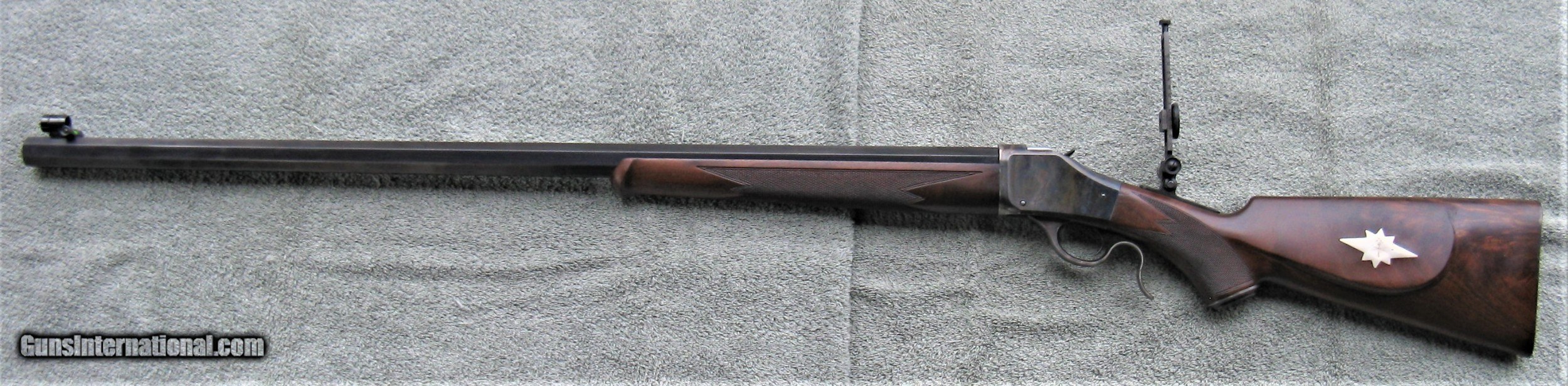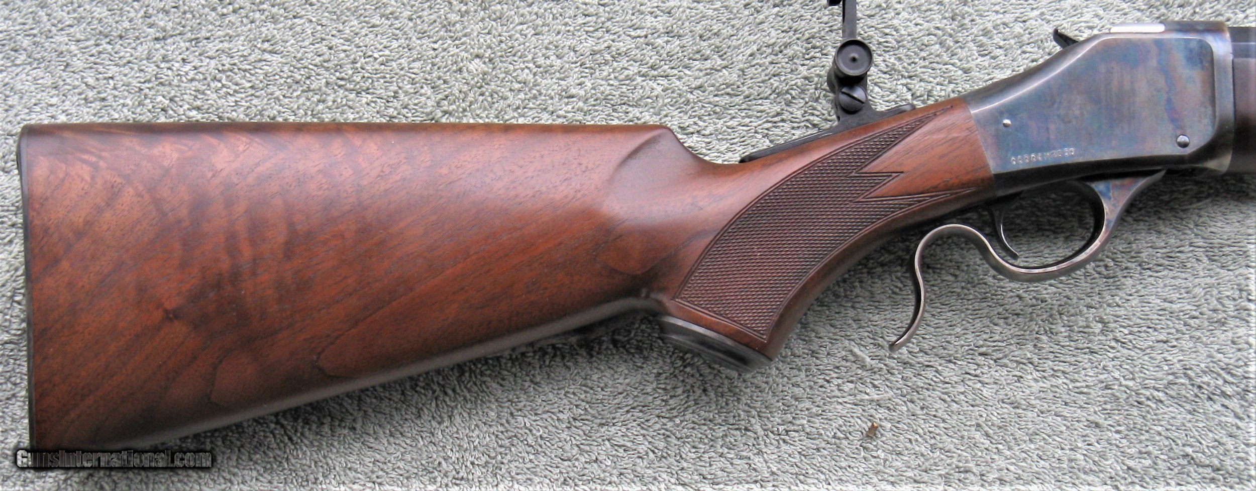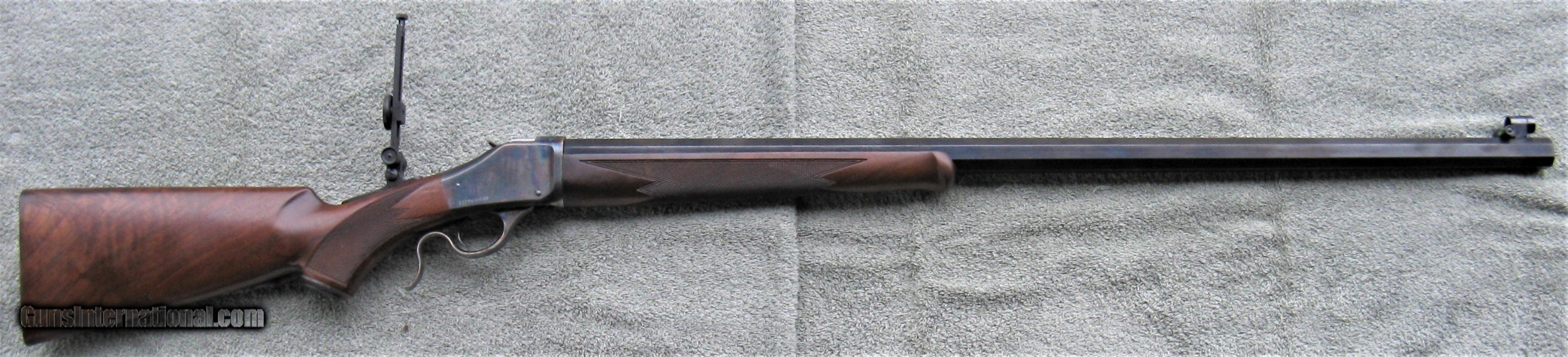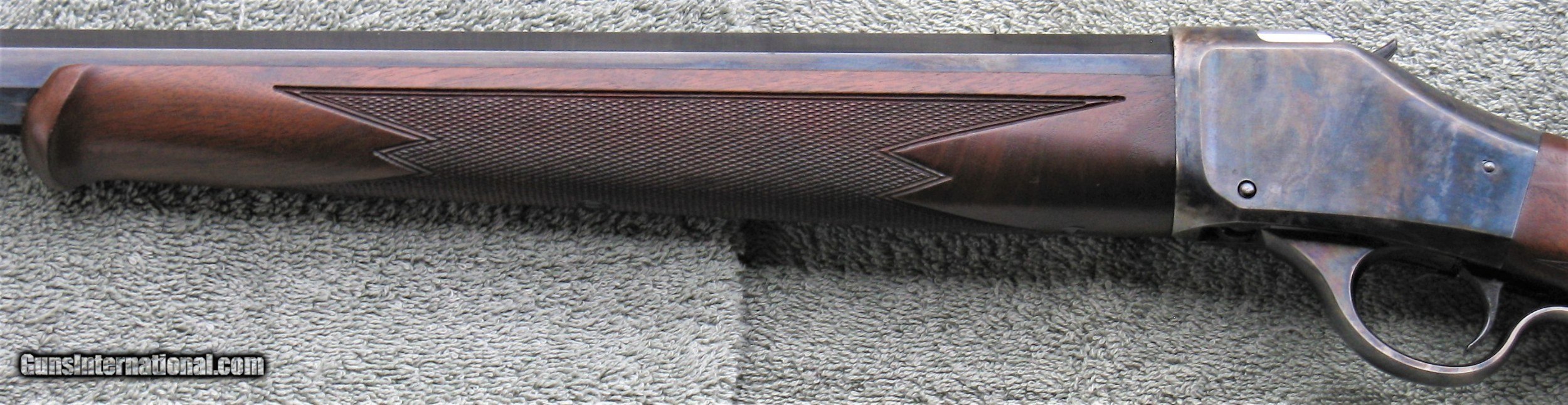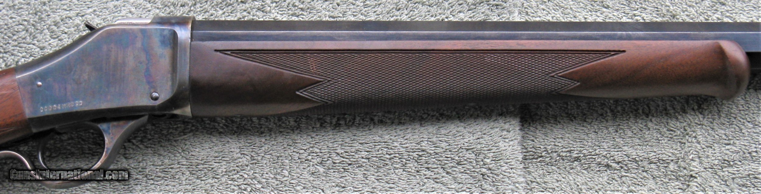 Description: This rifle started out as a Miroku manufactured Limited Series Winchester Model 1885 High Wall .45-90 Creedmoor Single Shot BPCRs with a serial # 4 from a lot of 126 rifles. The rifle was rebarreled with a 32” full octagon Green Mountain barrel chambered for the .40-65 Win. The rifling twist rate is one in 16. An MVA front sight was installed and the stock very nicely inletted with a brass emblem. The rifle was fully disassembled and cleaned. It’s in excellent condition with a perfect chamber and bore. There are some very faint scratches on the receiver and the stock has a few tiny “safe dings”. The rear sight is a vernier soule-style windage-adjustable design made by AMT for Winchester. It comes with an aperture with hole a size of 0.052”. I recommend replacing the aperture with a Hadley-style selectable aperture. The front sight is a windage-adjustable, hooded, globe-type, spirit-level design manufactured by MVA. The rifle does not come with front sight inserts, but they can be purchased from MVA or other suppliers. The barrel has been drilled and tapped for scope mounts with a spacing of 17”. On a very accurate postage scale, the rifle weighs 11lbs 15oz with the sights and eyecup installed. The trigger sear has been worked on by a gunsmith, resulting in a very nice crisp 1lb 5oz trigger which is ideal for silhouette or target competition. I SELL TO CALIFORNIA BUYERS FOR NO ADDITIONAL CHARGE. A signed copy of your dealer’s FFL will be required with their phone number. The rifle will be shipped to the address on the FFL. Shipping and handling is $60.00 (CONUS only), which also covers full insurance. Shipping to Alaska and Hawaii will require an additional charge. I only ship FedEx ground and the rifle will be fully insured. Texas residents are required to pay 7.75% sales tax. For immediate shipping US Postal Service money orders are required. Certified cashier’s checks will delay shipping 5 business days. A phone number is required to contact the issuer of a cashier's check for verification. No other forms of payment are accepted. Specializing in Browning and Winchester BPCR's, rifles are displayed and described as accurately as possible and I have not had an unsatisfied customer. As a seller of scores of Browning and Winchester BPCRs, and having written and published a book on the rifles, you can trust that each rifle, new or used has been fully checked out and is in the conditioned advertised. THE PHOTOS ARE OF THE ACTUAL RIFLE BEING SOLD. Thanks. SOLD Rifle Caliber: .40-65 Winchester |