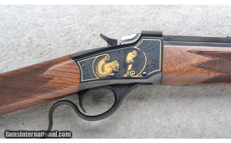 Description: This Winchester Model 1885 is a single shot falling block action rifle in .22 Long Rifle cal. It has a 24.5 inch half round half octagon barrel. A blade front sight and adjustable notch middle sight. The butt stock is a checkered grip walnut straight grip. The forearm is a checkered grip walnut Schnabel style with black in the tip. The receiver sides are engraved with oak leaf and have sqirrels and rabbits in gold in outdoor scenes. .22 Long Rifle SOLD Chambers: Single Shot. Metal Condition: Excellent. Wood Condition: Excellent. Small dent in left side butt stock. Bore Condition: Excellent. Barrels: 24.5 inch half round half octagon barrel. Triggers: Grooved. Stock Dimensions: LOP 13 1/4 inches. Fore End: Checkered grip walnut Schnabel style with black in tip. Butt Pad: Smooth black steel crescent. Weight: 7 Lb. 14 Oz. Sights: Blade front with a brass bead. Adjustable notch middle. Item Location: Richfield, WI |