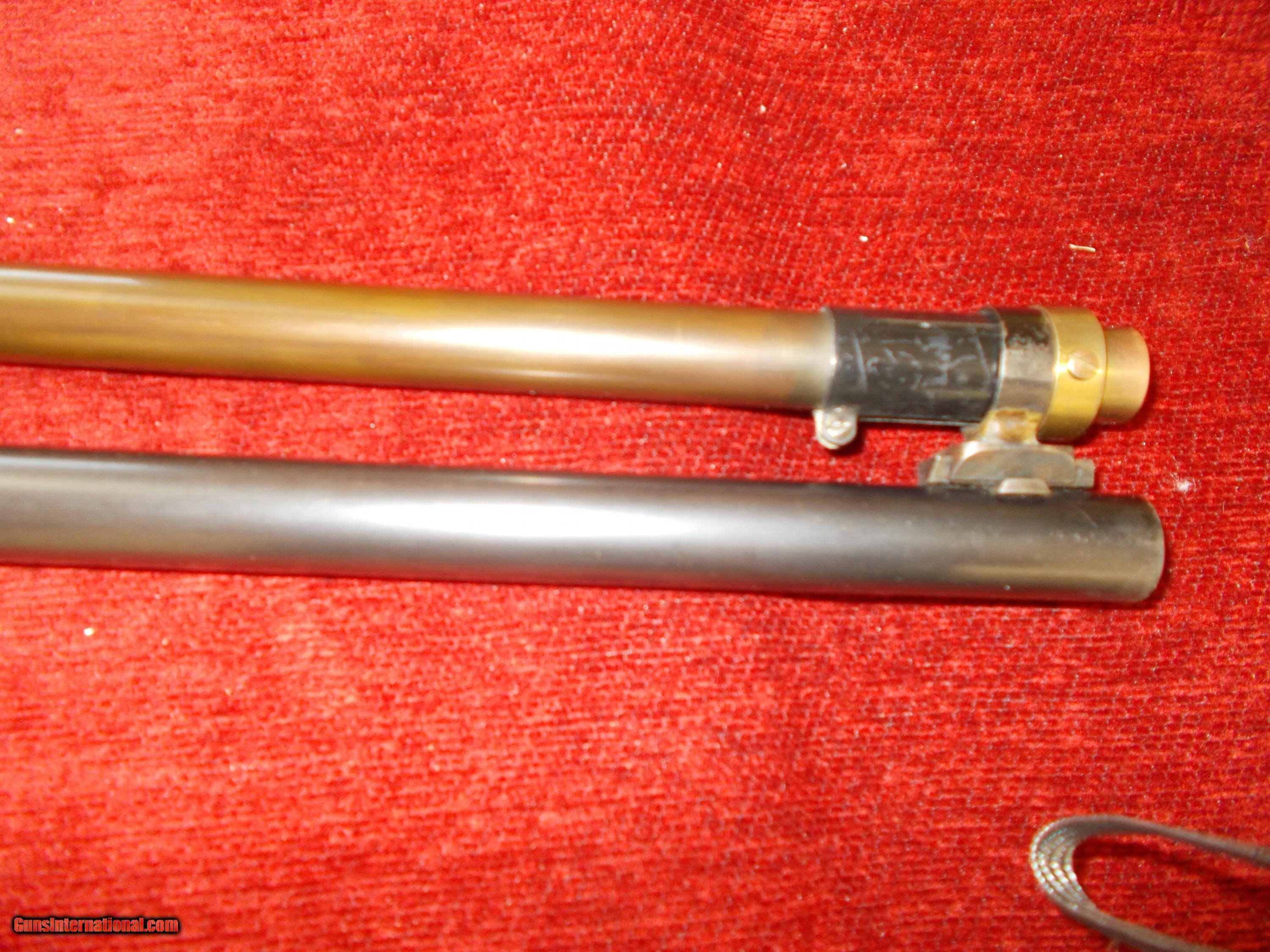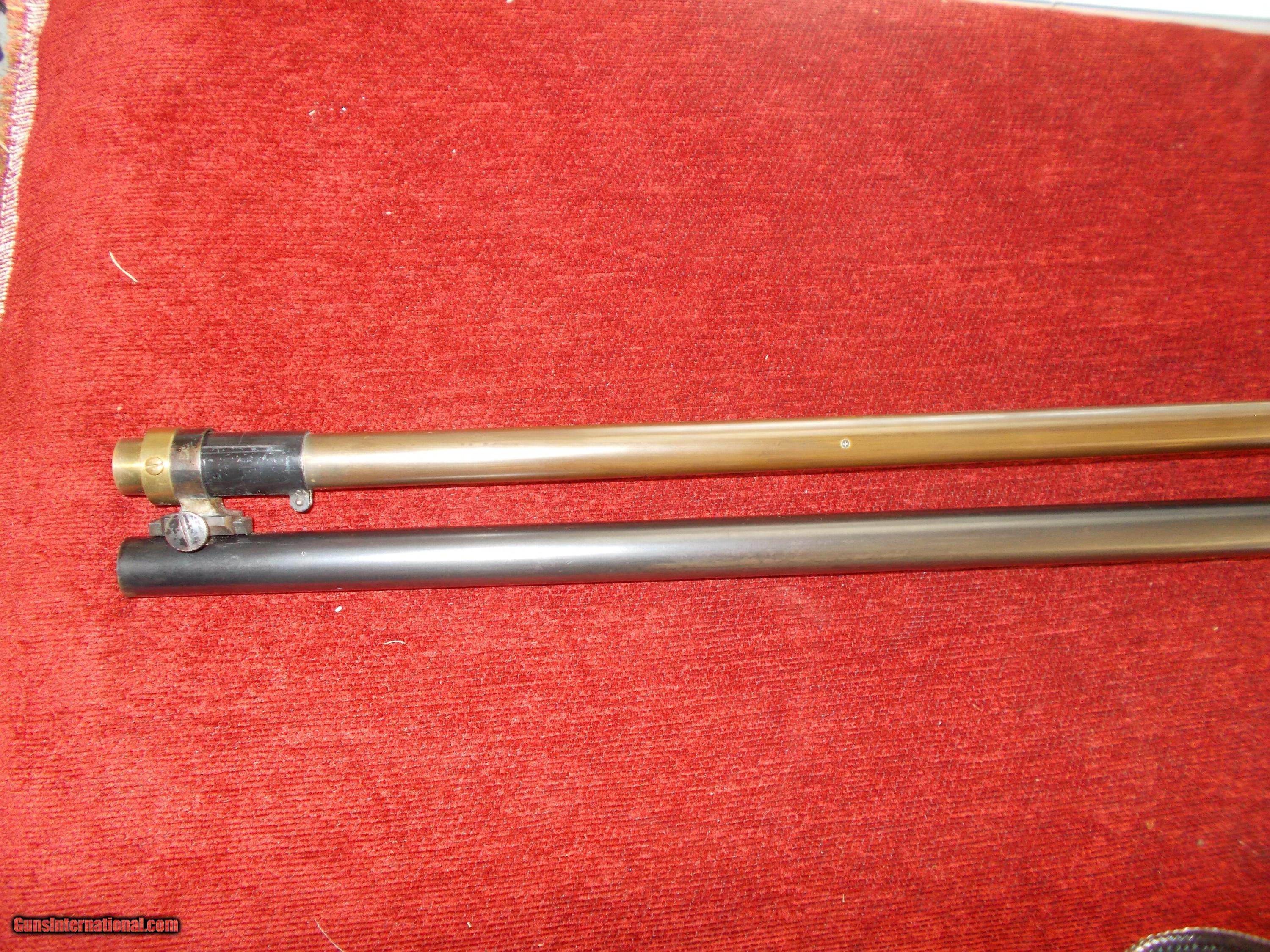 Description: 30 " 1/2 round - 1/2 octogon, no sights (original ), single trigger, full bbl. length brass period scope, (very clear), most exotic of Amnerican checkered walnut stocks available, Schutzen (Swiss) style stock & butt, 95% case colors & bbl. blue, great bore, light handling only: This 1885 is as nice a one available & 100% original!! SOLD |