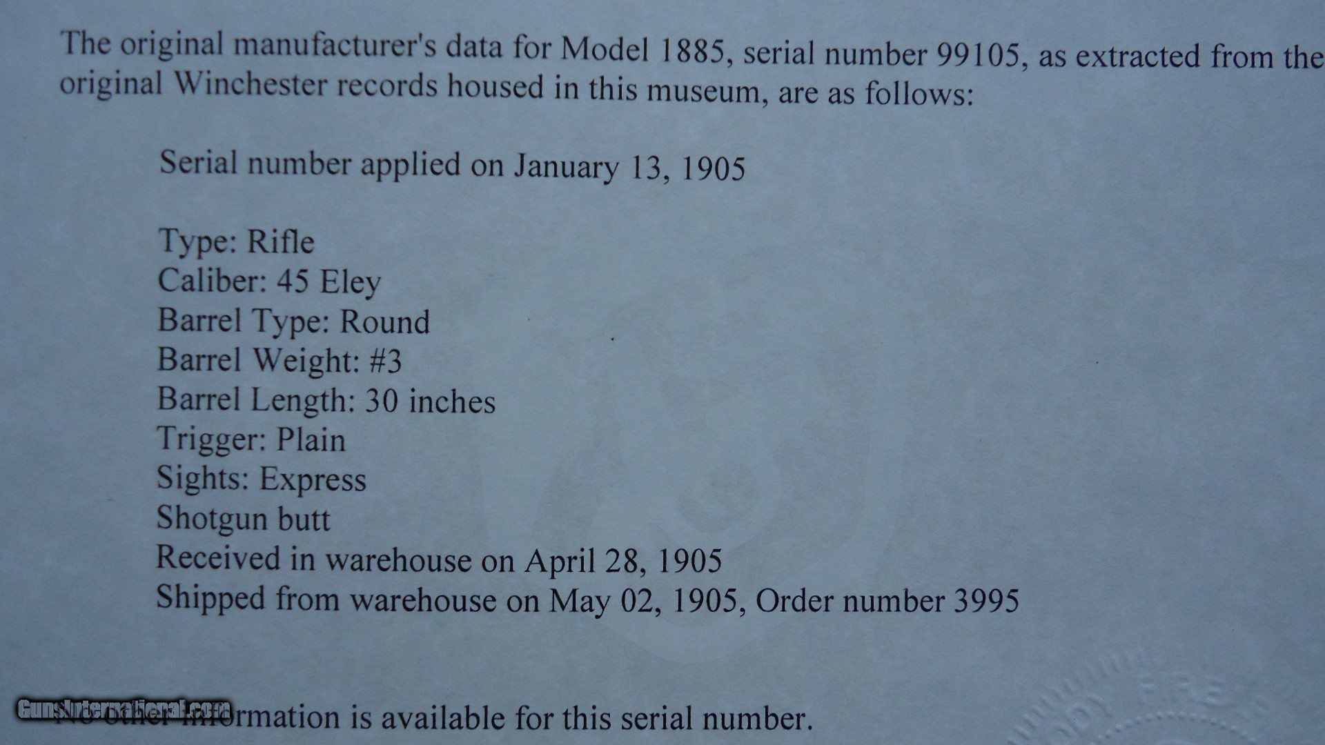 Description: This gun is awesome condition with most all of the original blue remaining on the barrel and receiver. Features a 30 inch round barrel chambered in the scarce 50 ELEY EXPRESS caliber. Original sights include the Lyman flat top front sight, 3-leaf express rear sight and what appears to be a Pope tang sight. Vivid case colors on the hammer and lever. Mint bore. This gun has a steel shotgun style buttplate that also retains most of its shiny blue. Comes with a Factory Letter that states 45 Eley caliber but I believe that is a Factory mistake in recording because this gun has never been touched. All the stock finish is intact. This is a beautiful gun inside and out. Leroy Merz Antique Firearms specializes in antique and vintage Winchesters and other fine American firearms. Since 1965 Mr. Merz has taken part in the world of firearms and has been a contributor to many well known reference books. We have hundreds of additional guns in every price range at our home online. Search for Merz Antiques in google. SOLD Curio/Relic: Yes |