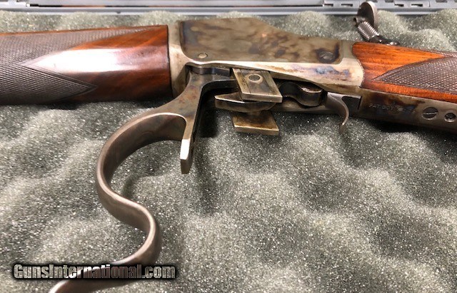 Description: Winchester 1885 High Wall 38-55 Price drop to $8000.00 on 10/21/2019 from $9,0000.00. SN- 72XXX VERY rare piece in excellent condition 90% Deluxe Grade 32" half octagon/half round bbl Rear hunter peep site Front globe site adjustable for windage Swiss buttplate, brass- chrome plated Does NOT have set trigger Please call or email for additional information and photos. SOLD |