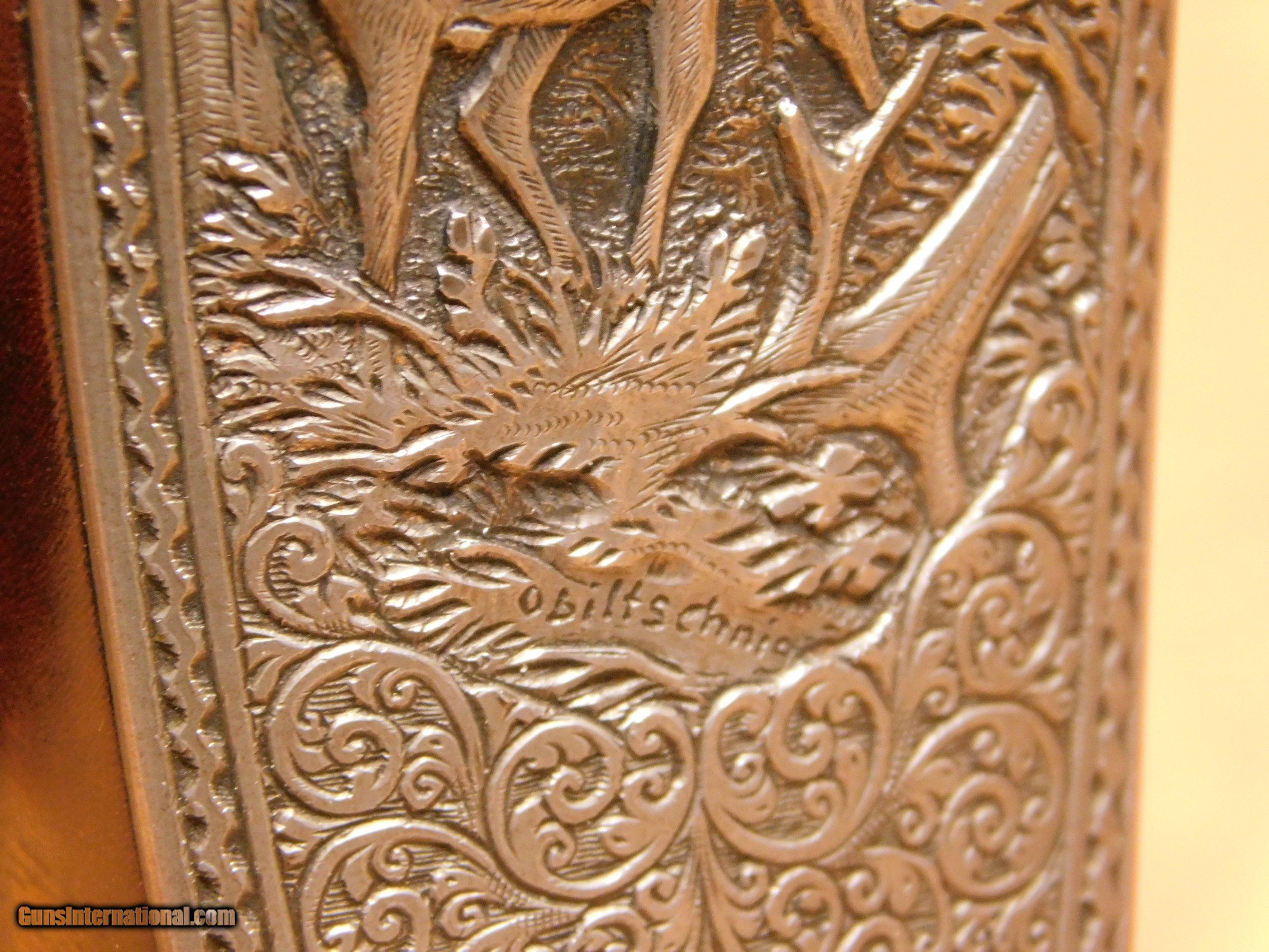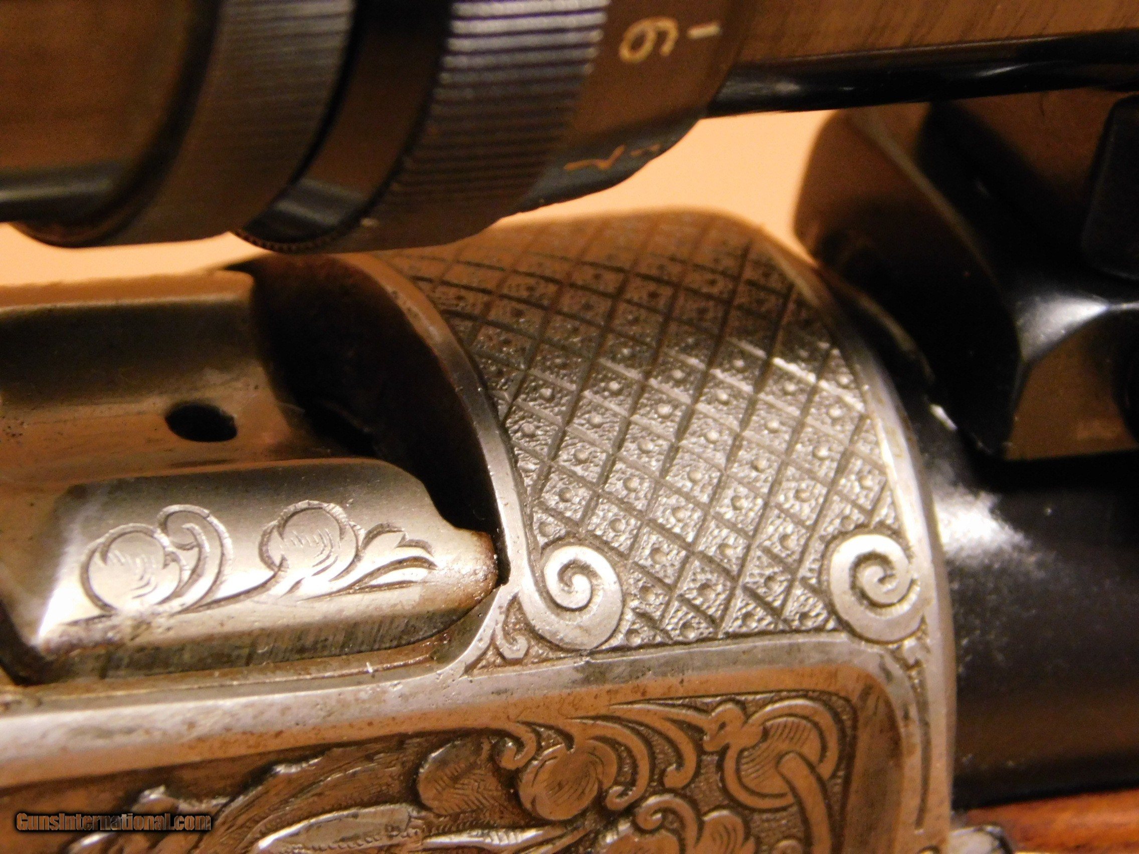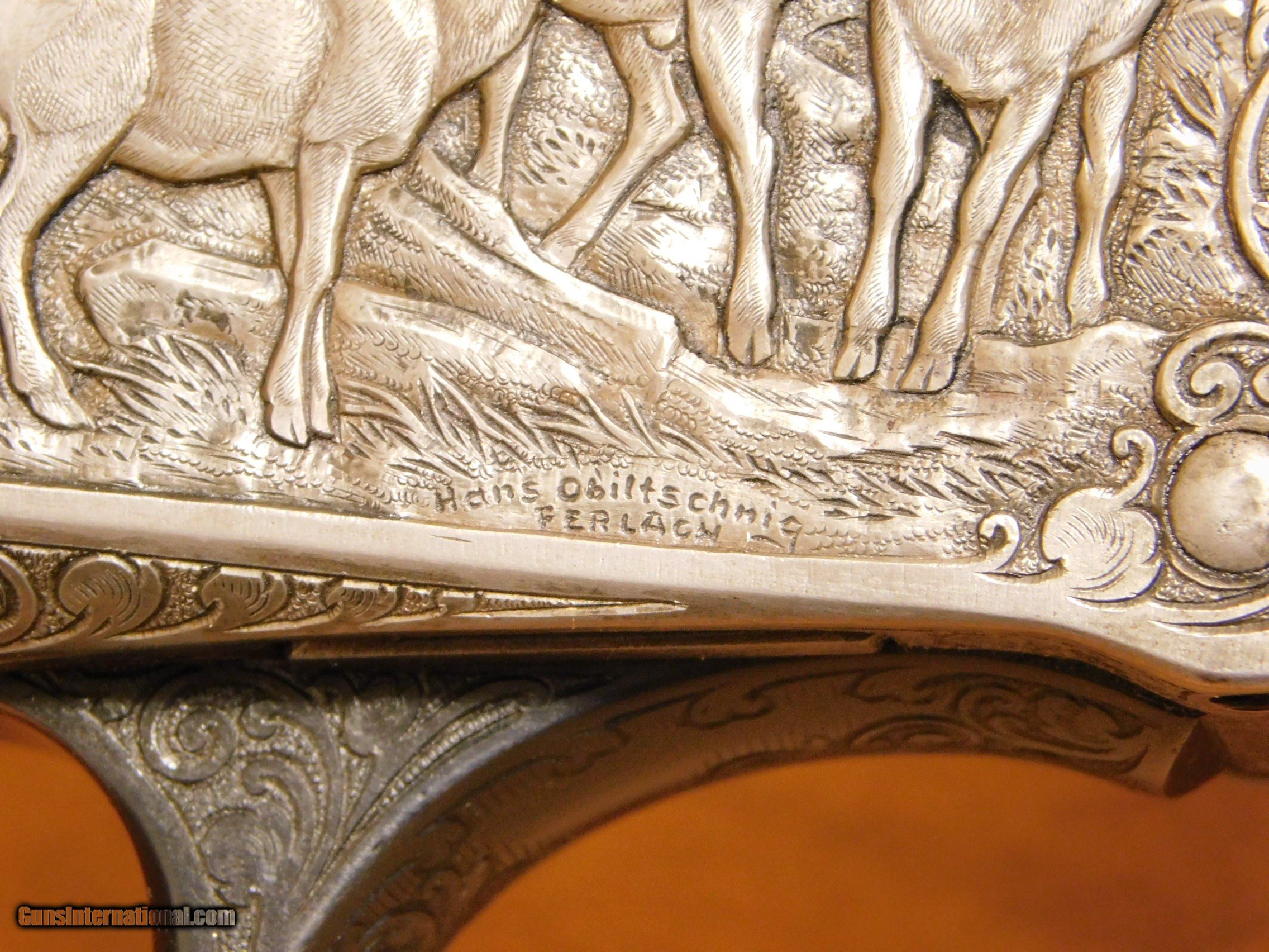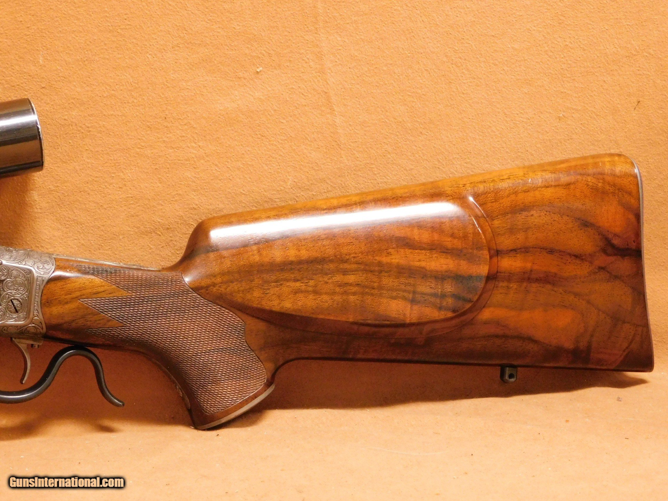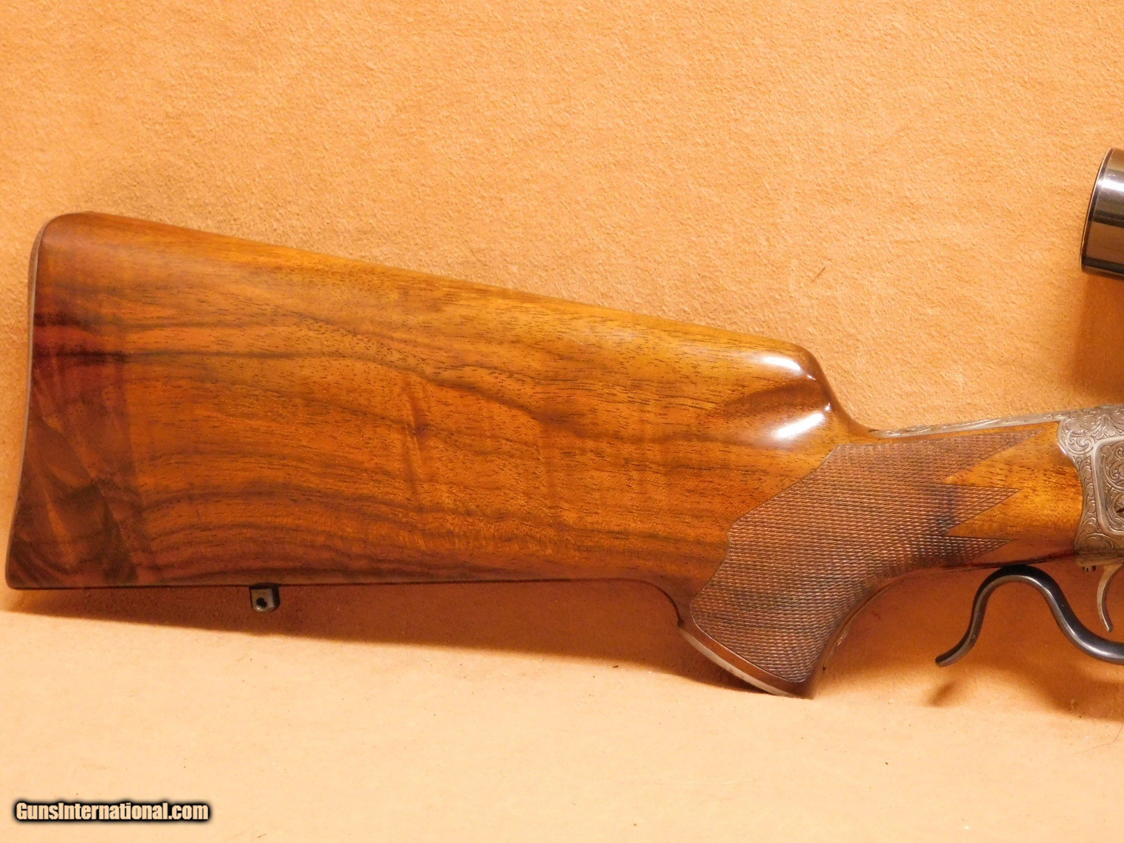 Description: This is a spectacular Winchester High Wall 1885 in .270 Winchester with a 24-inch, medium-weight barrel (with no sights). It was customized by PO Ackley and Hal Hartley and engraved by renowned Austrian engraver Hans Obiltschnig. The left side of the chamber area is signed with PO Ackley's name and the caliber of the rifle: .270 Winchester. The rifle also features a single set trigger, and a vintage Weaver V-9 II scope mounted atop Leupold bases. The rifle is set in spectacular European walnut with diamond point checkering and a matching forearm that has a Schnabel tip. The pistol grip stock features a shadowline/pancake cheekpiece and a sculpted and engraved buttplate. The left side of the receiver has a large raised vignette of four elk with a very finely detailed background. The right side is exquisitely engraved with a large raised vignette of three Dall sheep in an equally elaborate mountain scene. The remainder of the receiver has full coverage foliate Arabesque with a very finely detailed background. The grip cap is engraved to match, with the center round vignette of the raised head of a dall sheep. The receiver and buttplate are both signed by Mr. Obiltschnig. This is one of the most spectacular custom rifles. It is in extremely fine condition and appears to be unfired since completion. The barrel and lever retain the bright custom blue. The receiver, butt plate, and grip cap are coin-finished. The wood is sound and retains virtually all of its custom finish, with several small pressure dings. The mechanics are crisp and the bore is bright and shiny. The optics are fine. All items are also available for sale in our brick & mortar store and are subject to prior sale. Think long, think wrong. Payment On firearms, we typically only accept credit cards or money orders/cashier's checks.