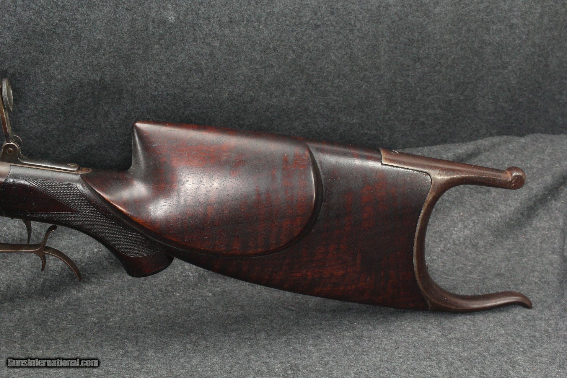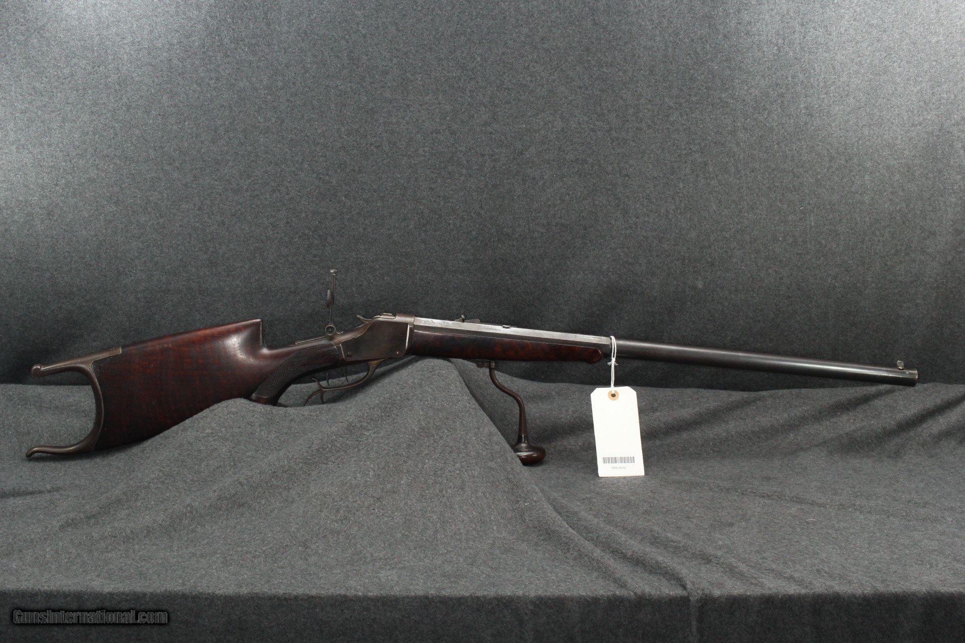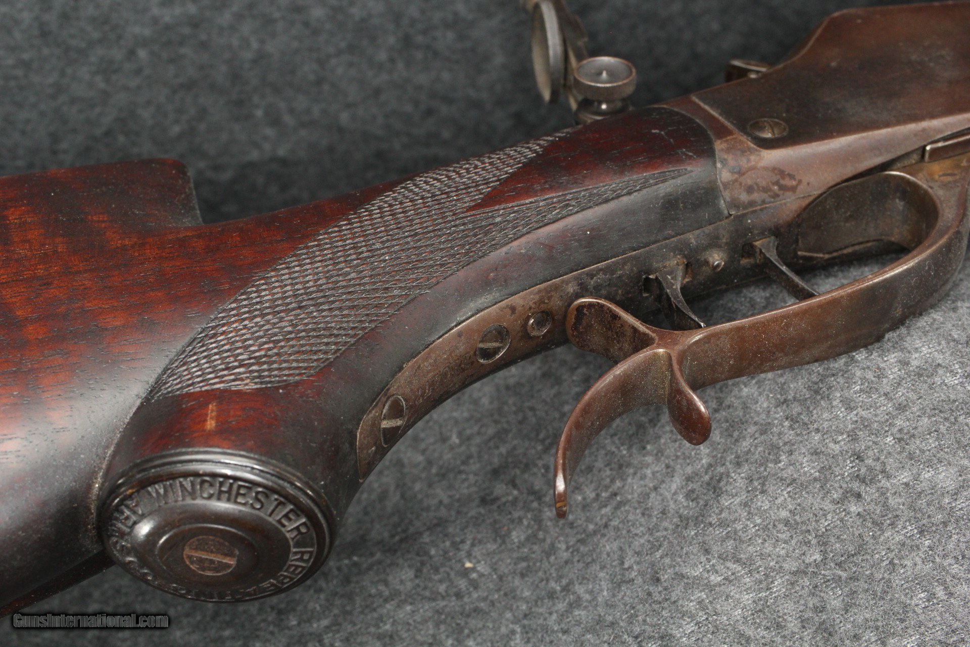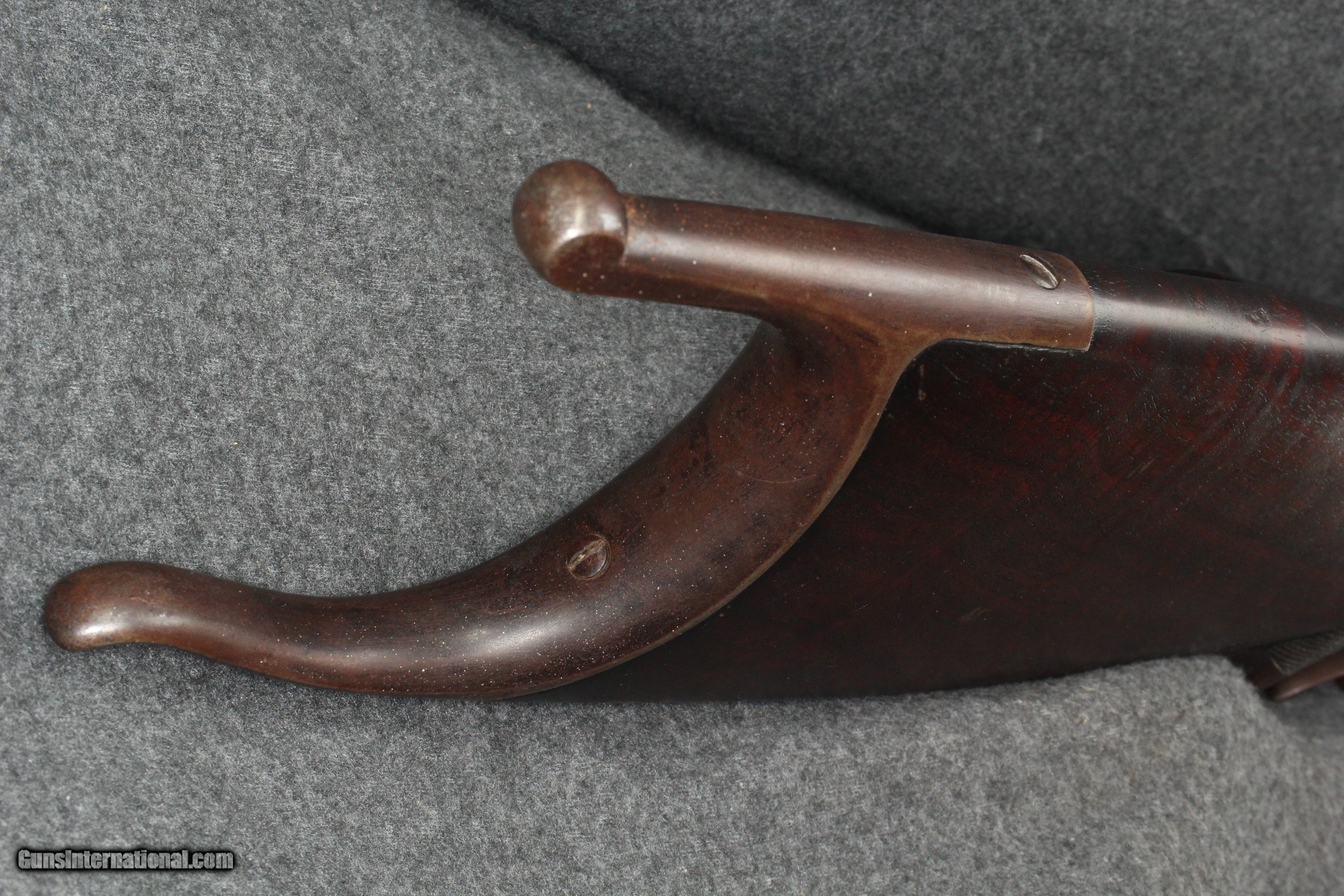 Description: 22lr, serial number 1104XX. Mfg date 1919. Schutzen-style rifle. 27 7/8" barrel. Barrel has been set back and take down feature removed. Barrel shows high percentage plumb blue, receiver shows thinning and plumbing blue, 80%. Correct trigger guard for set trigger, off-hand configuration. Tang sight possiby original Winchester. Forend modified for barrel altertion. Mechanically sound, crisp. Set trigger functions correctly. Bore is good, shows slight wear, minor frosting. Schutzen-pattern stock with right hand cheekpiece. Checkered pistol grip. Winchester grip cap. Sound wood, excellent overall. Buttplate tang stands proud in places. More photos on request. Please contact us for shipping/insurance cost. Weighs 12.5 lbs. SOLD Curio/Relic: Yes Rifle Caliber: .22 Long Rifle |