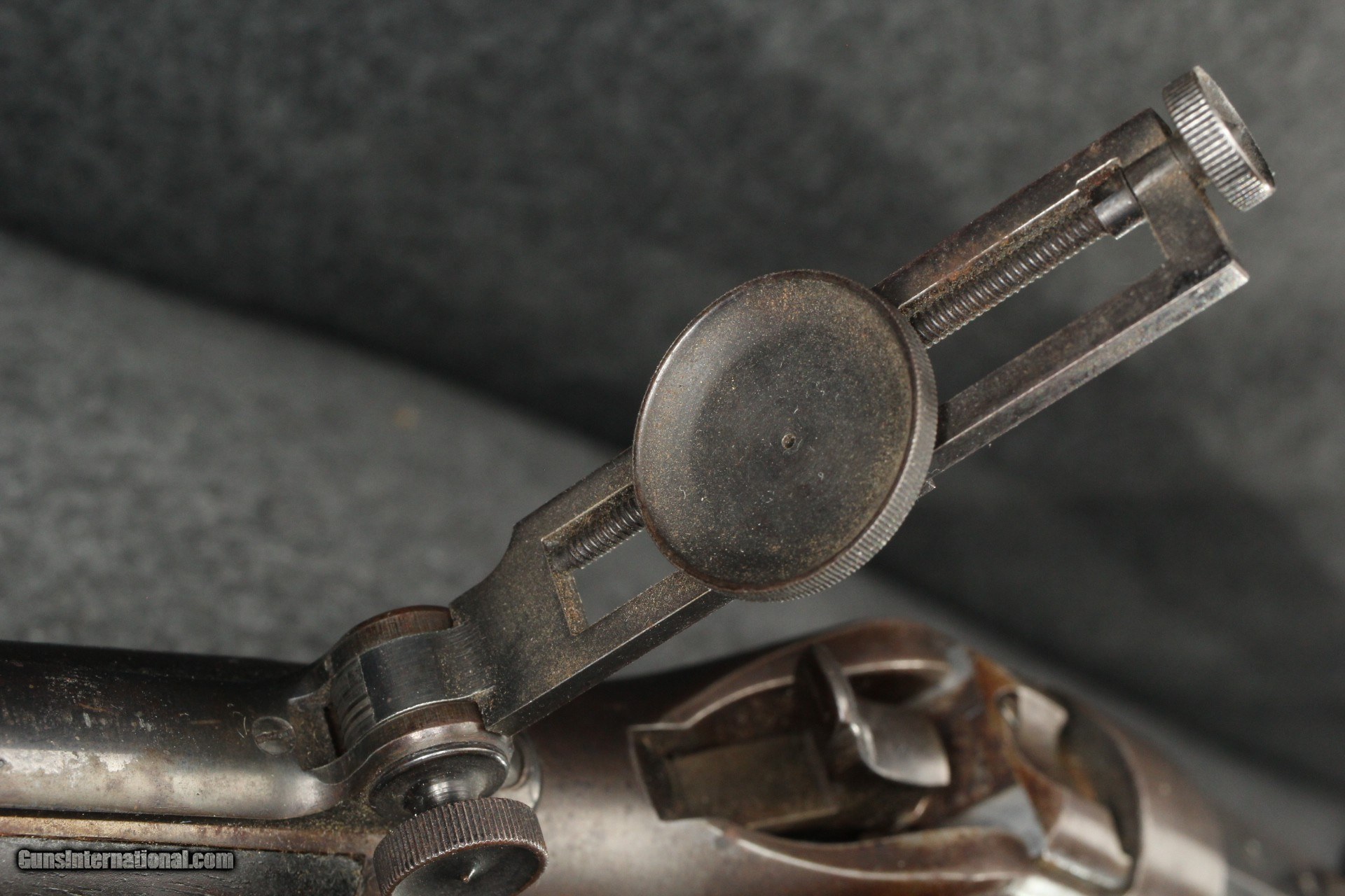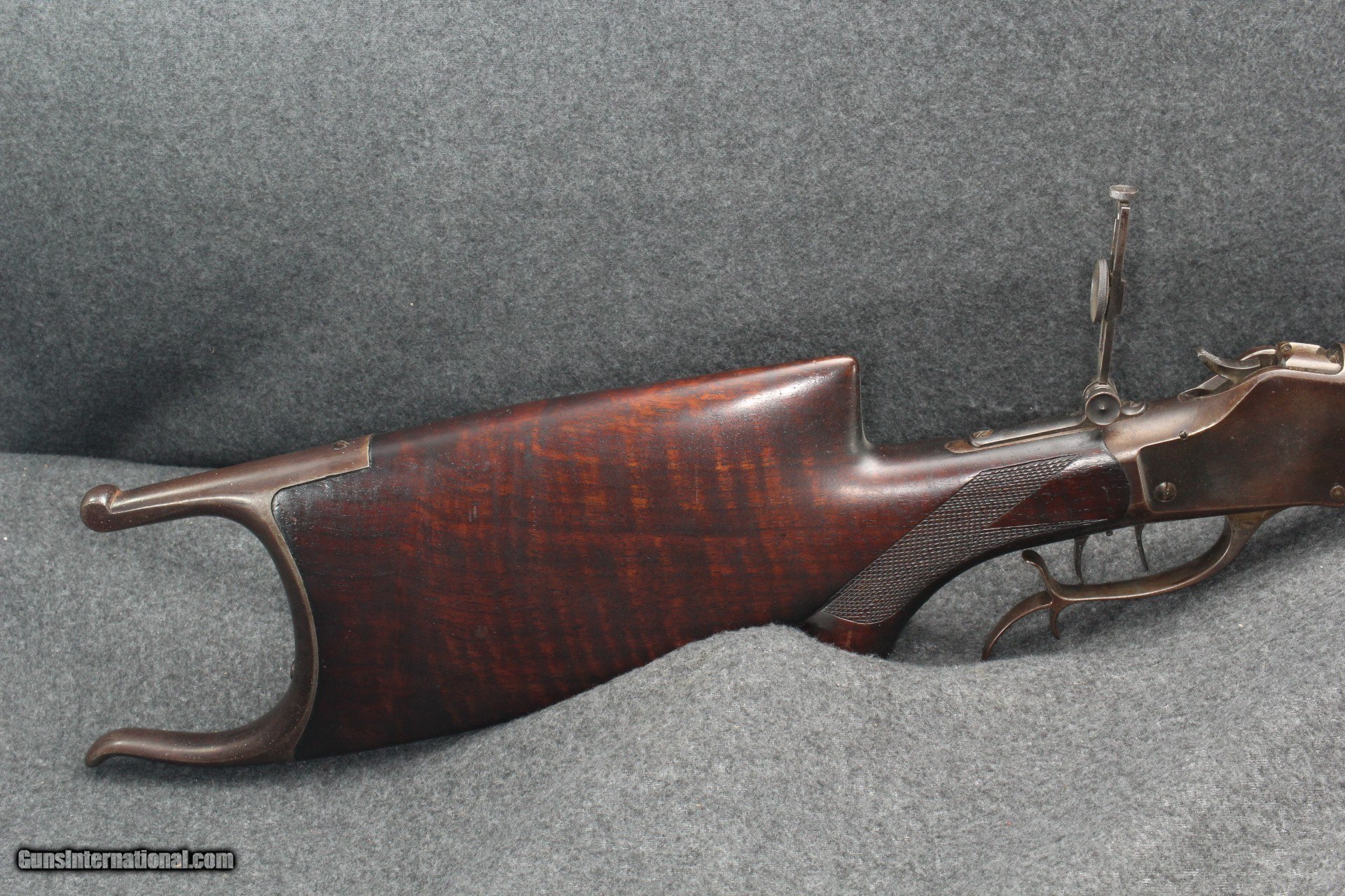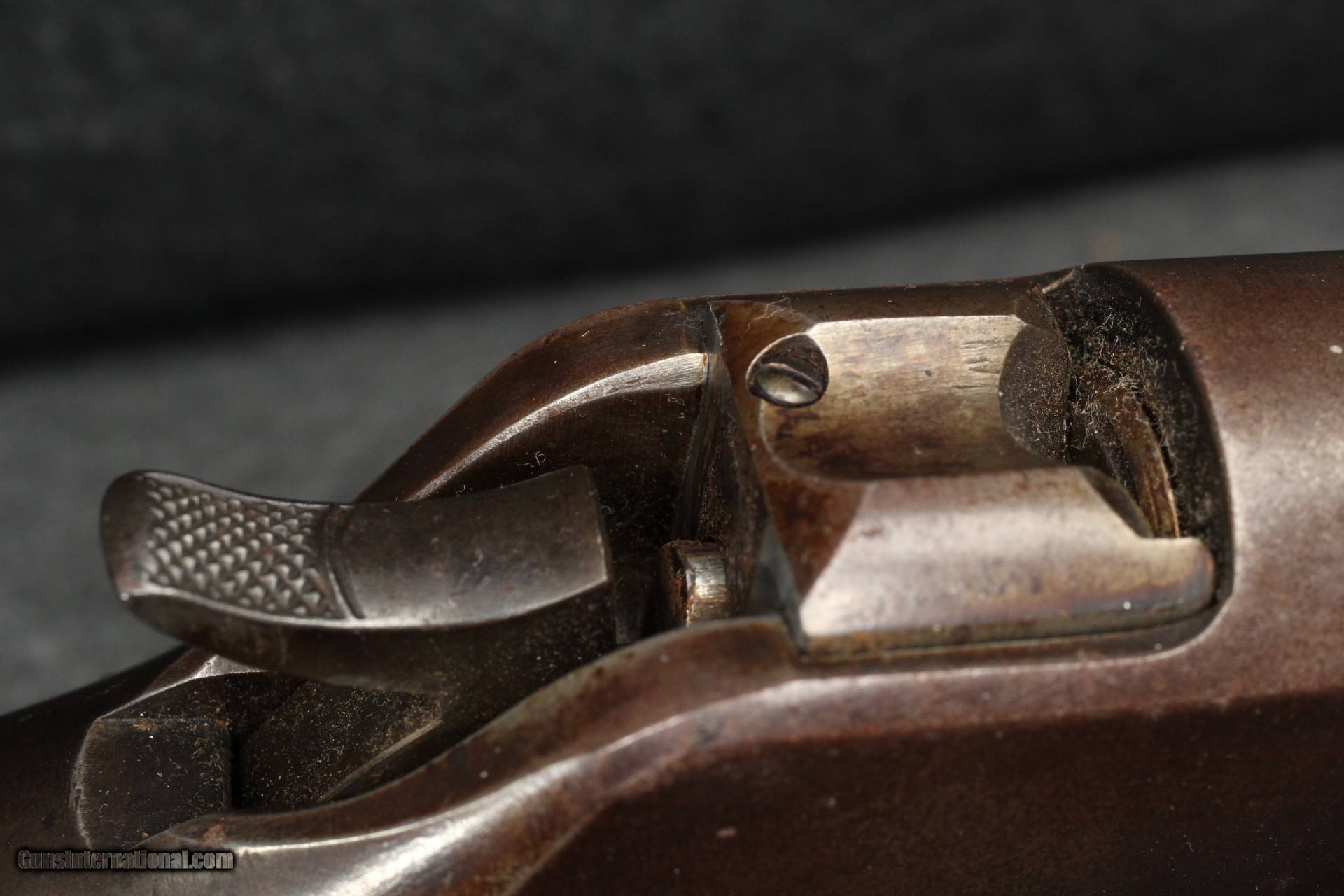 Description: 22lr, serial number 1104XX. Mfg date 1919. Schutzen-style rifle. 27 7/8" barrel. Barrel has been set back and take down feature removed. Barrel shows high percentage plumb blue, receiver shows thinning and plumbing blue, 80%. Correct trigger guard for set trigger, off-hand configuration. Tang sight possiby original Winchester. Forend modified for barrel altertion. Mechanically sound, crisp. Set trigger functions correctly. Bore is good, shows slight wear, minor frosting. Schutzen-pattern stock with right hand cheekpiece. Checkered pistol grip. Winchester grip cap. Sound wood, excellent overall. Buttplate tang stands proud in places. More photos on request. Please contact us for shipping/insurance cost. Weighs 12.5 lbs. SOLD Curio/Relic: Yes Rifle Caliber: .22 Long Rifle |