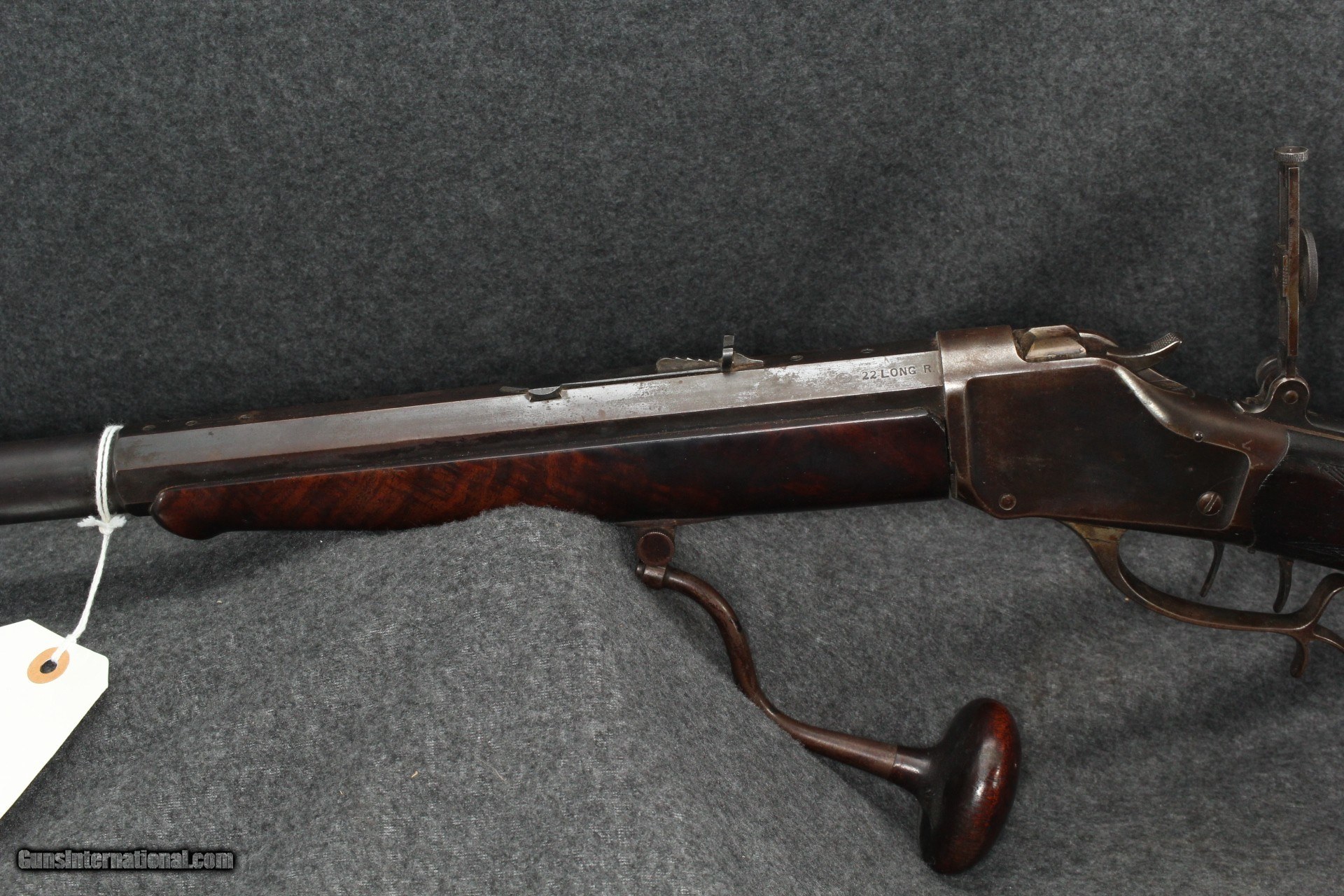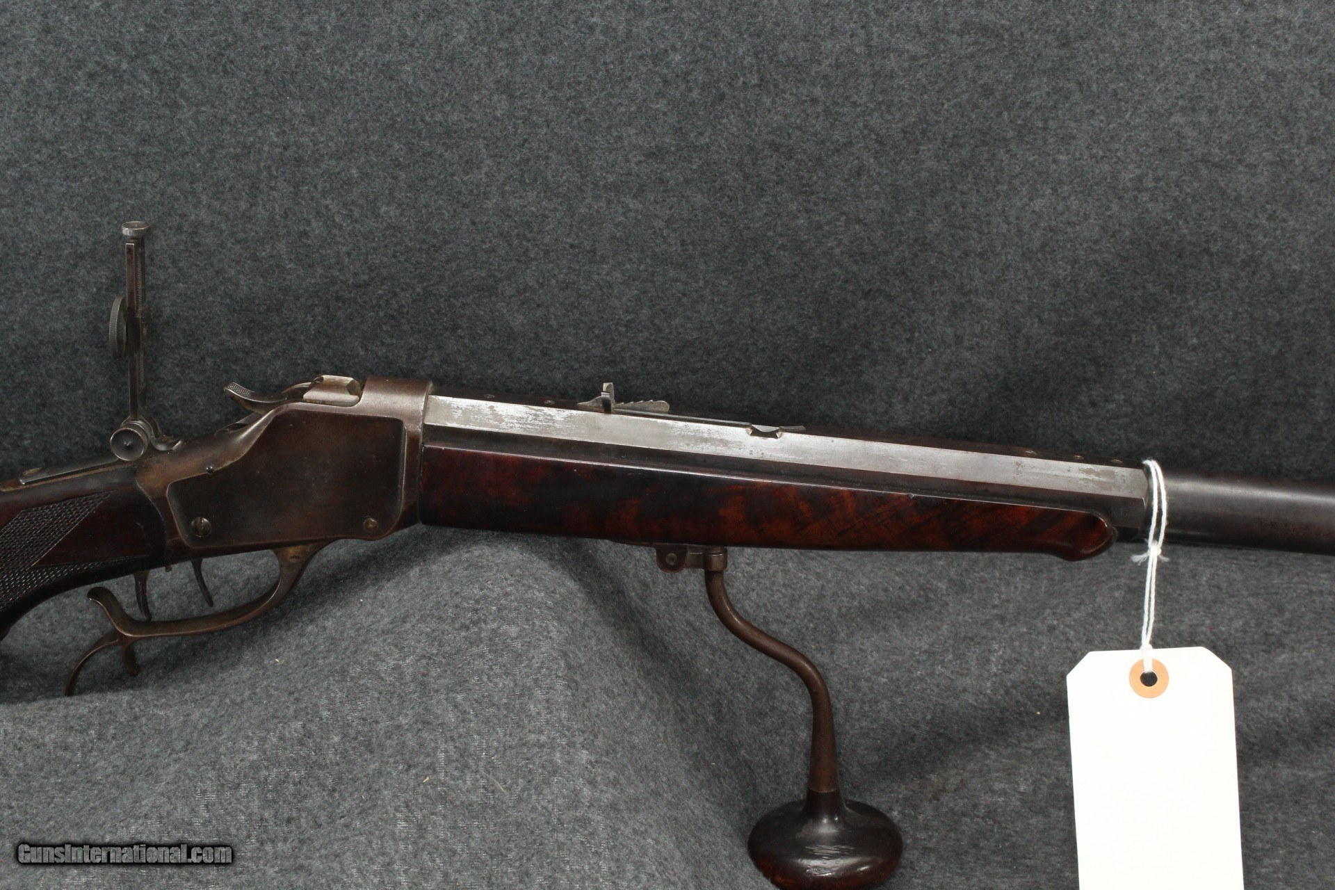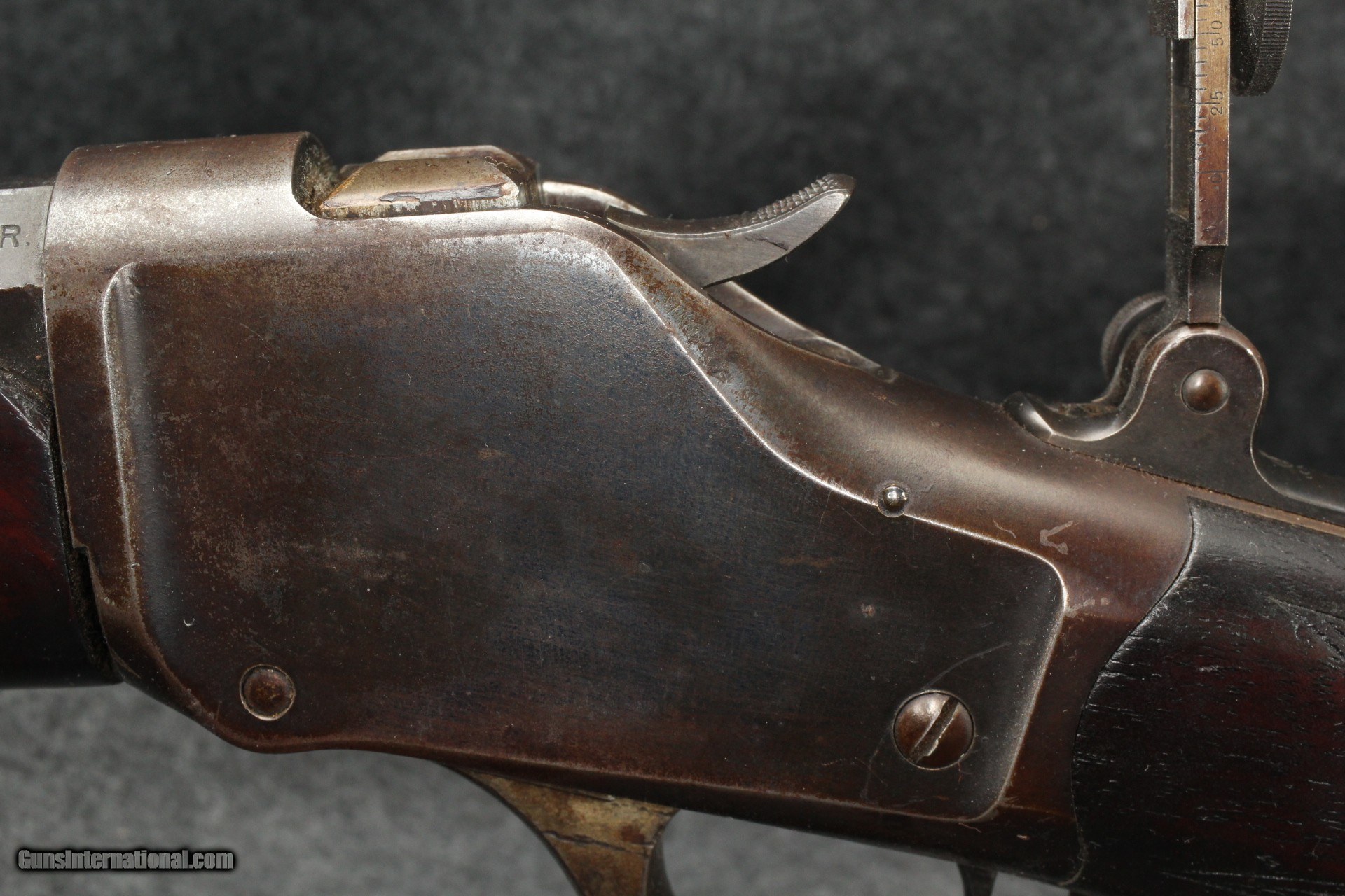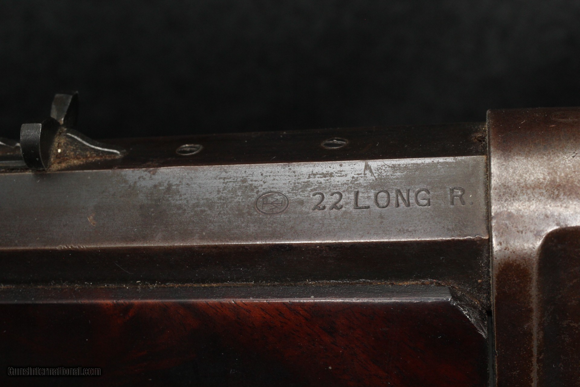 Description: 22lr, serial number 1104XX. Mfg date 1919. Schutzen-style rifle. 27 7/8" barrel. Barrel has been set back and take down feature removed. Barrel shows high percentage plumb blue, receiver shows thinning and plumbing blue, 80%. Correct trigger guard for set trigger, off-hand configuration. Tang sight possiby original Winchester. Forend modified for barrel altertion. Mechanically sound, crisp. Set trigger functions correctly. Bore is good, shows slight wear, minor frosting. Schutzen-pattern stock with right hand cheekpiece. Checkered pistol grip. Winchester grip cap. Sound wood, excellent overall. Buttplate tang stands proud in places. More photos on request. Please contact us for shipping/insurance cost. Weighs 12.5 lbs. SOLD Curio/Relic: Yes Rifle Caliber: .22 Long Rifle |
