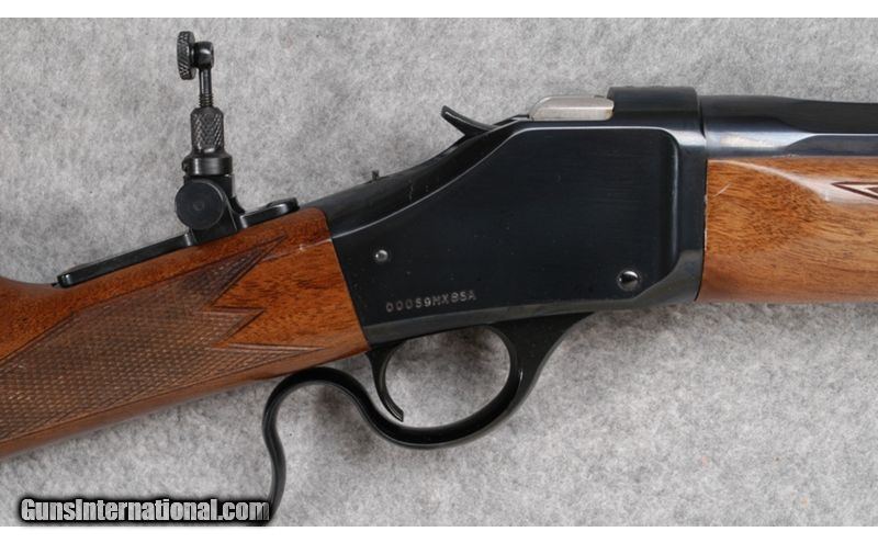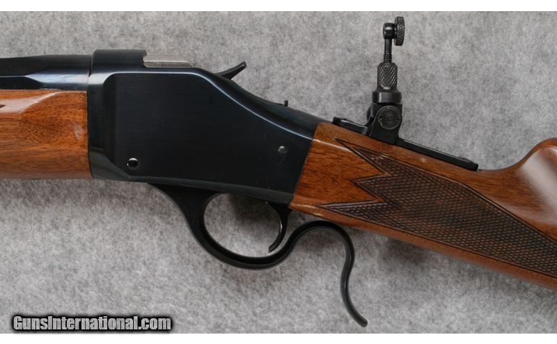 Description: .45-70 Government SOLD Chambers: Single shot falling block. Metal Condition: Very good, some scratches. Wood Condition: Very good, some scratches and dings. Bore Condition: Very good. Barrels: 28"", blued. Triggers: Single. Stock Dimensions: 13 1/2" LOP. Fore End: Matching checkered walnut. Butt Pad: Factory crescent. Weight: 8 Lbs. 6 Ozs. Sights: Factory iron and peep sights. Item Location: Dundee, MI |
