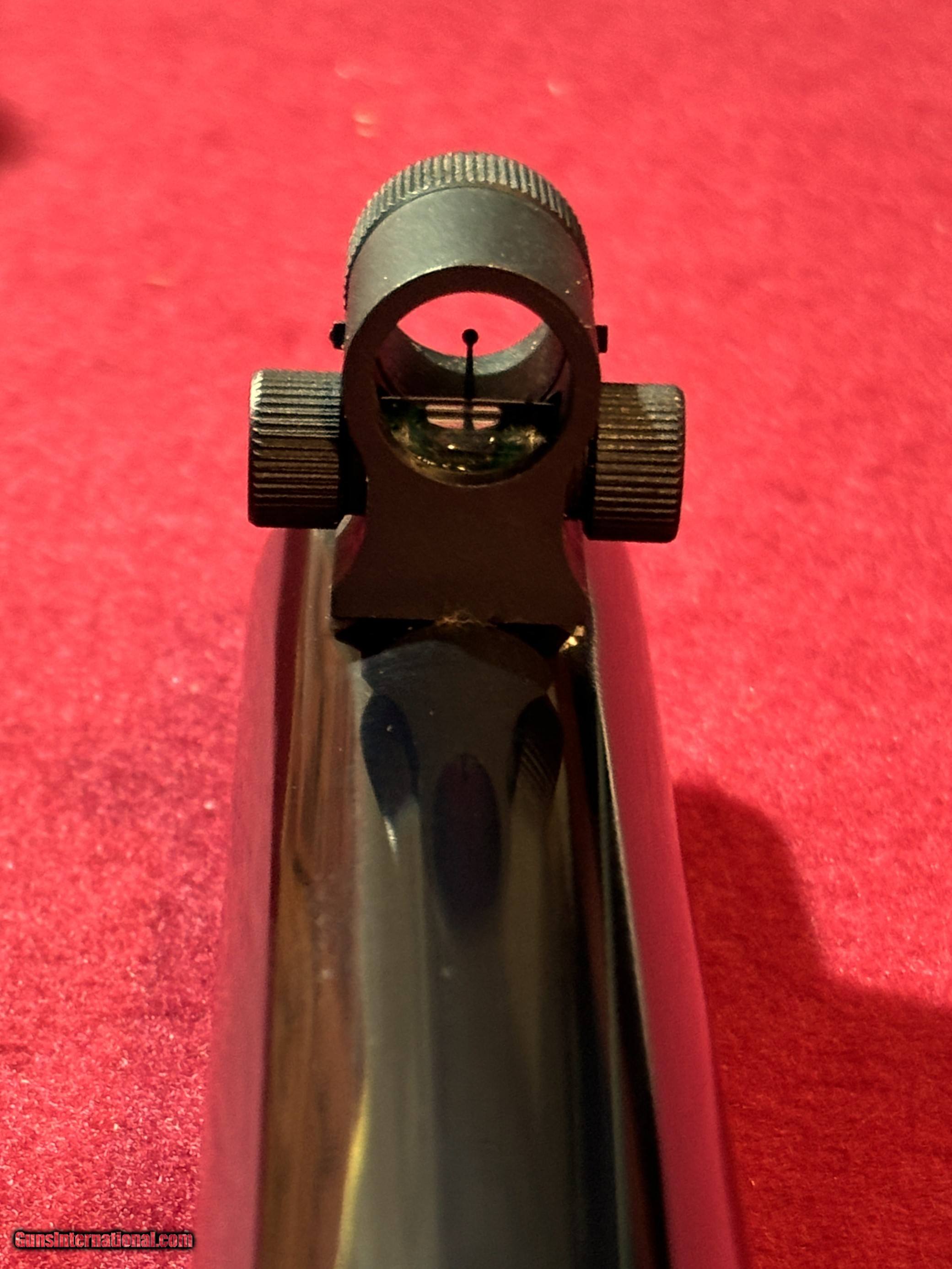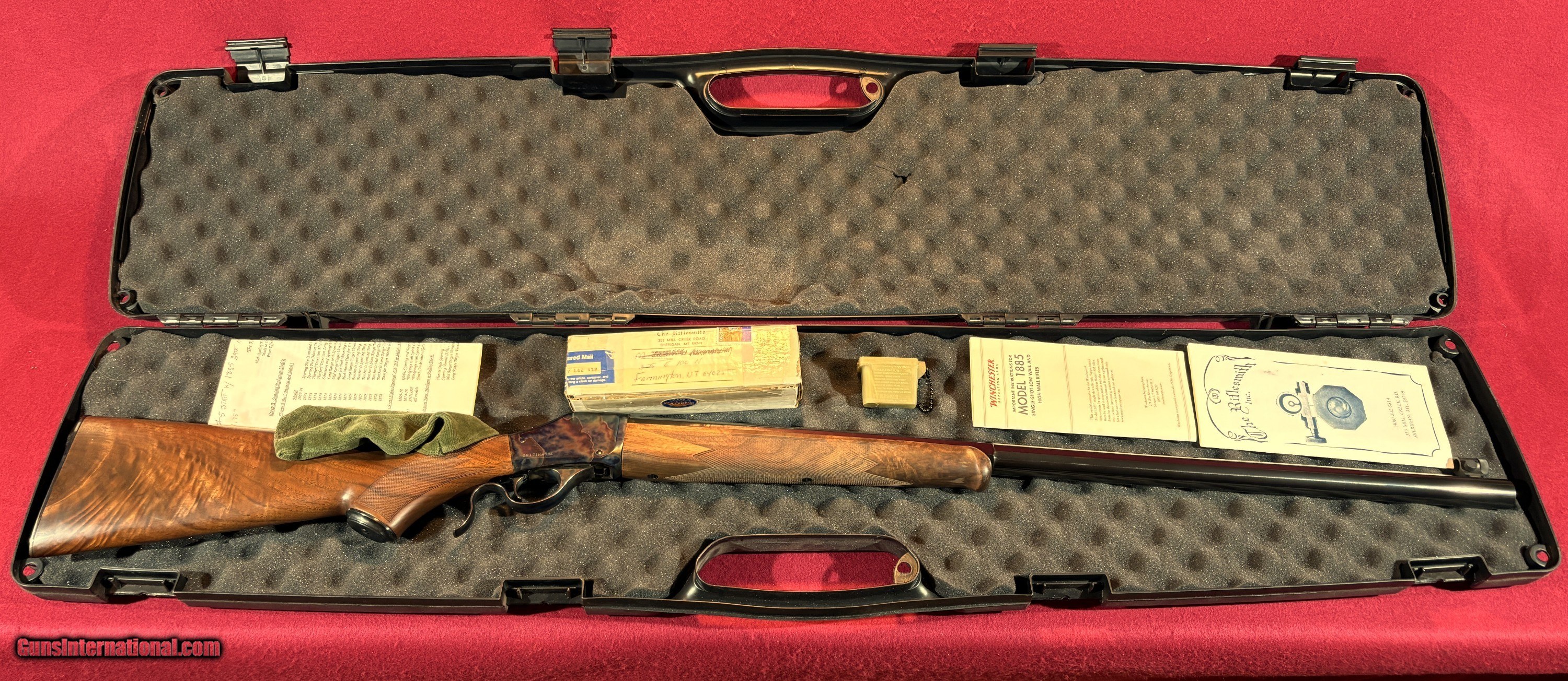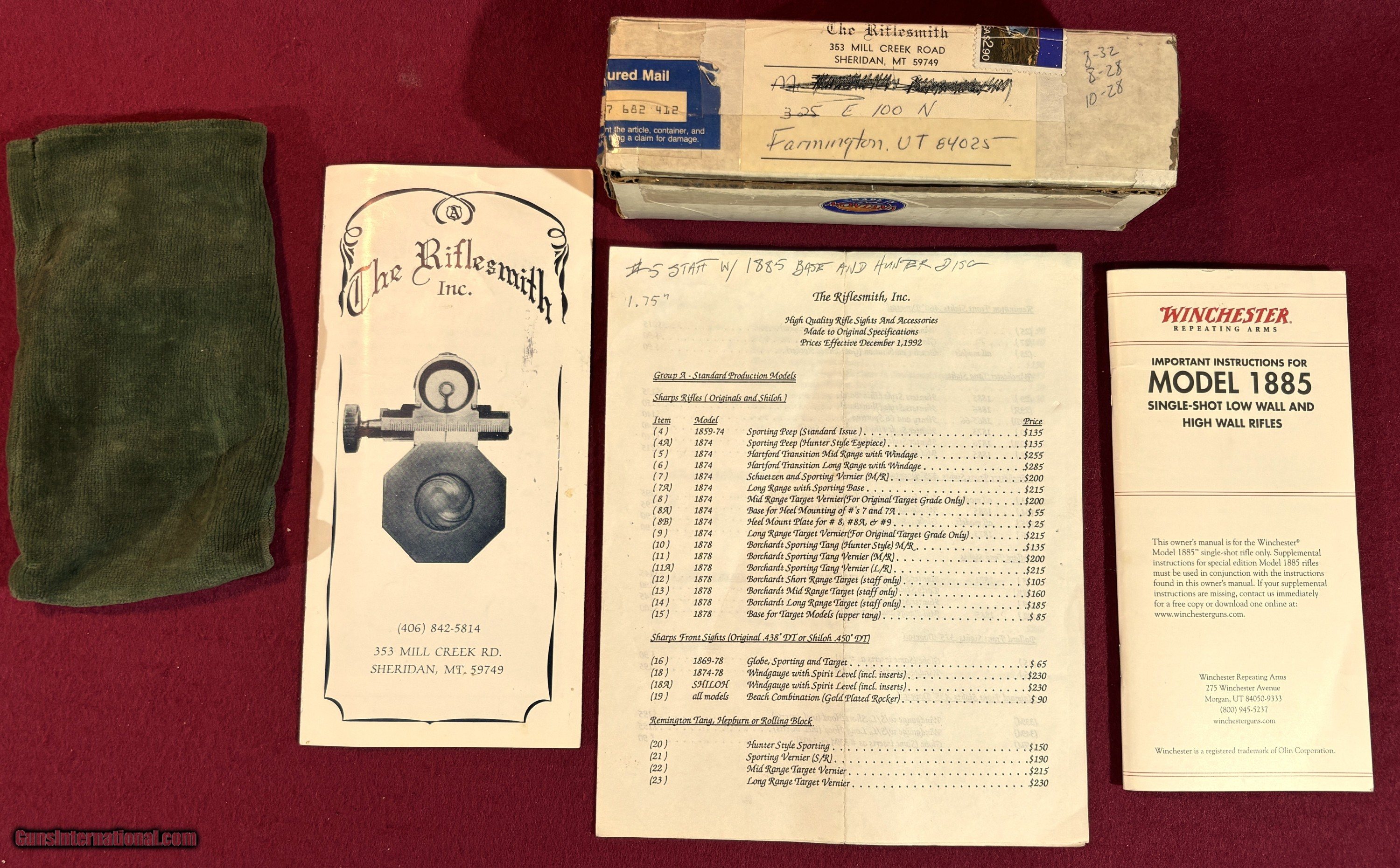Description: Beautiful BPCA Winchester 1885 Limited Series Target Rifle in 45-70 Govt. Chambering. Winchester produced these 1885 BPCA rifles in 2009-2010 I believe. The first one I saw was at the Shot Show. It is very similar to the Browning 1885, but has a polished barrel and case colored receiver, lever, buttpalte and grip cap. The Barrel is half round, half octagon. The Winchester 1885 BPCA rifle came without sights and the original owner had "The Riflesmith" sights installed. These look to be high quality sights. The front sight is windage adjustable and has a spirit level. The rear sight is a long range sight, adjustable for windage and elevation, and has a upgraded eyecup with several aperature sizes. I believe that The Riflesmith went out of business and was bought by Axtell, in Sheridan, Wyoming.This rifle is in excellent condition and had seen very little use. It has a nicely figured, checkered walnut stock with a low gloss finish that looks great with the bright bluing of the barrel and case coloring of the receiver. The bore looks perfect, although a little dusty, and the recessed crown is nice and crisp with no dings. The rifle comes with a hard case, owners manual, sight information, and extra parts for the sights. Please look closely at the pictures, they tell the story. Thanks for looking! Buyer pays Insurance and Shipping charges. TERMS – PLEASE READ; PAYMENT - I can accept money orders, cashier’s checks, bank checks, or personal checks (pending verification of funds). Payments via USPS & UPS are acceptable. My FFL dealer (Dixie Gun & Fish) securely packs and ships each firearm, following all firearms laws, and will include a signed copy of their FFL with each firearm shipped. No private sales on firearms! SAFETY WARNING- Buyer is solely responsible for determining that a used gun is safe to shoot. The firearms offered may or may not have been test fired and some have been only visually inspected. It is a requirement that every used firearm is inspected by a qualified gunsmith before firing. The buyer agrees to hold seller harmless against damages, injury, or death caused by defective merchandise. RETURN POLICY- All firearms come with a 3-day non firing, no-tinkering with (turning screws, taking apart, removing parts, scoping. firing, cleaning or altering in any way) inspection/return privilege. Inspection is based on a visual review of the firearm to confirm that it is in the condition stated. In the case of a return, the buyer pays all shipping charges & if paid for with a credit card, the buyer absorbs the 3% credit card charges. Please ask questions. I appreciate your interest, and I thank you for your consideration. SOLD Rifle Caliber: .45-70 Government Manufacturer: Winchester Model: 1885 BPCA Target Rifle Serial Number: 00101MN85K Barrel Length: 30 Inches Condition: Excellent Metal Condition: Excellent Wood Condition: Excellent Bore Condition: Excellent Action: Single Shot Drop Block Lever Triggers: single Stock: Deluxe Checkered Fancy Walnut Butt Pad: Steel Buttplate Finish: Blue Weight: 10 pounds 8 ounces W/O Sights Sights: Rear Tang, Front Globe Manufacture Date: 2009-2010 Case: Hard Case |