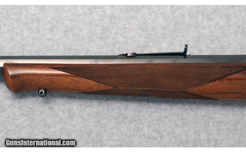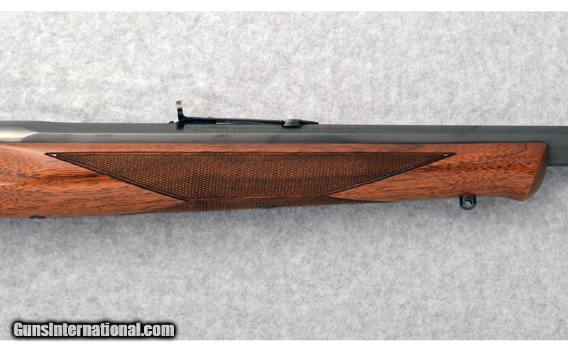 Description: .45-70 Government SOLD Metal Condition: Excellent Wood Condition: Excellent Bore Condition: Excellent Barrels: Gloss blued 24" tapered octagonal barrel. Triggers: Grooved Butt Pad: Decelerator by Pachmayr. Weight: 7.80 lbs. Sights: "Tang mounted peep sight. Beaded blade front, leaf rear. Item Location: Oklahoma City, OK |