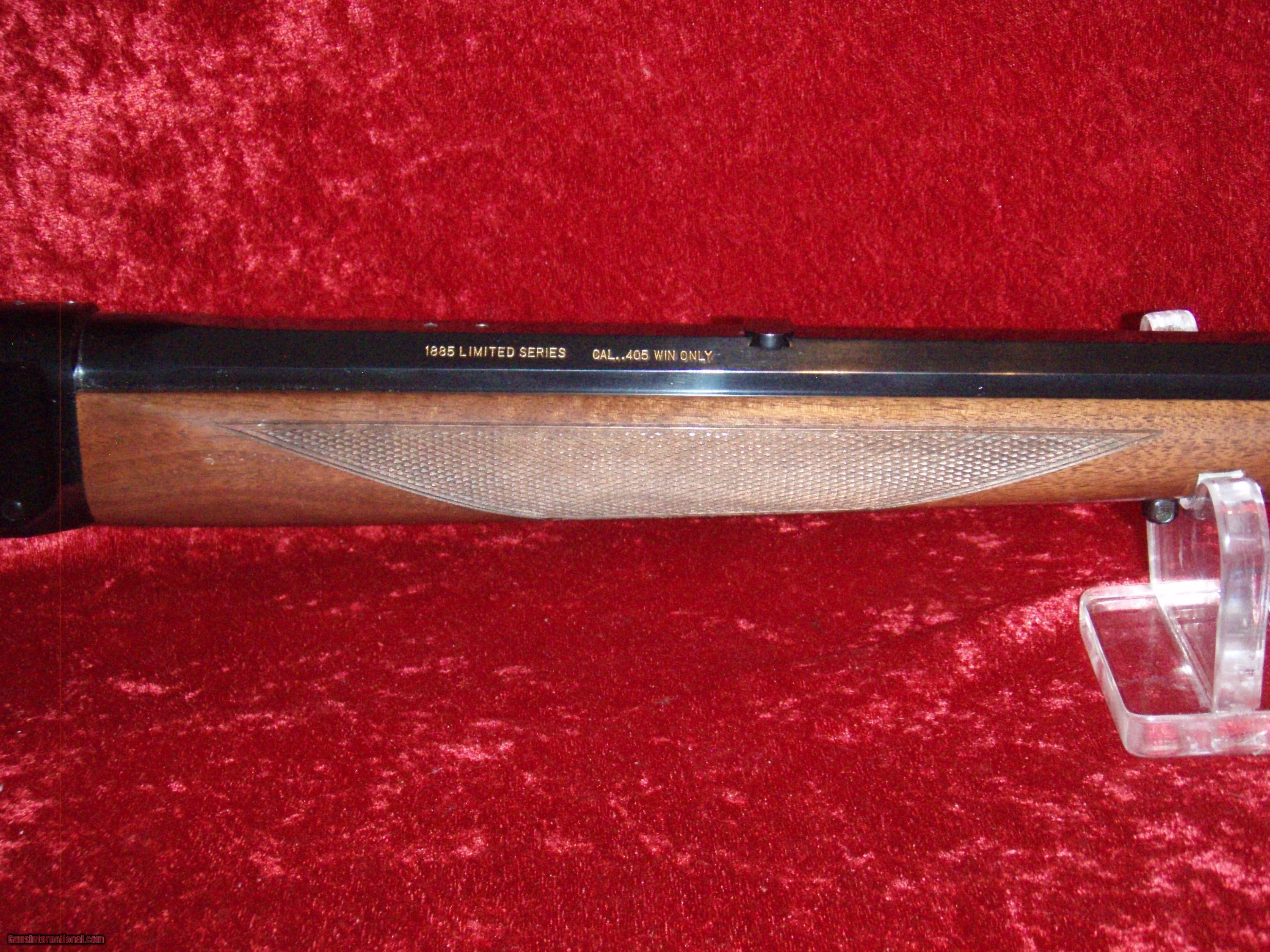 Description: Winchester 1885 LTD-Series .405 Win. 28" bbl New in Box -- Unfired condition This is a NIB unfired Winchester 1885 Limited Series Single Shot Rifle in .405 win cal. 28" octagon barrel. Comes in the orignal box with the black Limited Series sleeve. This gun has been in a safe and shows one light handling mark on the forearm, and a small spot of surface rust on the butt plate. Please see pictures. Rest of the metal is in new condition with a bright shiny bore.
