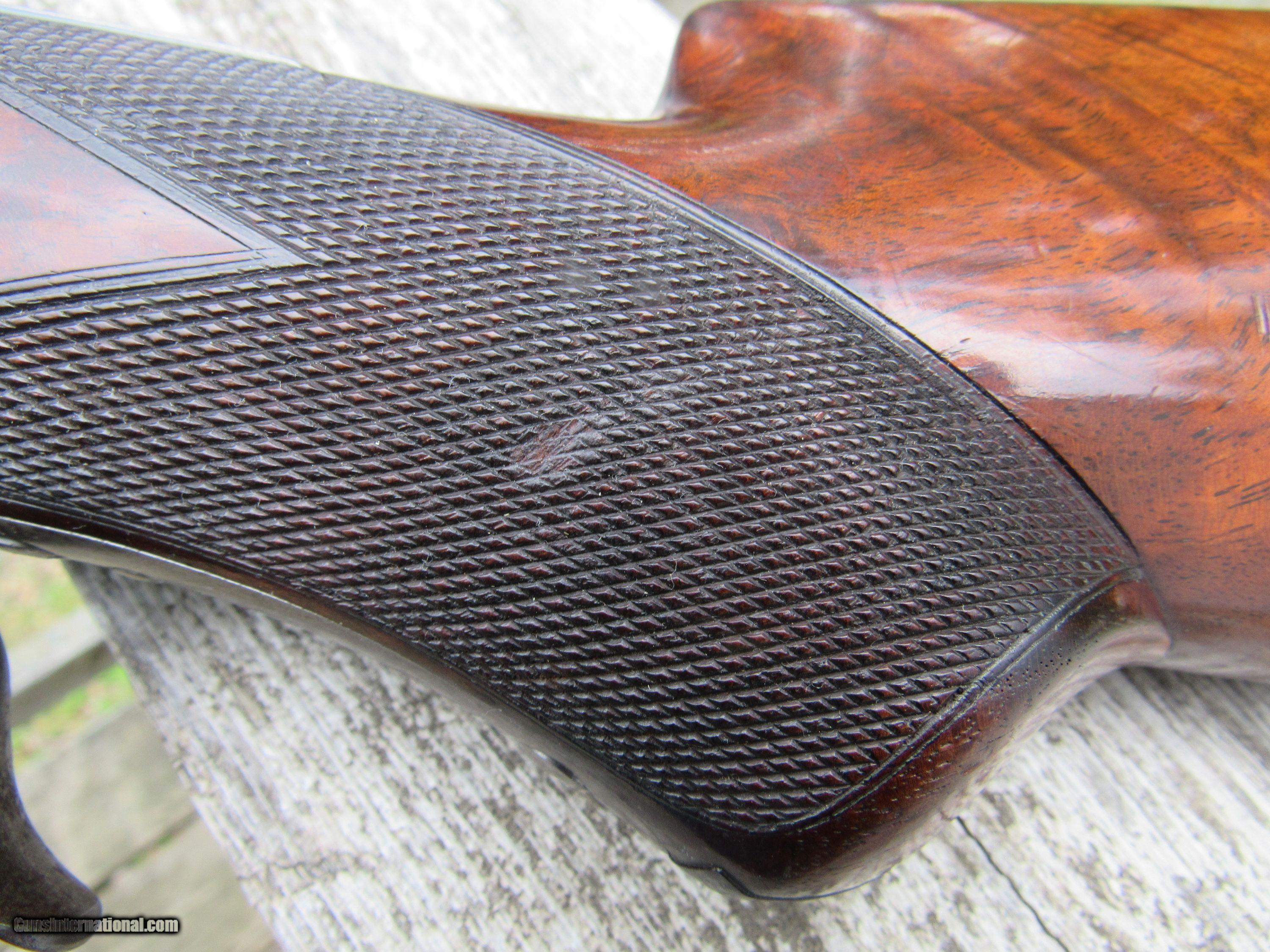 Description: This is a very handsome Deluxe Hi Wall Winchester 1885 in 22 WCF caliber. A copy of the Cody museum info sheet is included. Serial #35562, made in 1889. The bore is very good. It has very beautiful burl walnut stocks with checkering. The barrel has a few marks from someone using their Winchester hatchet to put in the sight blank. Has a Lyman tang sight and Winchester front target sight. The rifle has a single set trigger. The trigger has tension, but doesn't seem to set. It fires when the trigger is pulled. SOLD Antique: Yes |