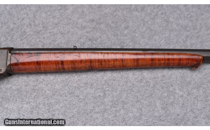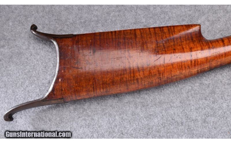 Description: Receiver shows some remaining case color with some tool marks on both sides. Barrel blue has turned mostly brown patina. Bore is bright and excellent. Handmade stock and forend show light use marks. Buttstock is fitted with hand forged Swiss style buttplate. Mechanical function remains excellent. Front sight has been removed and tang mounted aperture is included. Rear sight dovetail has been fitted with a small spirit-level. Antique ~ No FFL required! SOLD Manufacturer: S/N 80XXX Caliber Info: .32-40 Metal Condition: Fair Wood Condition: Fair Bore Condition: Excellent Barrels: 30" Heavy Octagon - #3 Contour Triggers: Original - Non-Set Stock: Uncheckered - Straight Grip Stock Dimensions: 13" LOP Fore End: Uncheckered Butt Pad: Hand Forged Swiss Style Weight: 10 1/2 LB Sights: Front Sight Removed - Tang Mounted Rear - Spirit Level in Rear Dovetail Item Location: Wheeling, WV |
