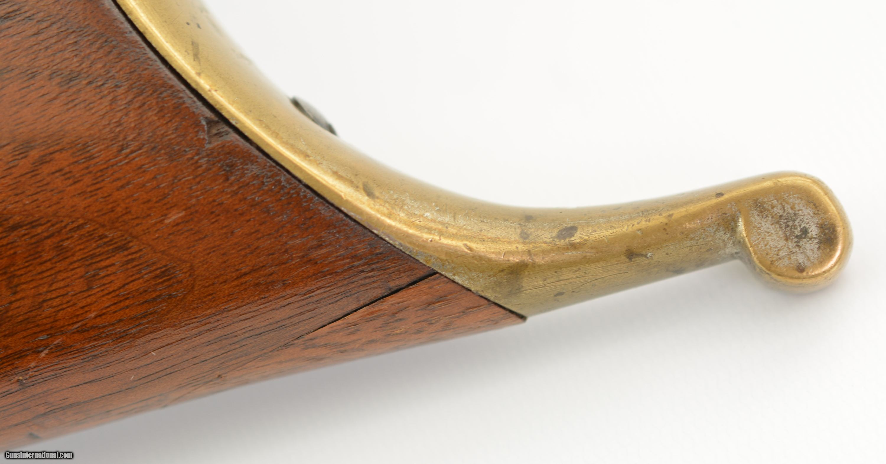 Description: Serial #33496, .38-55, 32" heavy target barrel with an excellent, bright bore. This is an 1889 made rifle, rebarreled with a Winchester No. 4 barrel at some point in its life. The barrel retains about 80-85% of the original blue, with the balance streaked to a dark plum-blue patina with silvering along the edges and projections. The barrel has a spirit level front target sight installed, and a filled dovetail near the breech. The frame has an overall pewter gray patina that carries over onto the underlever as well. The tang has a flip-up Vernier sight, and a non-original single-set trigger is fitted. The forend is in fine condition with only some minor handling marks and small blemishes in the original varnish finish, and the buttstock (which appears to be original) was modified to accept a hooked, schutzen style buttplate. The wood is in very good shape, but does have a repaired chip at the toe. The accompanying data sheet states that the rifle was originally chambered in .32-40 with a No. 3 octagon barrel, and that it was equipped with a plain trigger. This is nevertheless a very nice High Wall, chambered in a great caliber, and rates very good-fine condition overall. Antique SOLD Antique: Yes Manufacturer: Winchester Model: 1885 Serial Number: 33496 Caliber Info: .38-55 Gauge Info: .38-55 |