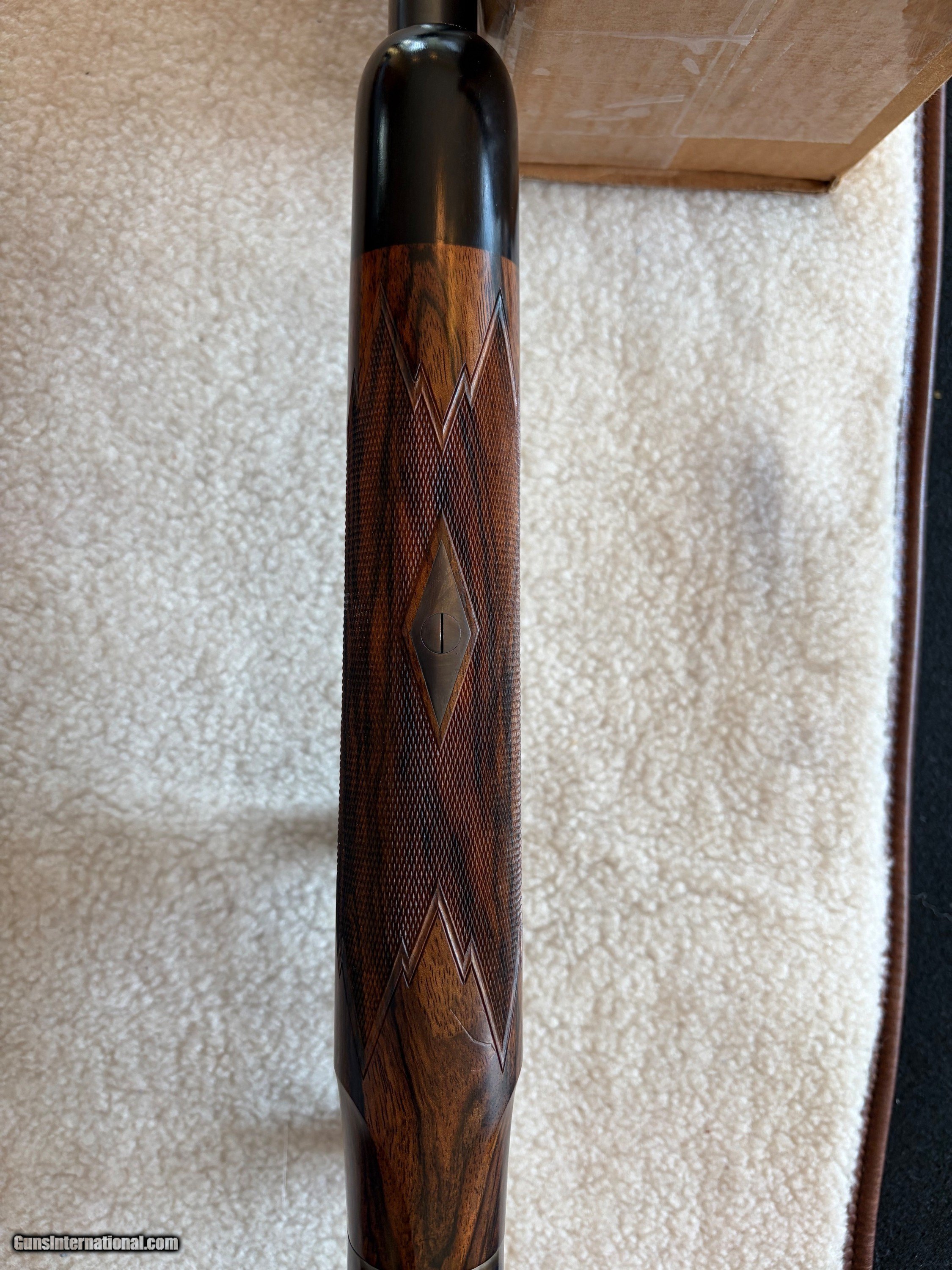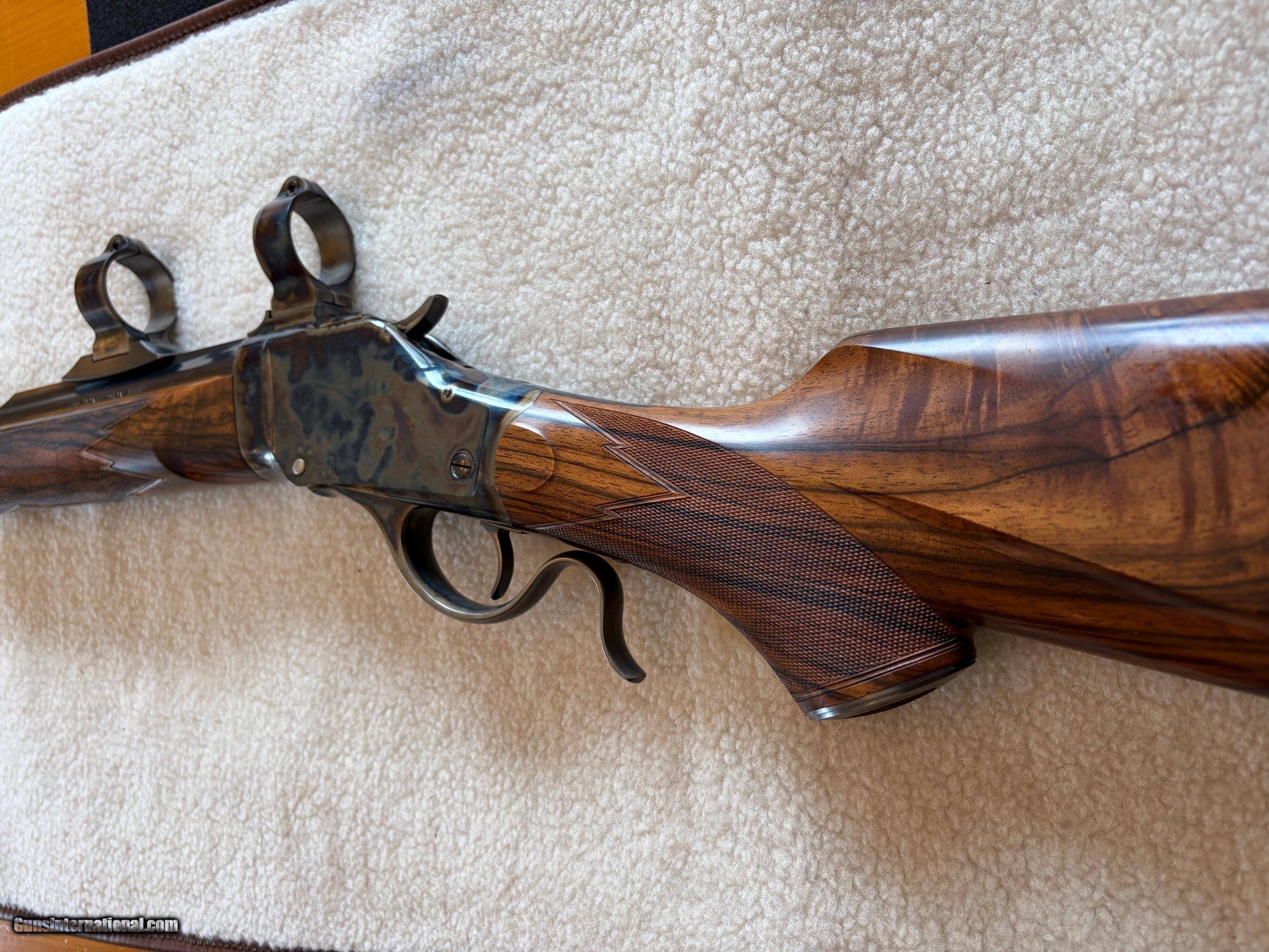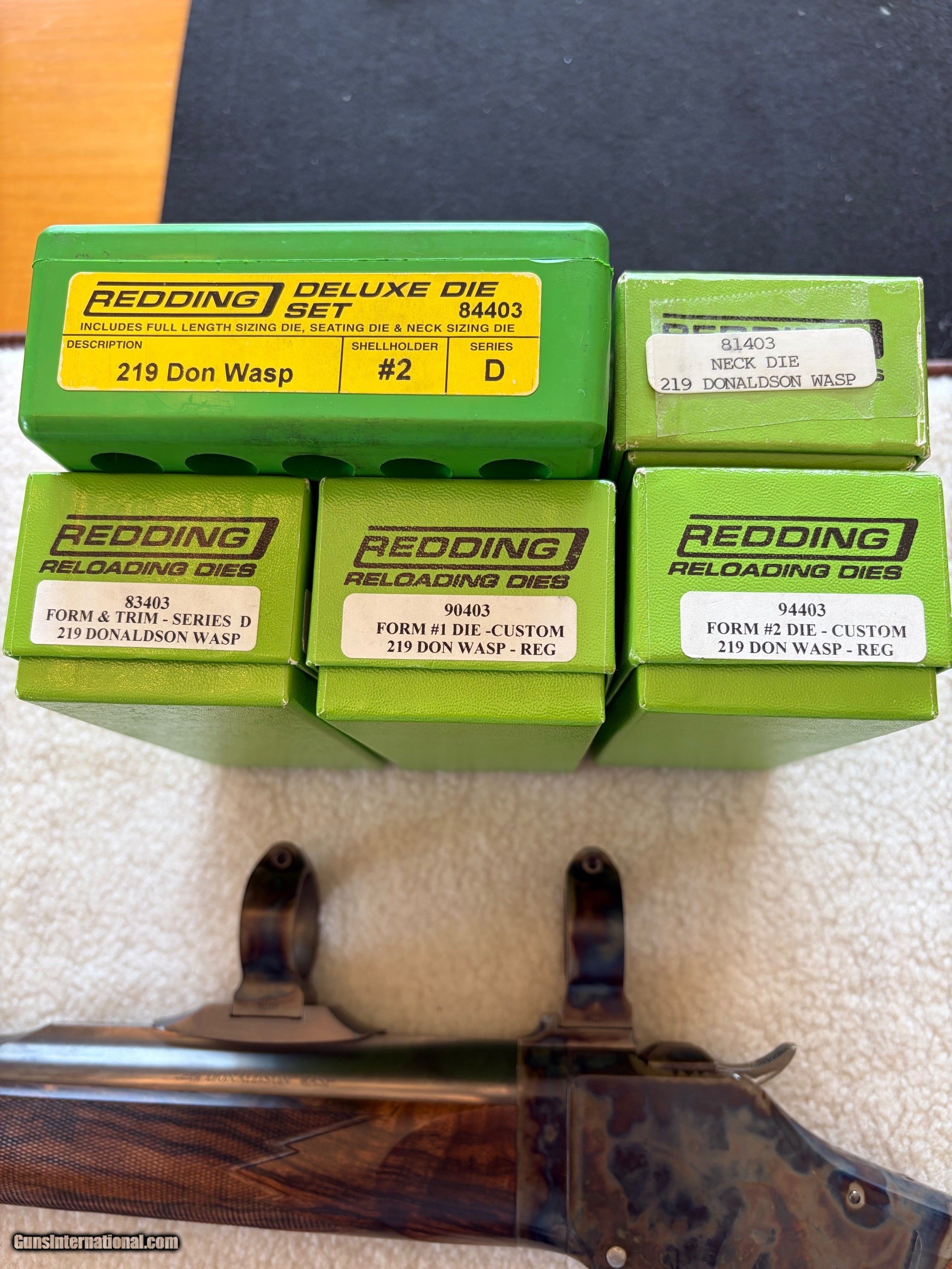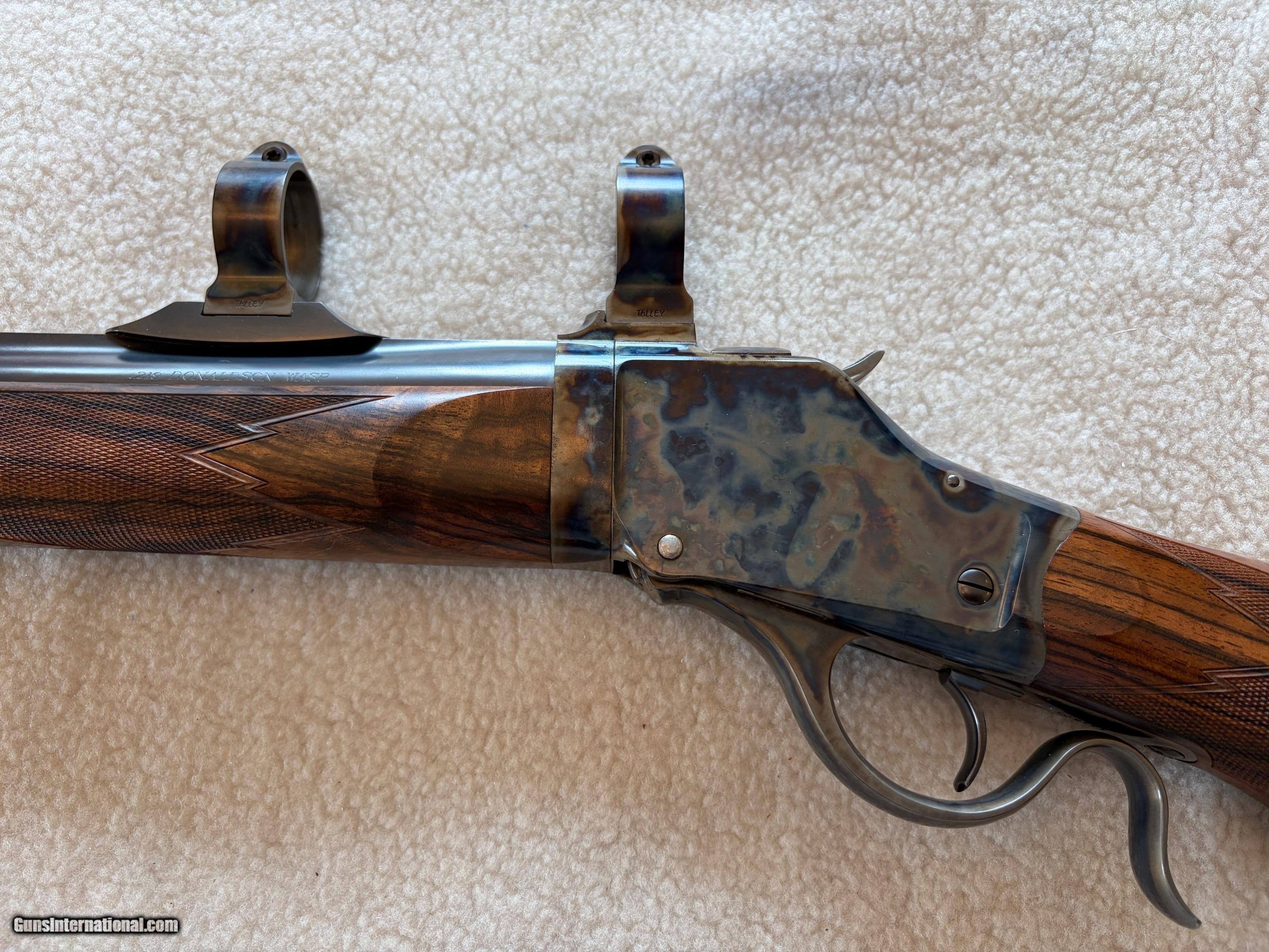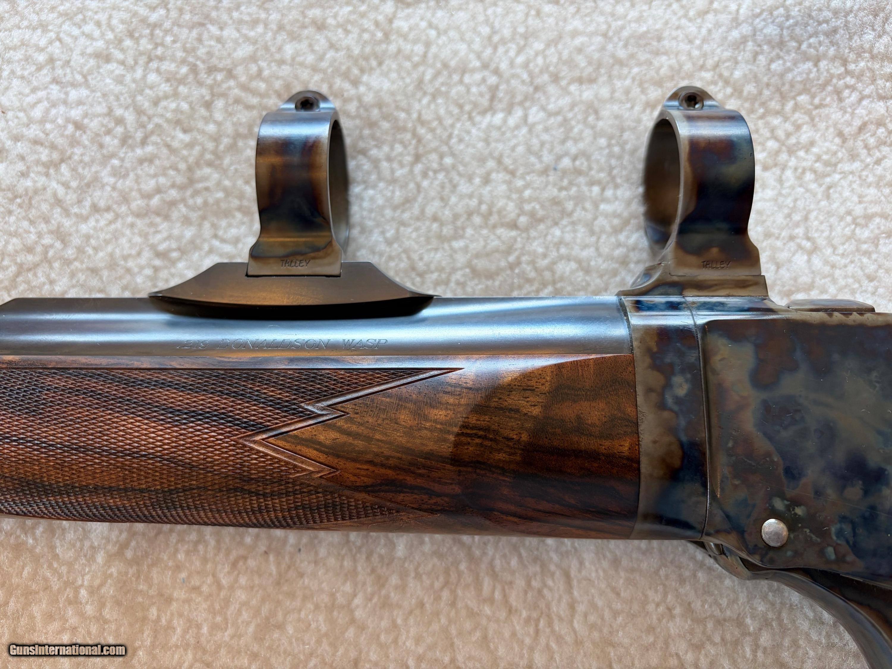 Description: The ultimate custom Highwall. If you love the old school varmint rifles this modern offering will surely please. built on a original Winchester 1885 action by two masters of the trade, R.J.Snapp and J.C.Tucker. 25 3/4" barrel chambered in the venerable 219 Donaldson wasp along with an integral 1/4 rib and islands to mount custom Talley case colored 30mm rings beautifully rust blued. Metal and stock work have been perfectly executed. Action case coloring is bright and colorful. 4x plus English Walnut finished in oil. included are reloading and forming dies and 169 formed cases ready to go. Cases are easily formed from 30/30 brass. original shop notes and photos showing progress during the build. Rifle weighs 8lb 1oz. Please call or write with questions. $10,500 Shipping and or insurance are to be determined. I am not a dealer but will assist your FFL and my local dealer with shipping. Rifle Caliber: .219 Donaldson Wasp Price: $10,500.00 Buy Now Contact Seller |
