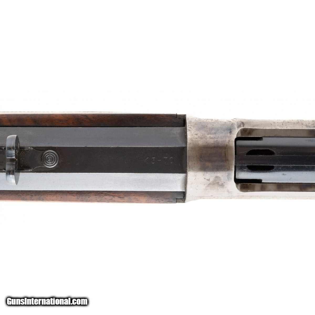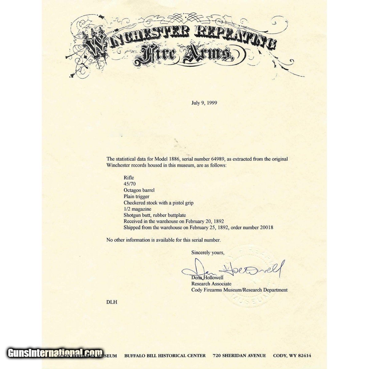 Description: "Serial number 64989. Made in 1892. 45-70 caliber with a 26" barrel. This is a factory special order deluxe with several special order features. The wood is pistol grip and checkered high grade 3X wood and a half magazine. Beautiful gun in excellent condition. Barrel has 97% of the original blue. The frame has excellent bright case colors that rate around 70%. Wood is excellent. This gun comes with a factory letter confirming all features. Beautiful Deluxe Winchester 1886 Rifle! SOLD Antique: Yes |