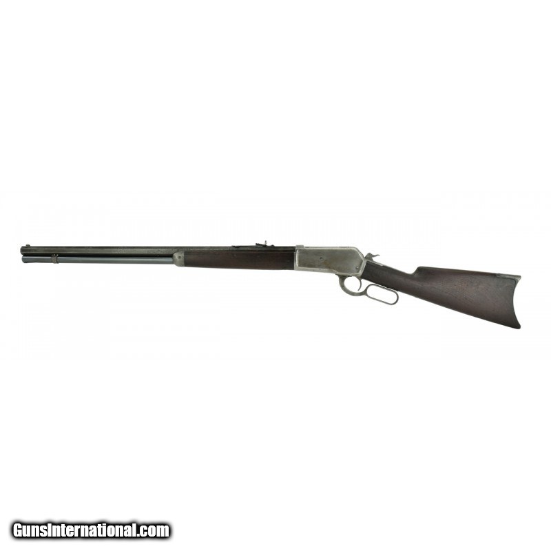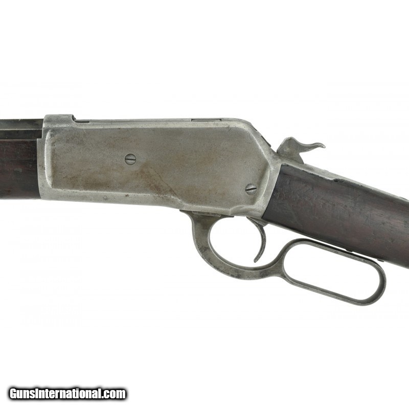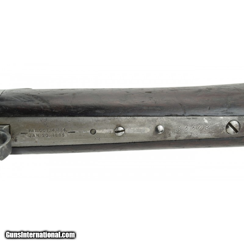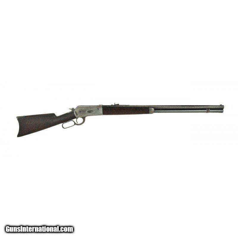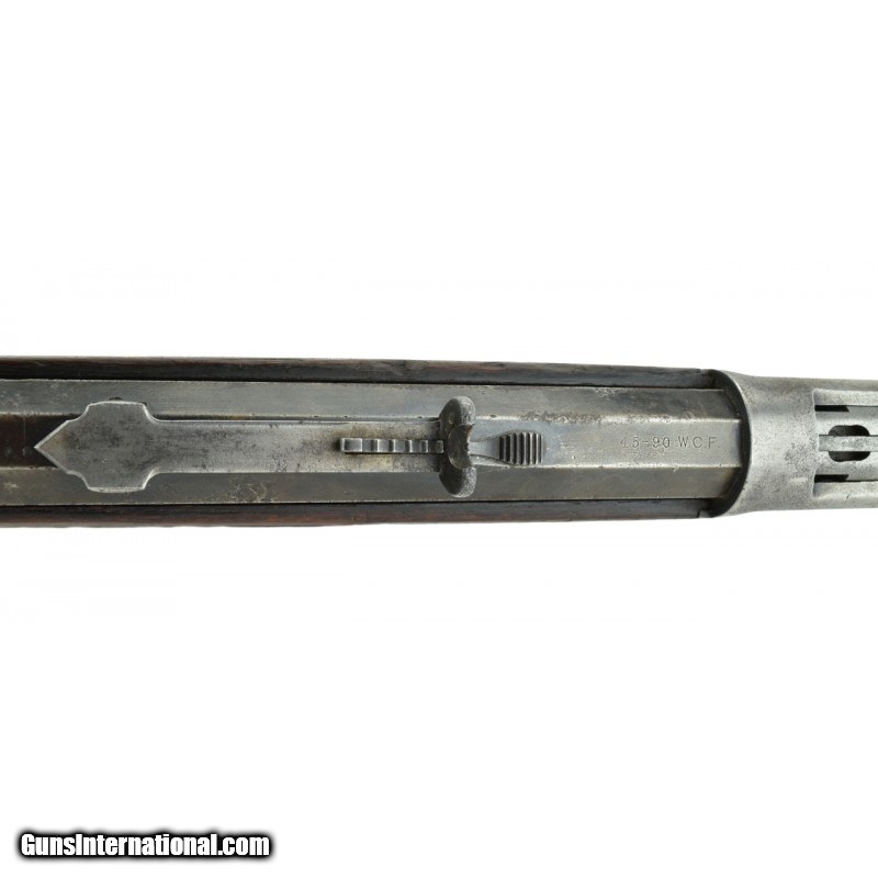 Description: "Winchester 1886 .45-90 caliber rifle. Made in 1889. The barrel of this gun has a bluish gray patina and has pitting on the outside of the barrel. The magazine tube is a replacement. The receiver has a gray patina. The bore is on the rough side with medium to heavy pitting. Wood is refinished, but is original. Very desirable caliber! SOLD Antique: Yes |