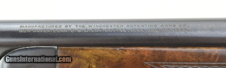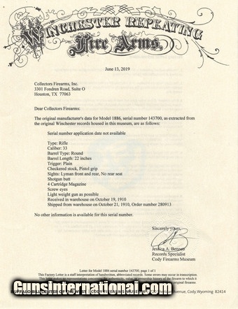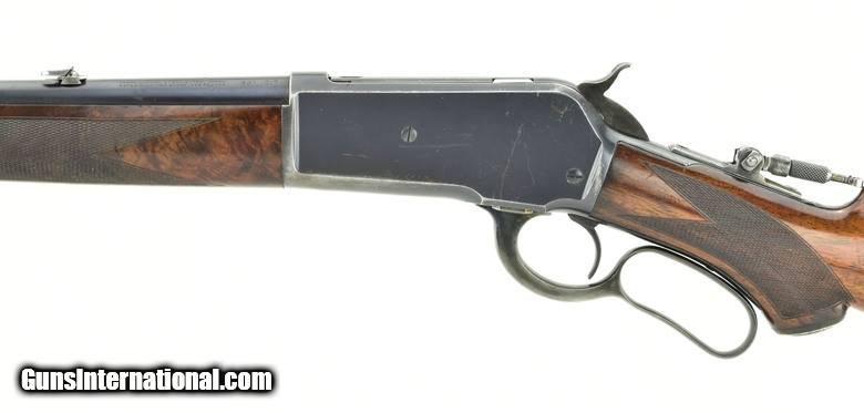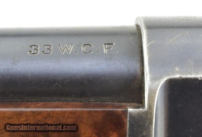 Description: " Winchester 1886 Deluxe Lightweight .33 WCF caliber rifle. Made in 1910. .33 WCF caliber. Metal has 85% original blue. Wood has very fine deluxe grain. Case colors remain on hammer and lever. Has letter confirming all feature, except tang sight being added. Bore is very fine. Very fine Winchester 1886 Deluxe Lightweight!