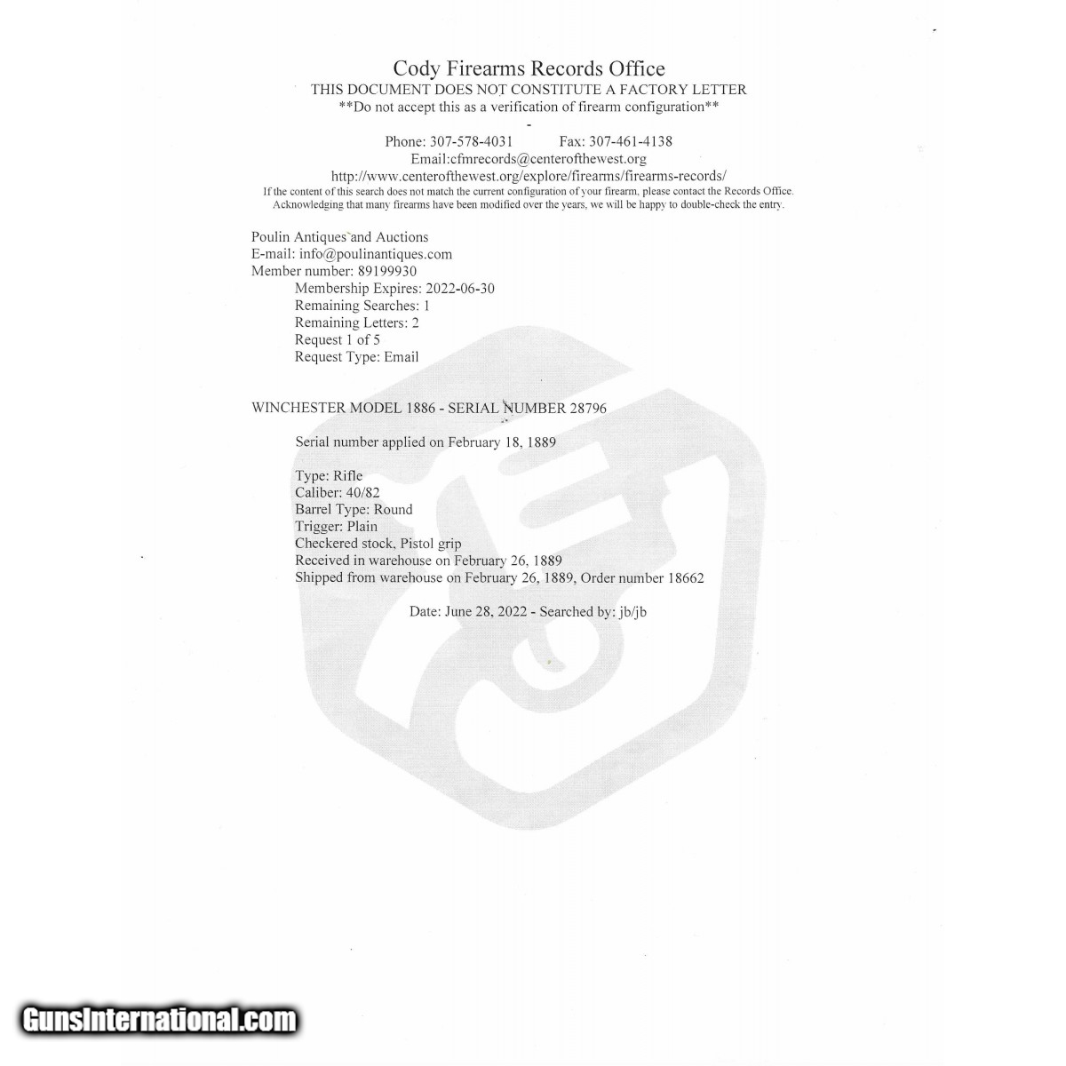 Description: "Serial number 28796. Made in 1889. 40-82 caliber with a 26" round barrel This gun is in very fine condition. The barrel has almost full coverage of thinning original blue. The case colors are bright and shiny. Wood is excellent and has lots of figure in the buttstock. This gun comes with a factory records check confirming all features. SOLD Antique: Yes |