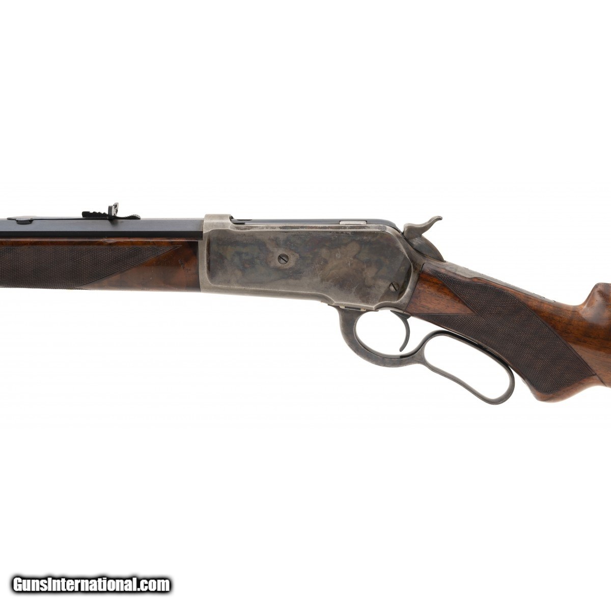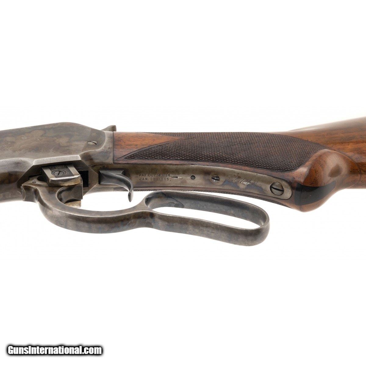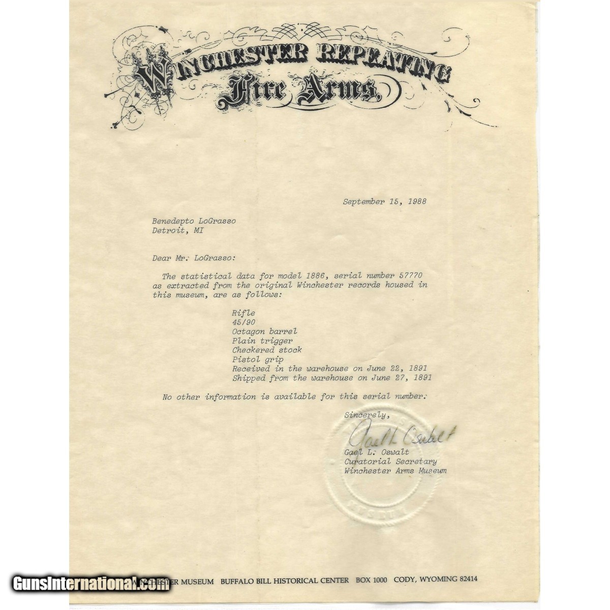 Description: "Serial number 57770. Made in 1891. 45-90 caliber with a 26" barrel. This is an absolutely beautiful deluxe Winchester 1886. The barrel has 99% of the original blue on the barrel. The frame has most of the bright case colors. Wood has beautiful figure and is excellent. This gun comes with a factory letter confirming all features. SOLD Antique: Yes |