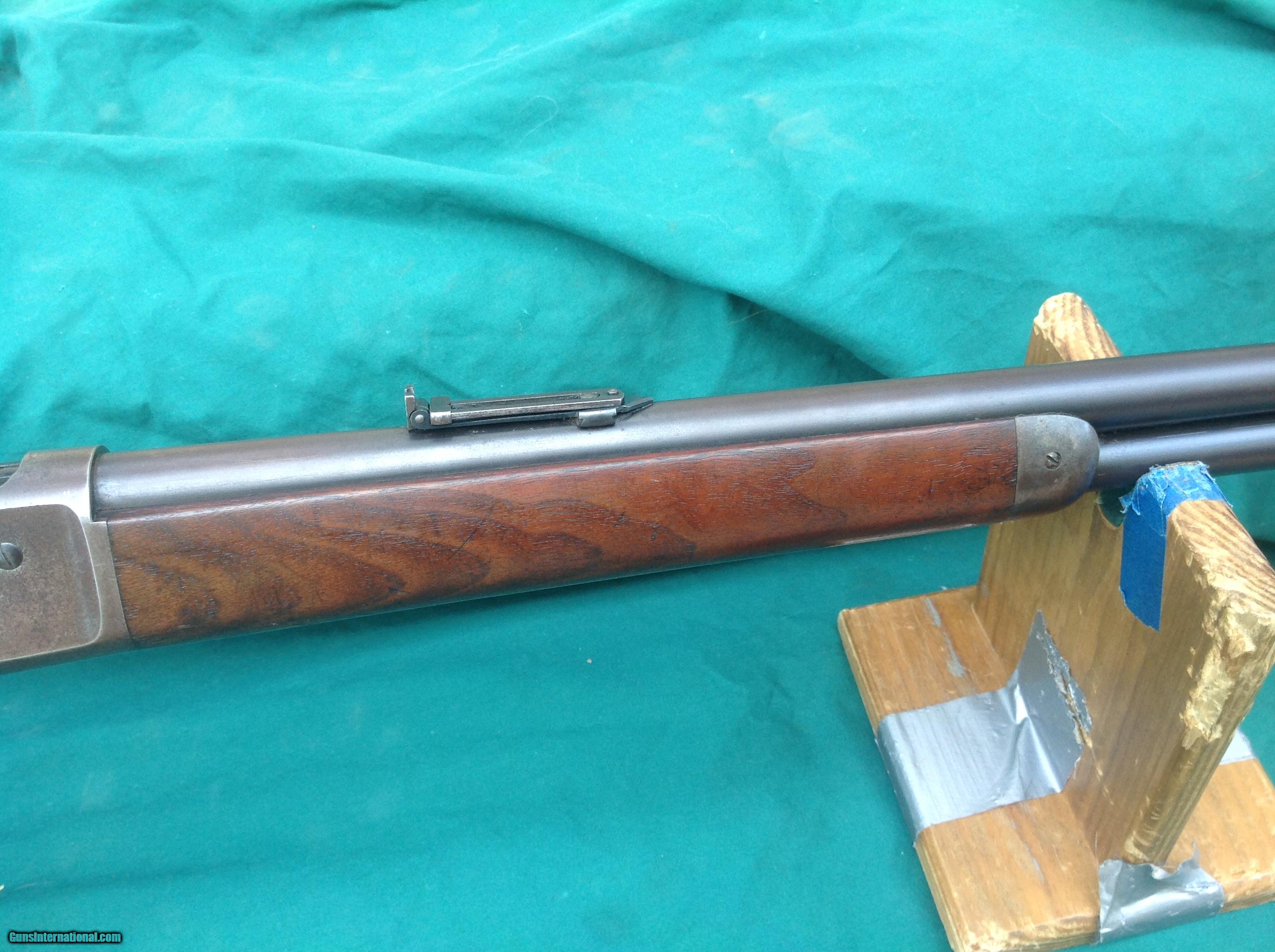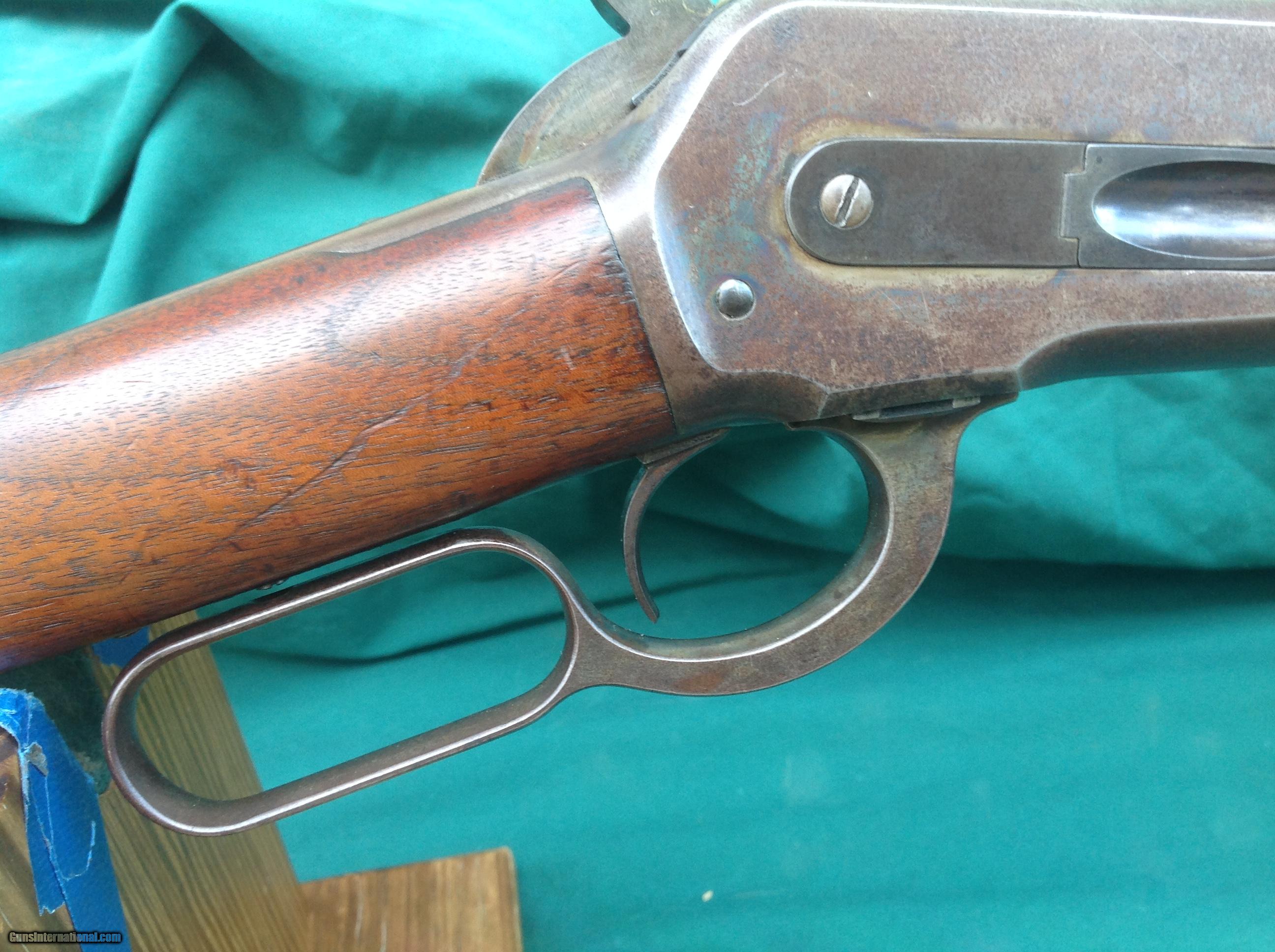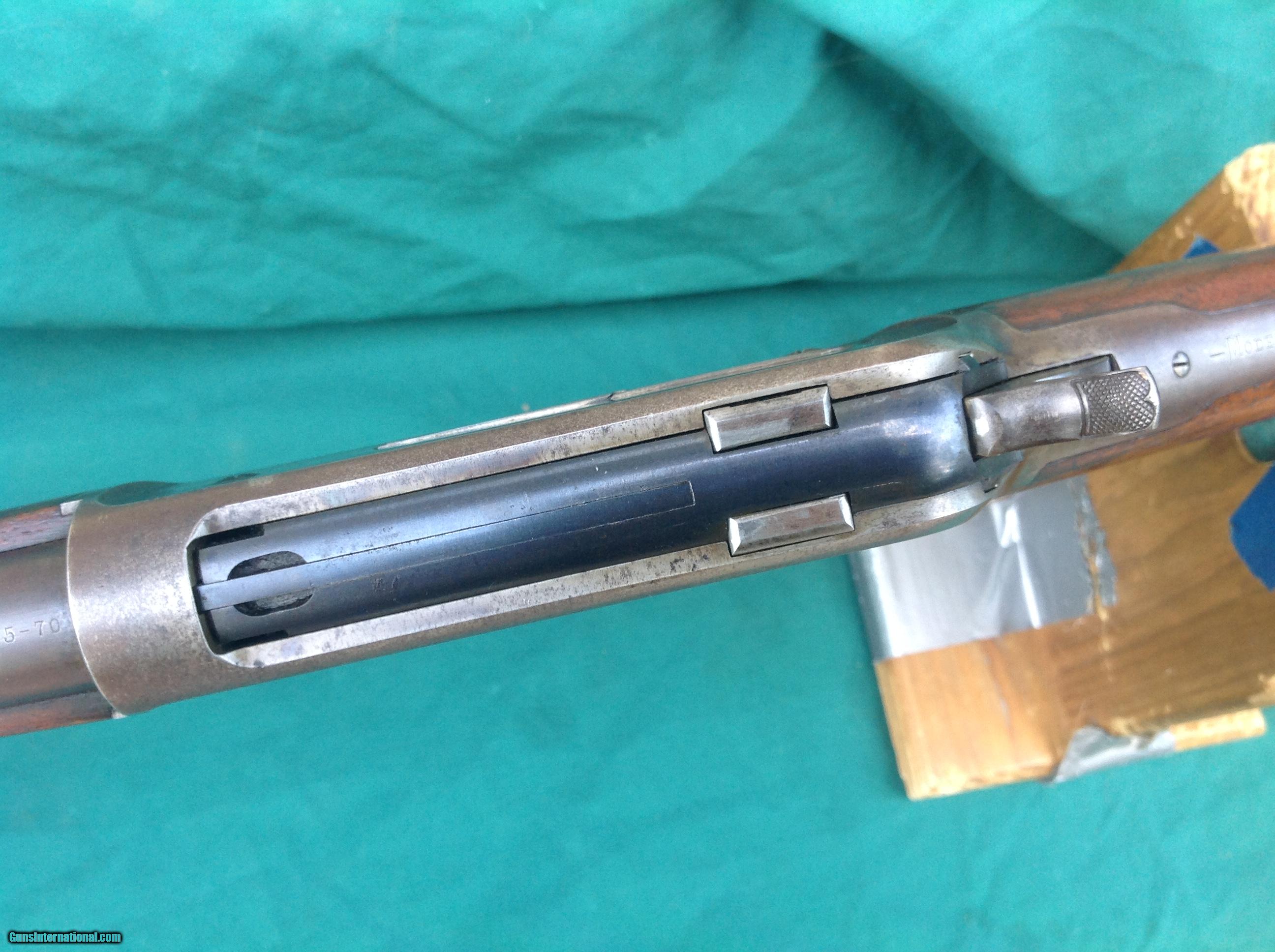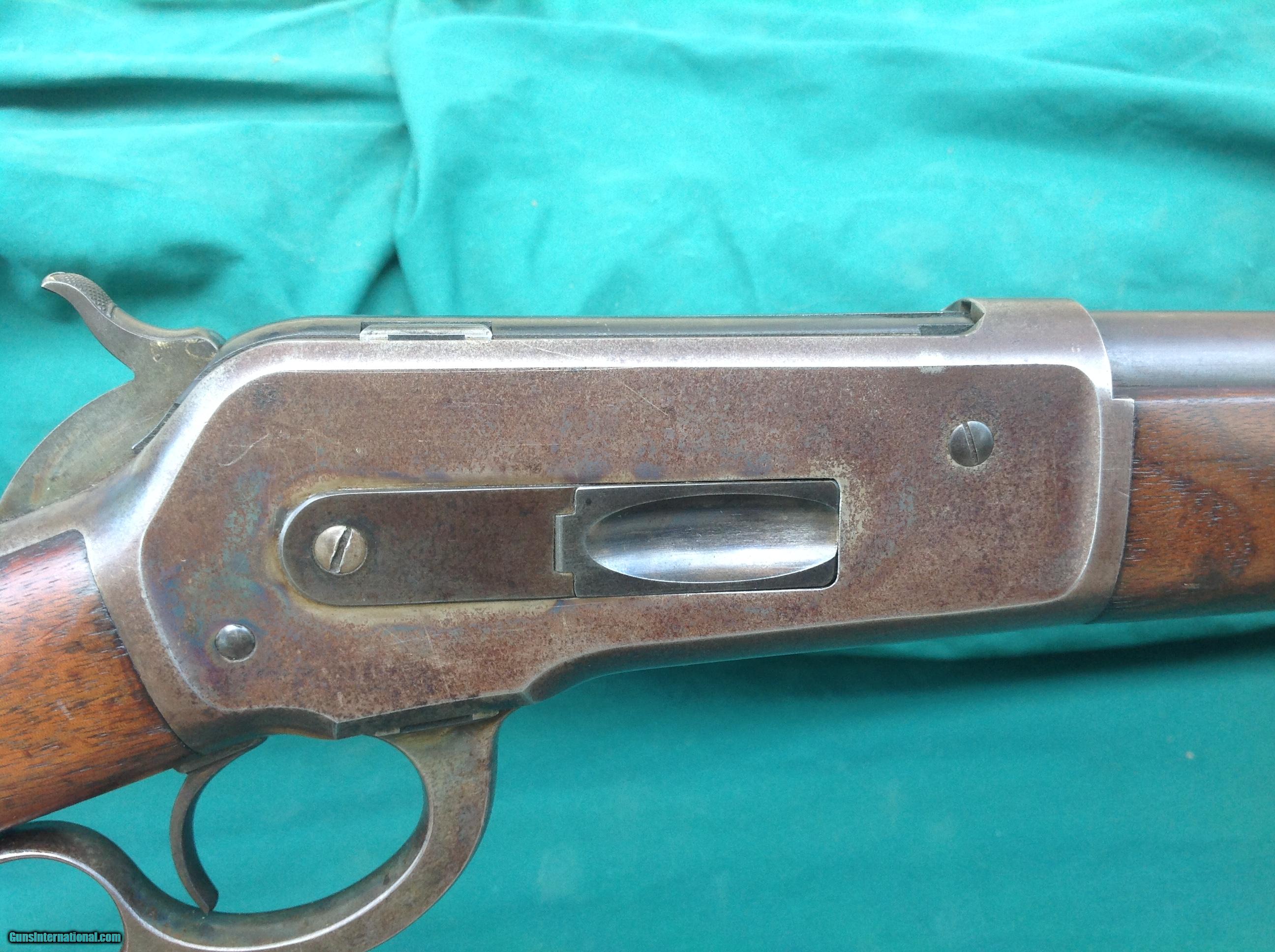Description: 1886 Winchester 45-70 Rifle. Serial number 114,886 manufactured in 1898. 26" round barrel with full magazine tube. I will rate the bore a 7 maybe an 8 on a scale from 1 to 10. Correct and original front and rear sights. Barrel and magazine tube retain a soft 70 to 75% original blue. There is a couple tiny areas of tiny pitting near front sight. Great markings. Left side of receiver retains 60 to 65% original case colors and the right side retains about 20% original. Very nice case colors on hammer and lever. Both forend and buttstock are in very nice condition, never sanded or refinished in anyway. Both pieces do show the normal handling marks, bumps, and scratches. Very nice 1886 Winchester in a great caliber, don't miss out! Please feel free to ask questions. 315-374-3706. SOLD Antique: Yes Manufacturer: Winchester Model: 1886 Caliber Info: 45-70 Condition: Very Good |