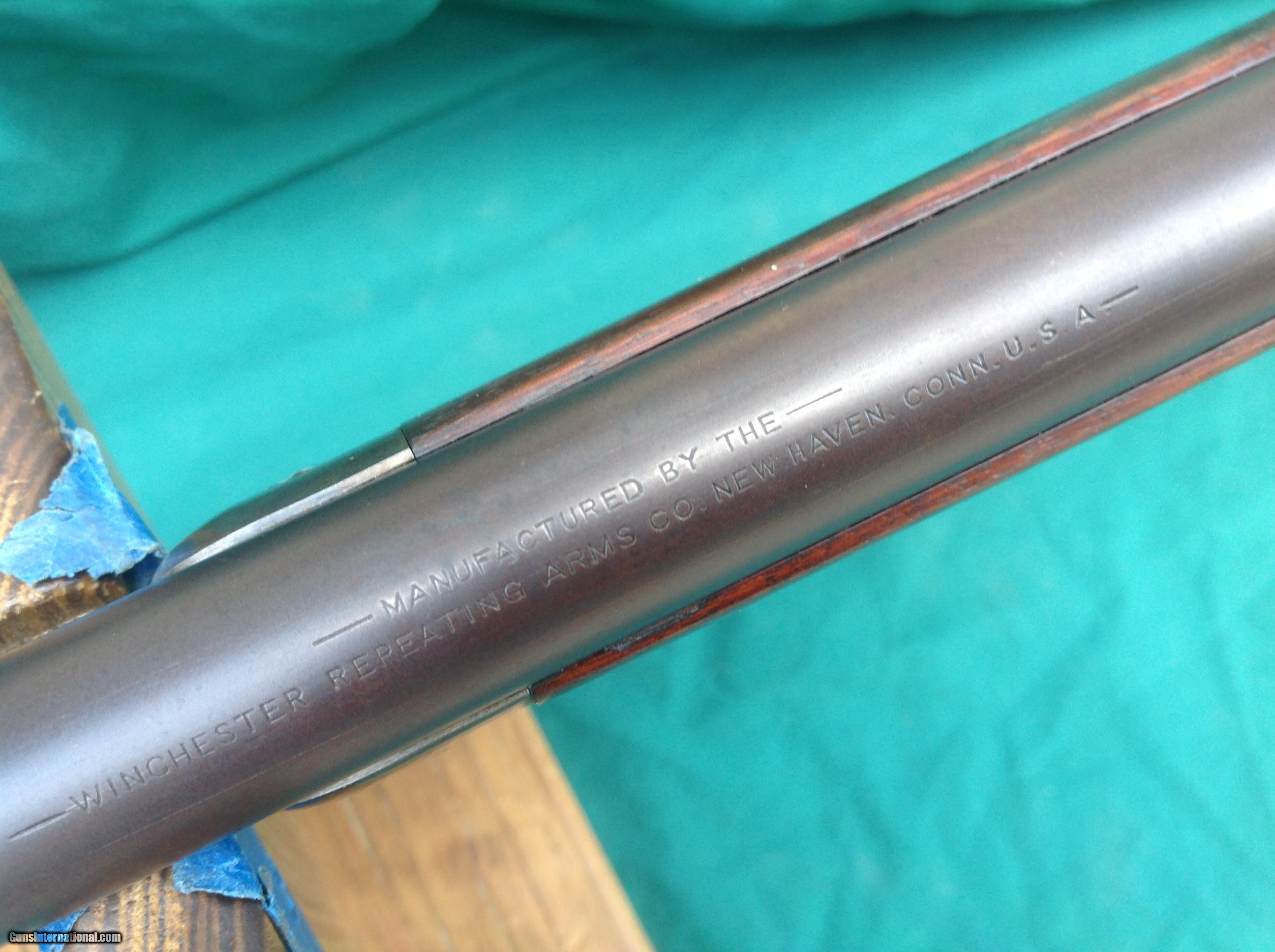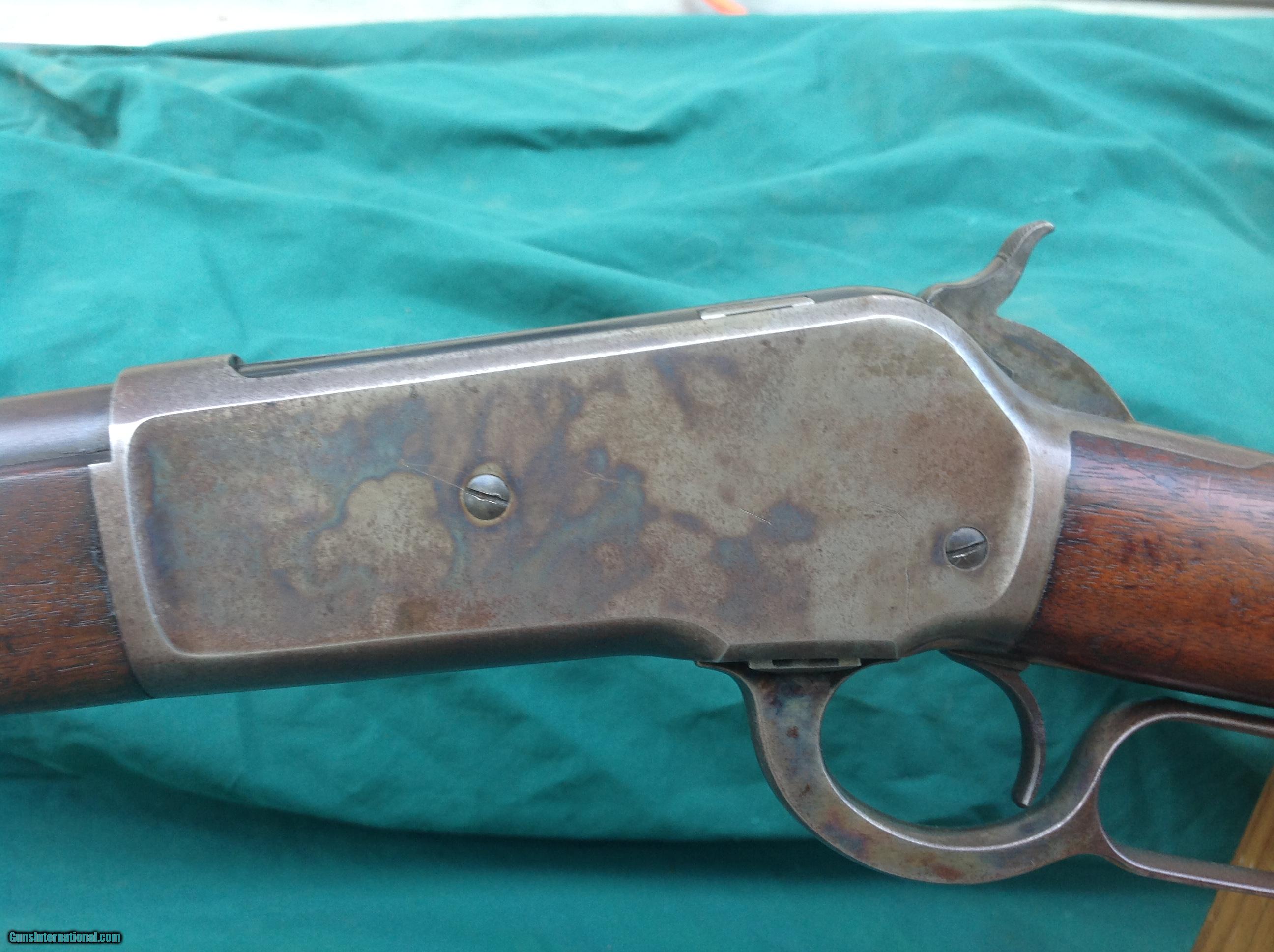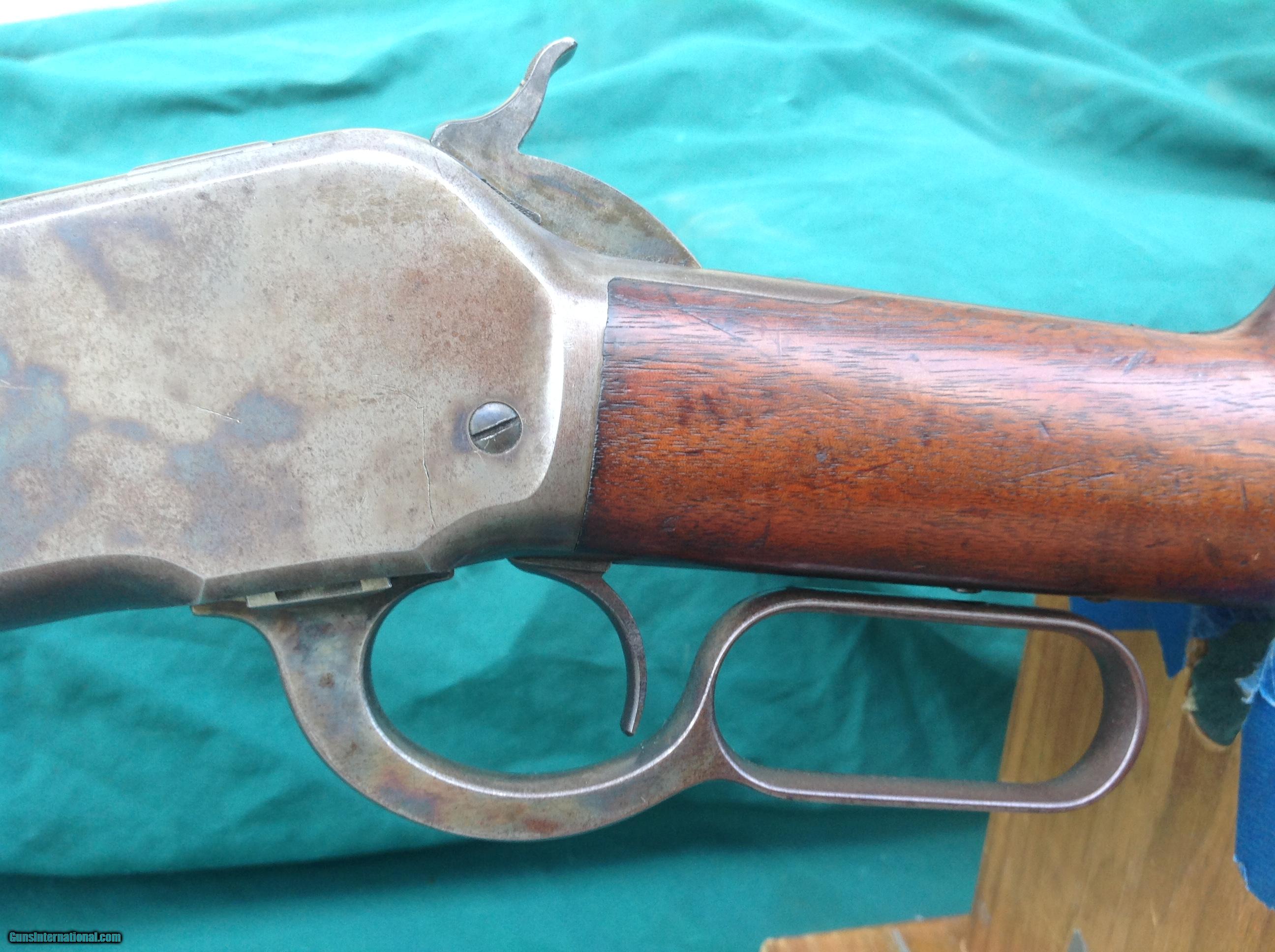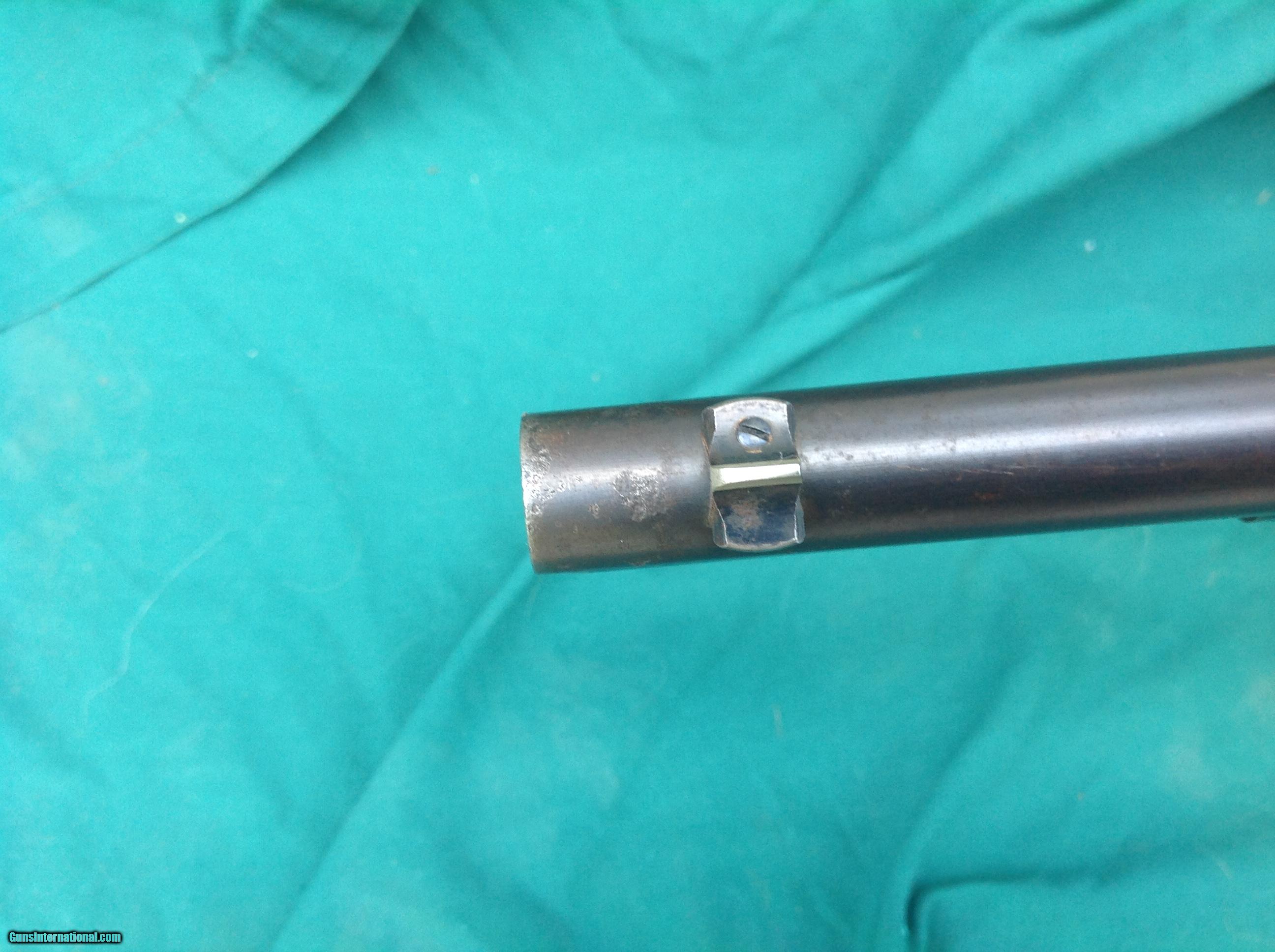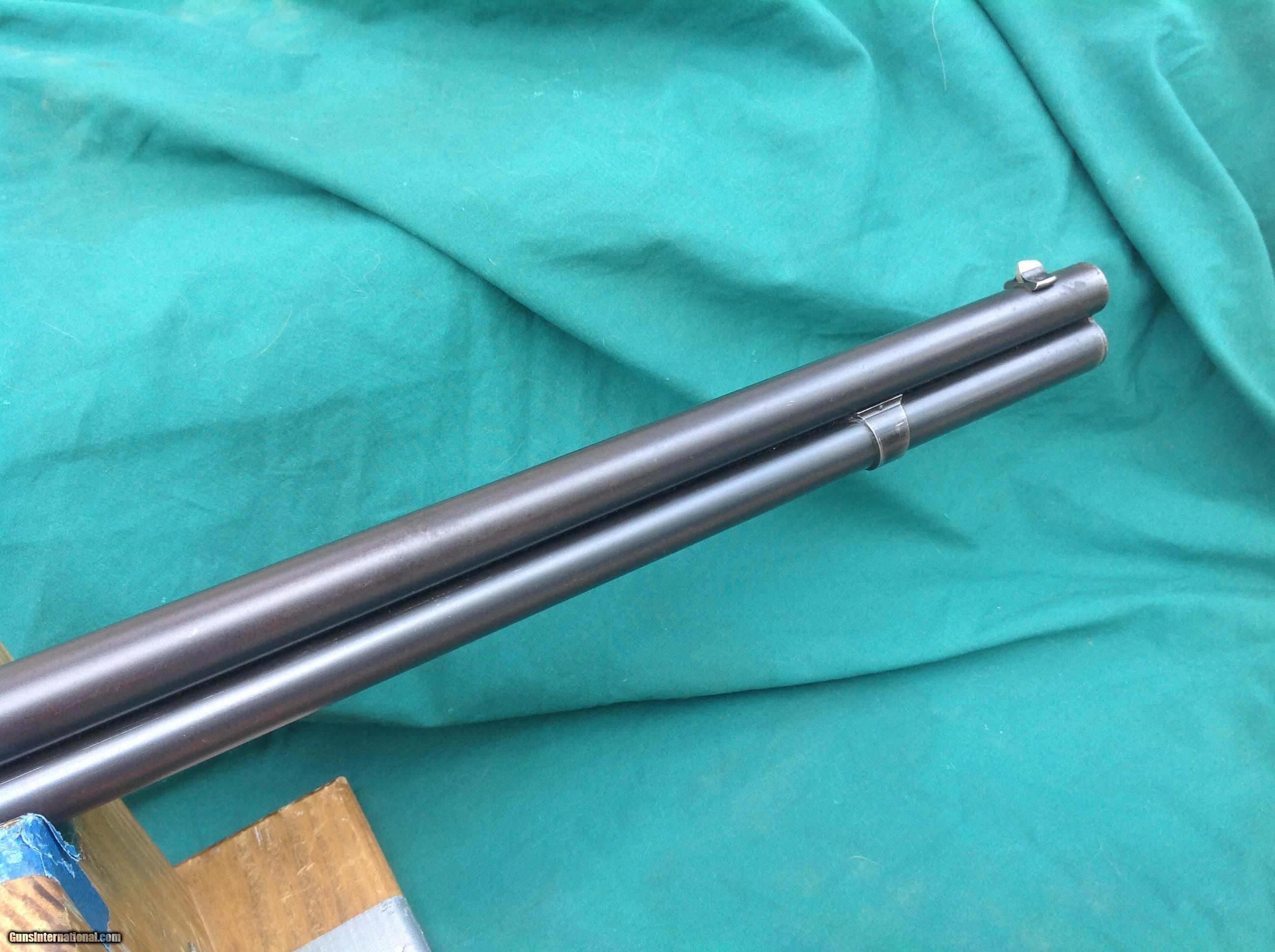 Description: 1886 Winchester 45-70 Rifle. Serial number 114,886 manufactured in 1898. 26" round barrel with full magazine tube. I will rate the bore a 7 maybe an 8 on a scale from 1 to 10. Correct and original front and rear sights. Barrel and magazine tube retain a soft 70 to 75% original blue. There is a couple tiny areas of tiny pitting near front sight. Great markings. Left side of receiver retains 60 to 65% original case colors and the right side retains about 20% original. Very nice case colors on hammer and lever. Both forend and buttstock are in very nice condition, never sanded or refinished in anyway. Both pieces do show the normal handling marks, bumps, and scratches. Very nice 1886 Winchester in a great caliber, don't miss out! Please feel free to ask questions. 315-374-3706. SOLD Antique: Yes Manufacturer: Winchester Model: 1886 Caliber Info: 45-70 Condition: Very Good |