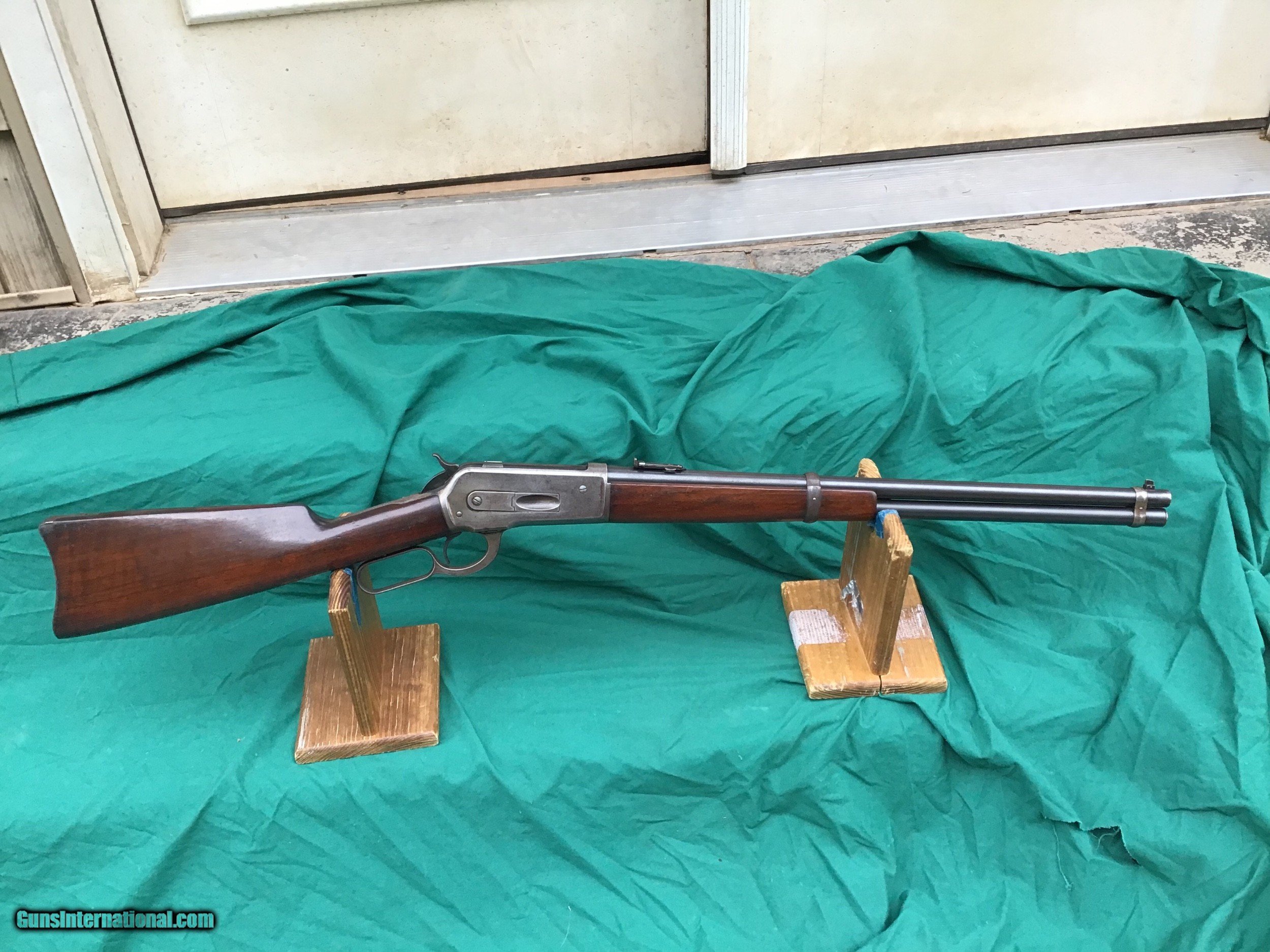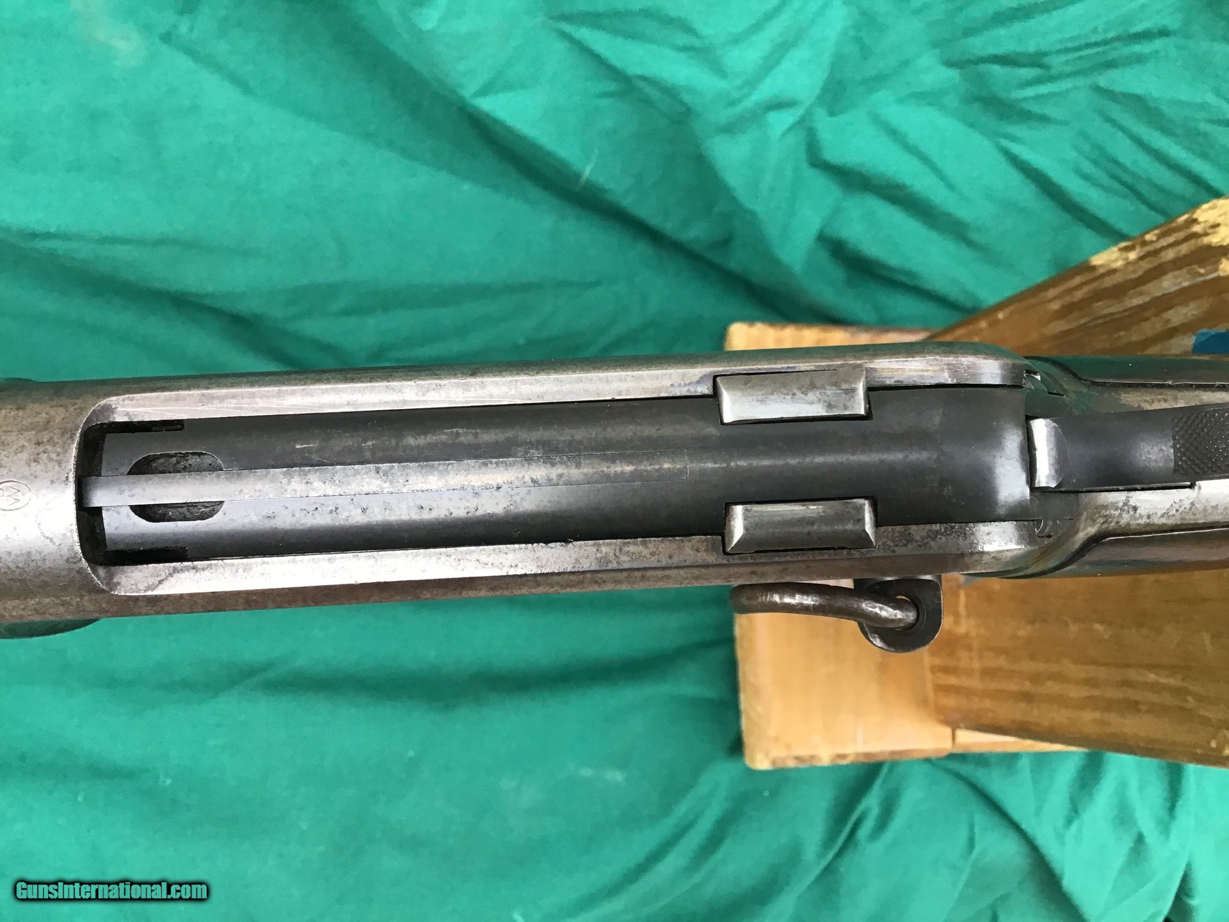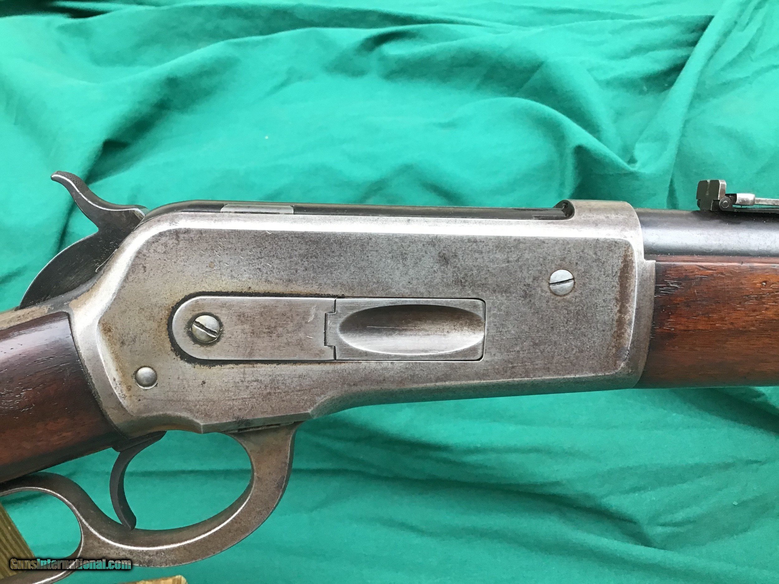 Description: Rare 1886 Winchester Saddle Ring Carbine in 45-70 shipped to France during WWI. See picture of Confirmation Sheet. You don’t usually get that much info pertaining to 1886 Winchester’s, but check out the detailed info on this gun. 22” barrel and full magazine retain 70 to 75% original blue with the remaining turning a gray / brown patina. Excellent markings: barrel, receiver, and tangs. I will rate the bore a very nice 8 on a scale from 1 to 10. Original front and rear sights. Receiver is a nice gray / brown patina with traces of original blue in protected areas. Action functions very well. Both pieces of wood are in above average condition, no apparent cracks or chips. 86 SRC’s are rare to begin with, then throw in the fact the info on where it was sent, is even rarer. Don’t forget most 86 SRC’s you normally see for sale are in the unpopular calibers, this one is in the ever popular 45-70. Please feel free to ask questions. SOLD Curio/Relic: Yes |