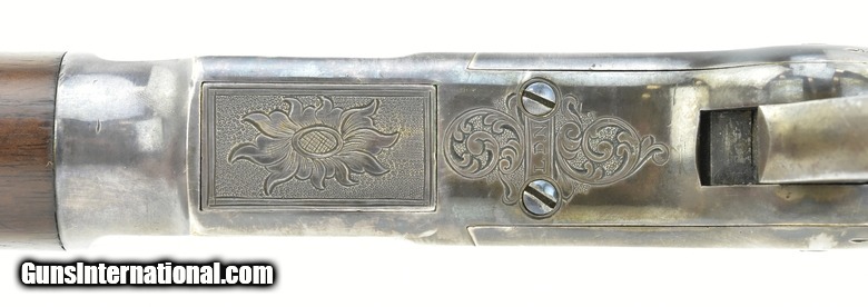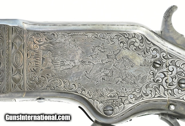 Beautiful Engraved Winchester 1866 Rifle. Early gun made in 1869. This is an original 1866 that has been engraved like a famous engraved L.D. Nimschke 1866 Winchester. The left-hand side of the gun has a scene of an Indian riding off with a frontierswoman while a frontiersman is shooting at the Indian from his log cabin. The right-hand side of the gun has the name “Charles A. Messiter”. The engraving is of excellent quality, and the silver plating Is nicely tarnished. The barrel has excellent original blue. This scene is well illustrated on page 60 (upper-right) in the L. D. Nimschcke Firearms Engraver book by R. L. Wilson.