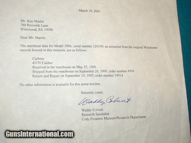 GORGEOUS MODEL 1886 45-70 SADDLE CARBINE W/ LETTER