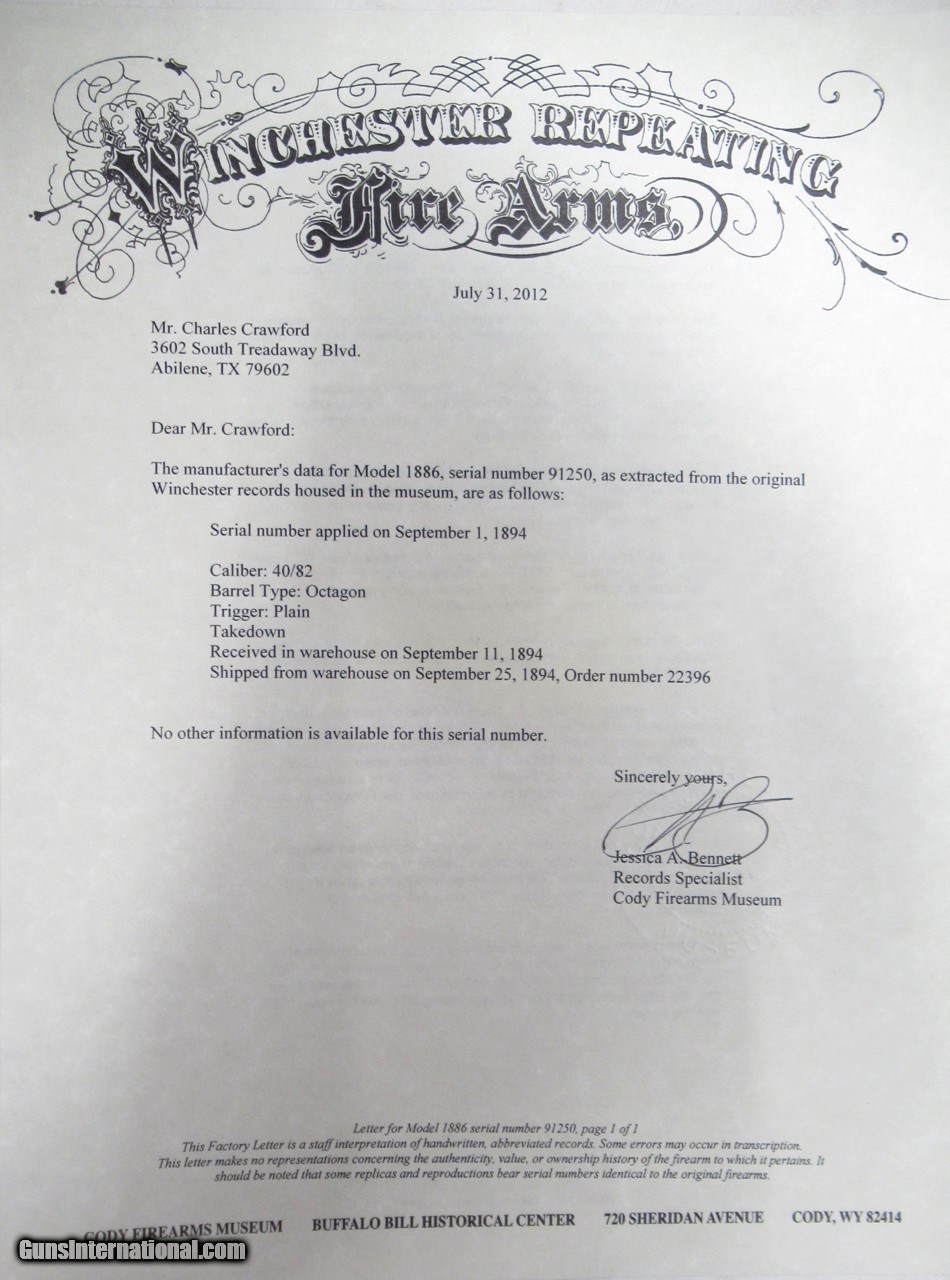 Winchester Model 1886 Lever-Action Takedown Rifle; Serial No. 91250; Per Included Factory Letter: 40/82 Caliber; Octagon Barrel (26”); Plain Trigger; Takedown; Shipped September 25, 1894 – Order No. 22396; This Fine 131 Year-Old Winchester Retains Most of the Original Metal Finish and Most of the Original Wood Varnish; Perfect Action, Perfect Takedown Features; Great Strong Shiny Bore; This Rifle has Fine Condition, Rarity, and Factory Letter; See All Photos for Condition; No Texts; Call (254)541-5765 or Email Only; PERSONAL PROPERTY of Harold Wieser;NOTICE: We Do Not Do Any Consignments - All Items Listed are Owned by Us - NO SALES to New Jersey or New York City - Antiques Only to Massachusetts and California;NOTE: All Modern Firearms Must Go to FFL Dealer who will Accept From Individual with Texas Driver License; Price: $7,975 + $100 S&H; Payment Address: Harold Wieser - 1466 U.S. Hwy 77 - Rosebud, TX 76570; SEND PAYMENTS VIA USPS PRIORITY MAIL;BEWARE of SCAMS!!! - DO NOT SEND MONEY or CORRESPONDENTS ELECTRONICALLY UNLESS YOU HAVE SPOKEN to HAROLD WIESER FIRST! (254)541-5765