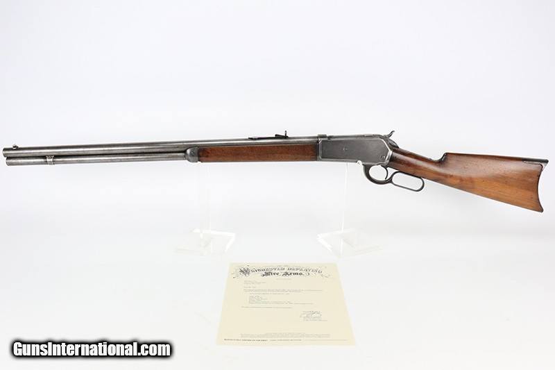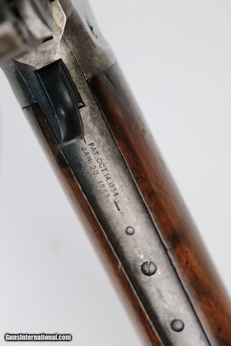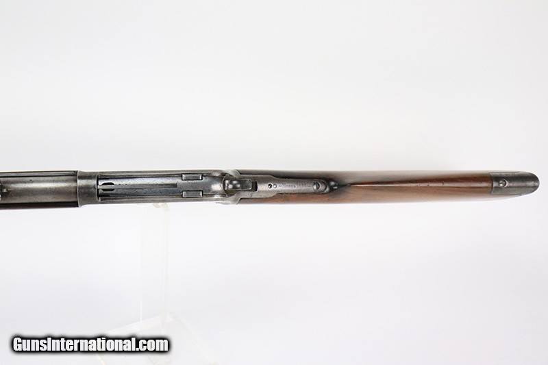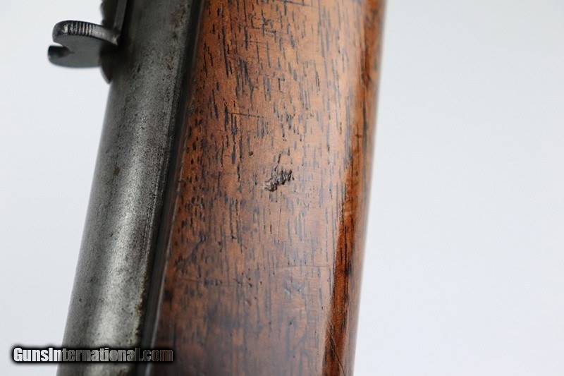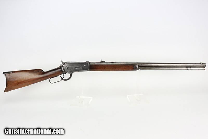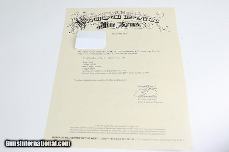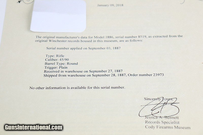 Description: This is a very early example of the scarce Winchester Model 1886 rifle, with this one dating to 1887. The listing includes a Cody letter stating it shipped in September of that year with round barrel and plain trigger. Chambered for .45-90 with 26in barrel. The finish is original but worn thin throughout. The bore has okay rifling but it has smoothed down to some extent, and there's some pitting throughout. Stock and forend are in good condition with no major defects. Lever action is fairly smooth and appears to function properly. Antique so no licensing required. SOLD Antique: Yes Rifle Caliber: .45-90 Winchester |