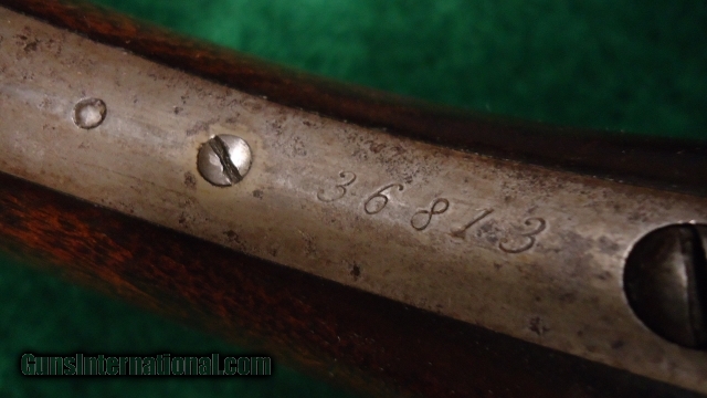 Description: Button mag. VG sharp shiny bore. Cal 45-90. Orig sights include 86 marked folding leaf sight as well as folding tang sight. Pistol grip plain walnut stocks retain a fair amount of orig varnish. Usual mars and dings. Rifle style butt plate. Overall metal has turned mostly plum/brown color with sharp corners and good markings. Nice functioning action. Pictured on page 83 of the Madis Winchester handbook. Orig and very scarce to see 28" half oct with extra heavy bbl! Leroy Merz Antique Firearms specializes in antique and vintage Winchesters and other fine American firearms. Since 1965 Mr. Merz has taken part in the world of firearms and has been a contributor to many well known reference books. Just recently we mailed the 124th edition of our privately-published catalog. We have hundreds of additional guns in every price range at our home online. Search for Merz Antiques in google. SOLD Antique: Yes |
