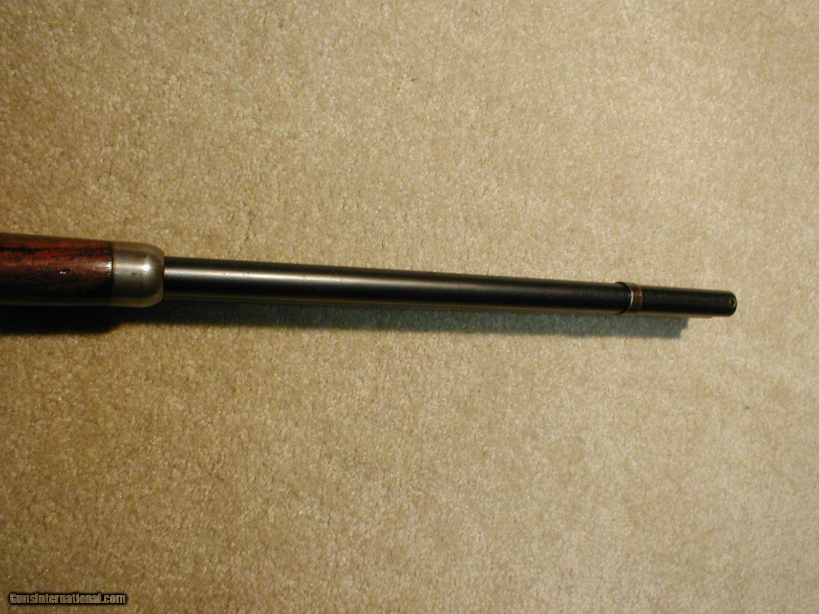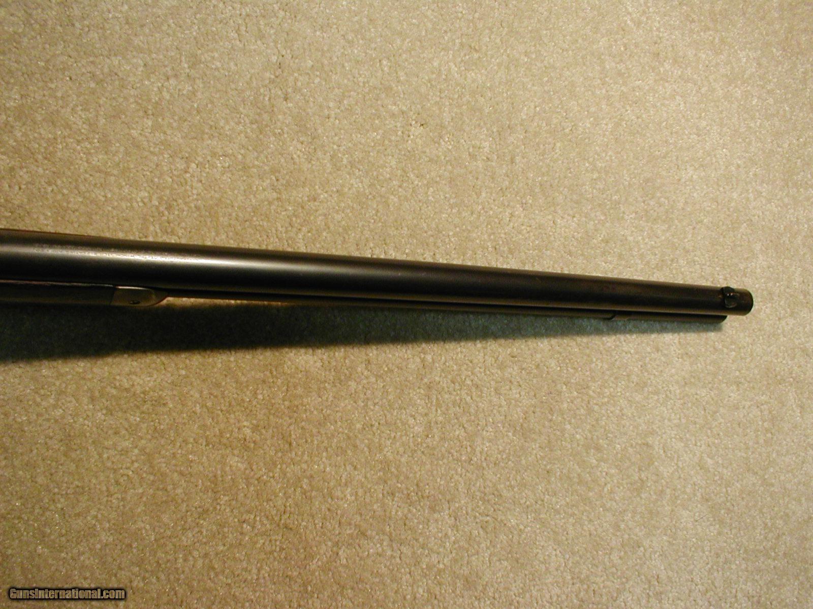 Description: SPECIAL ORDER 1886 .45-70 ROUND BARREL RIFLE, FULL MAGAZINE, SHOTGUN BUTT, MADE 1909, Winchester call in sheet shows this rifle #144XXX as "Rifle, .45-70, round barrel, plain trigger, Lyman hunting front sight with flat top sporting rears sight, smokeless, shotgun butt- rubber, nickel steel barrel, shipped September 15, 1909," barrel side is stamped "Nickel Steel," fine deep barrel and mag blue that is showing only some minor spots of thinning/scuffing, still retains the sights mentioned in the letter, exc. wood with tight wood to metal fit and exc. Winchester embossed rubber butt plate with the beginnings of a crack in the middle that doesn't go to the edge- really minor, fine blue on the bolt and loading gate, receiver sides show over half the blue on the left side and a bit less on the right side with the balance mixing gray, fairly bright exc. bore, exc. screws, tight action and really attractive special order 1886 in the most desirable caliber, generally during this time of manufacture full length 26" barrels had been replaced with the extra light weight barrels in lengths of 22" for the .45-70 and 24" for the .33WCF- both standard with half magazines. SOLD Curio/Relic: Yes Manufacturer: Winchester Model: 1886 Special Order Serial Number: 144XXX Caliber Info: .45-70 Condition: fine+ Barrels: 26" round |