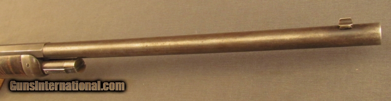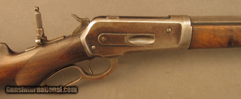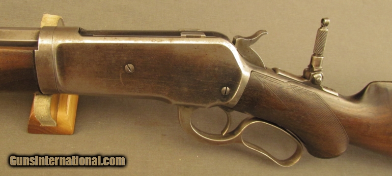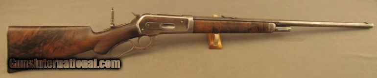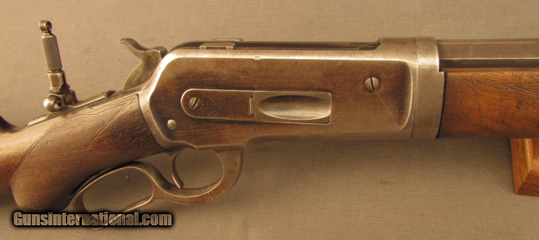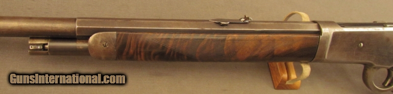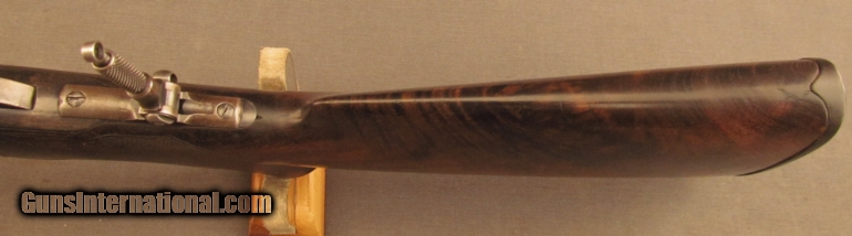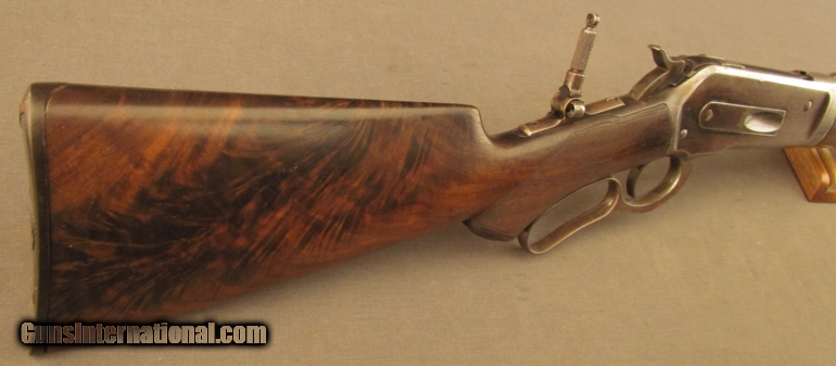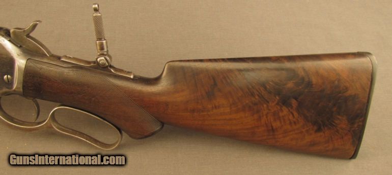 Description: S# 118400, 45-70, 26 inch barrel, very good bore with strong rifling and light frosting throughout This beautiful 1886 has many special order features including 1/2 Octagon, checkered stock, pistol grip, Lyman Front, leaf and rear sights, 1/2 magazine, shotgun rubber butt, takedown , and oil finish, these are all listed in the Cody zip sheet. Left side of lower tang is stamped 1XXR. Barrel, mag tube and receiver retains about 40% blue with scattered light stains and silvering. Lever shows traces of case colors with silvering on balance. Wood shows typical shrinkage issues seen with fancy grain, butt is slightly rounded at toe, that area was probably refinished long ago. The flame grain on butstock shows age checks. The original hard rubber butplate shows wear with no chips or cracks. This is a very unusual deluxe 1886 with ten special order features. Antique SOLD Manufacturer: Winchester Model: 1886 Serial Number: 118400 Caliber Info: .45-70 Gauge Info: .45-70 |