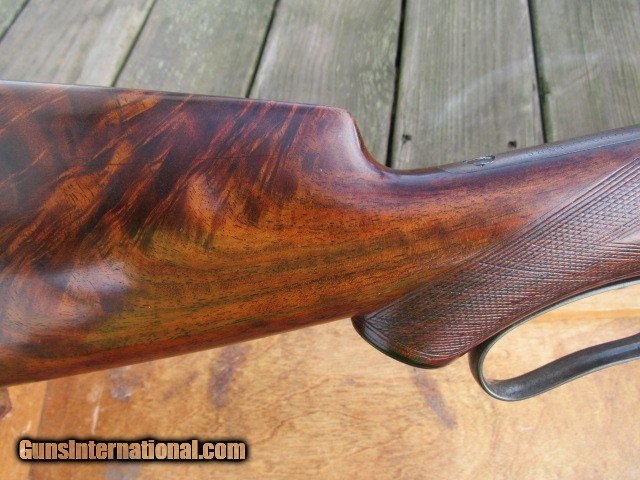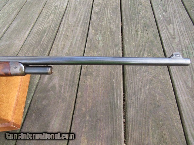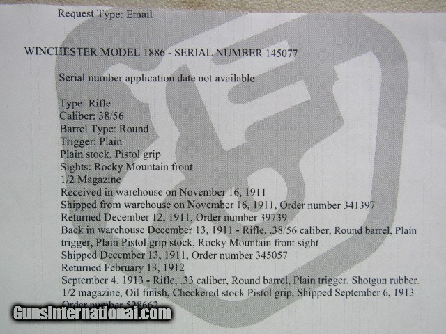 Description: Winchester Model 1886 rifle, serial number 145077 with interesting Cody Museum info sheet, which states that this rifle started life as a 38-56 caliber with round barrel, plain trigger, plain pistol grip stock, Rocky Mountain front sight, 1/2 magazine, received in and shipped from the warehouse on November 16, 1911 to order number 341397. Rifle was returned on December 12, 1911 on order number 39379 but kept in the same configuration and shipped again on December 13, 1911 to order number 345057. The rifle was returned again on February 13, 1912 and sat around until September 4, 1913 (a year and a half !!) until it was changed to its current configuration, which is a 33 caliber rifle with 24" round barrel, plain trigger, shotgun butt, rubber butt plate, 1/2 magazine, checkered pistol grip stock with oil finish, and shipped September 6, 1913 to order number 528662. Quite a history and seldom do the factory records show this much activity. Cody Museum email sheet is shown in the past picture and will be included with the rifle for the buyer. CONDITION: Receiver has 90% brilliant bright blue on both sides and on the lower tang. Upper tang and underside of receiver have turned patina from the typical carry wear. Barrel and 1/2 mag tube retain 85% bright blue starting to thin and tone. Deluxe fancy burl walnut stocks are in excellent condition showing only a few light scratches, no extra holes, tight and even with the metal. Original hard rubber Winchester logo butt plate has a very small chip missing at the toe. Original style H checkering is all there and still quite sharp with no gaps, just lightly worn from carry and thankfully never freshened. Original ramp front sight base holds a Marble Sheard copper bead sight. Rear sight is a later Winchester 22G. The sights and the two neatly-filled holes in the receiver for a Lyman or Redfield peep sight are the only non-factory items on this rifle. Excellent bright shiny bore with no pitting and no frost. Action is smooth and crisp with working half cock safety. Rifle has been test-fired and it feeds, fires and functions as it should (great shooter using Buffalo Arms 33 WCF ammo). Grades NRA Modern Very Good. Fine, affordable deluxe Winchester 1886 that would be worth double my asking price without the non-factory alteration. Heck, the fancy checkered stocks are worth my asking price alone - if you think I'm crazy, get a quote from Turnbull Restorations on a set! TERMS: No international sales. Must ship to FFL or C&R licensee (shipments within New York State must be to an FFL ONLY). Please be aware of what is legal in your state. 3 day non-firing inspection. Buyer pays return shipping. Payment by bank check, personal check or money order. All major credit cards accepted with 4% convenience fee added. Shipping will be USPS Priority Mail with tracking and insurance. Always interested in used long guns and used antique handguns so please contact me if you have anything for sale or trade. 315.251.4799 with questions or concerns. SOLD Curio/Relic: Yes Manufacturer: Winchester Model: 1886 Serial Number: 145077 Barrel Length: 24" round Condition: Excellent Metal Condition: Excellent Wood Condition: Excellent Bore Condition: Excellent Action: Lever Triggers: Standard/plain Stock: Fancy Walnut Sights: Standard Manufacture Date: 1911 Item Location: New York |