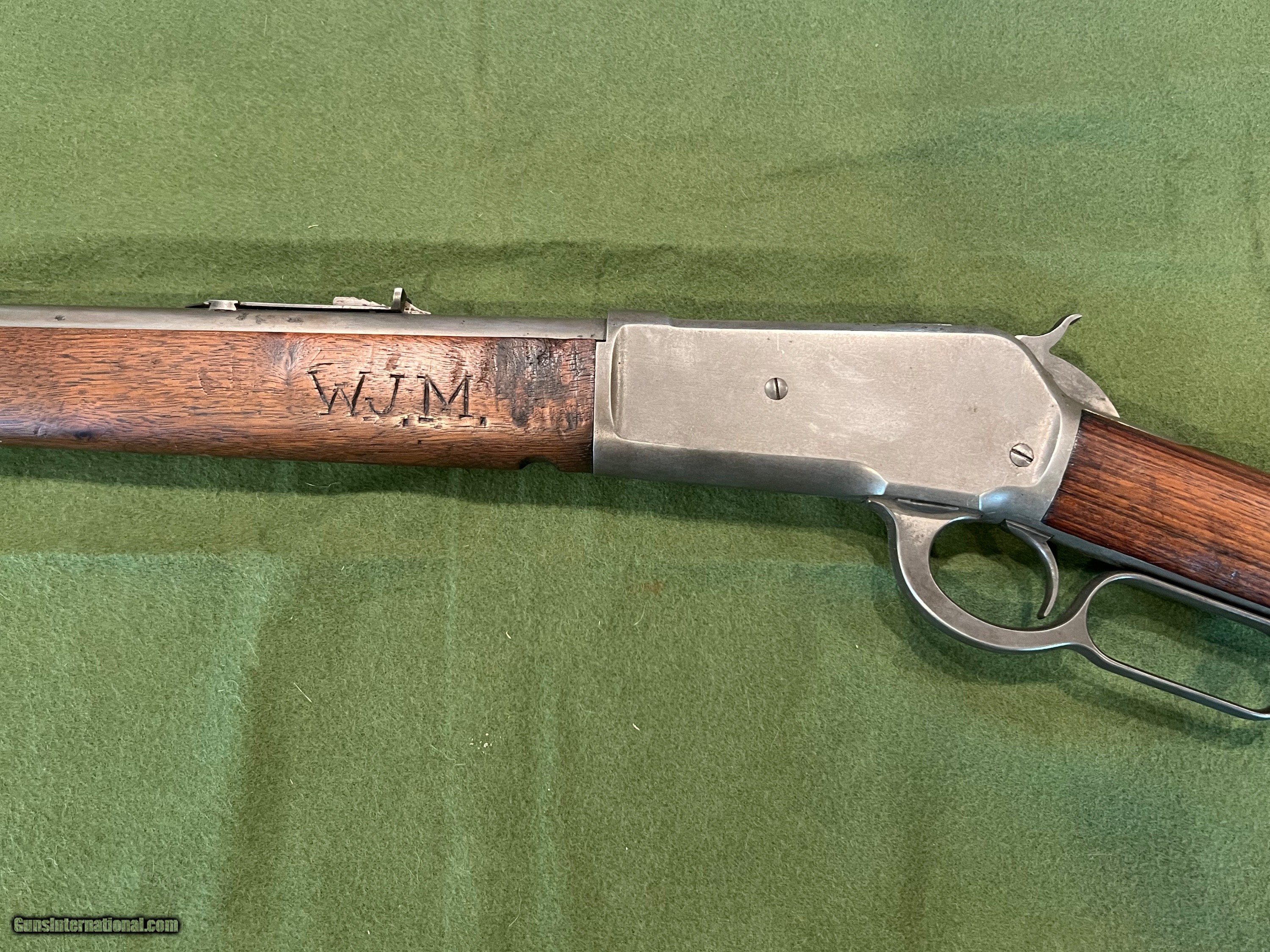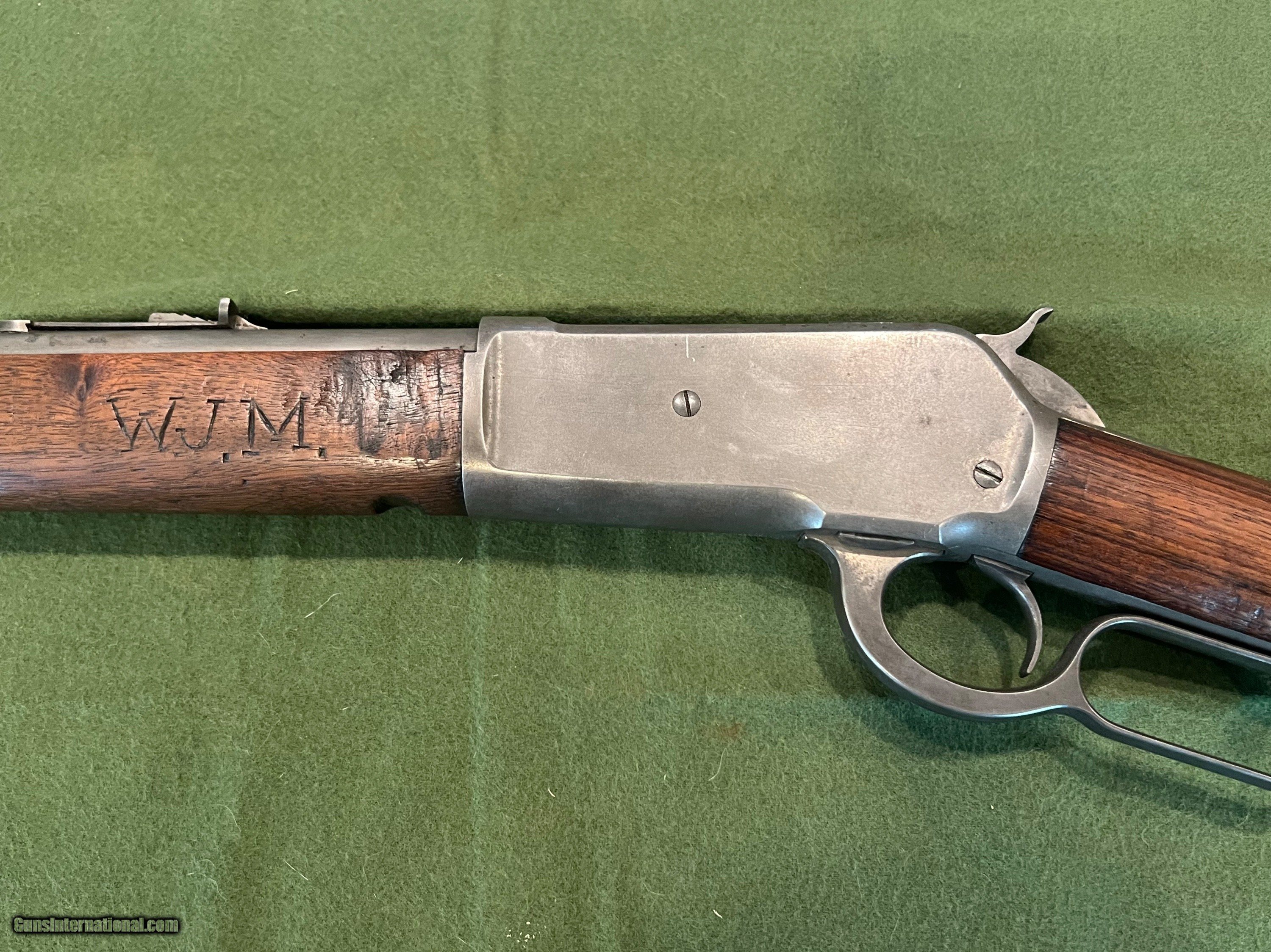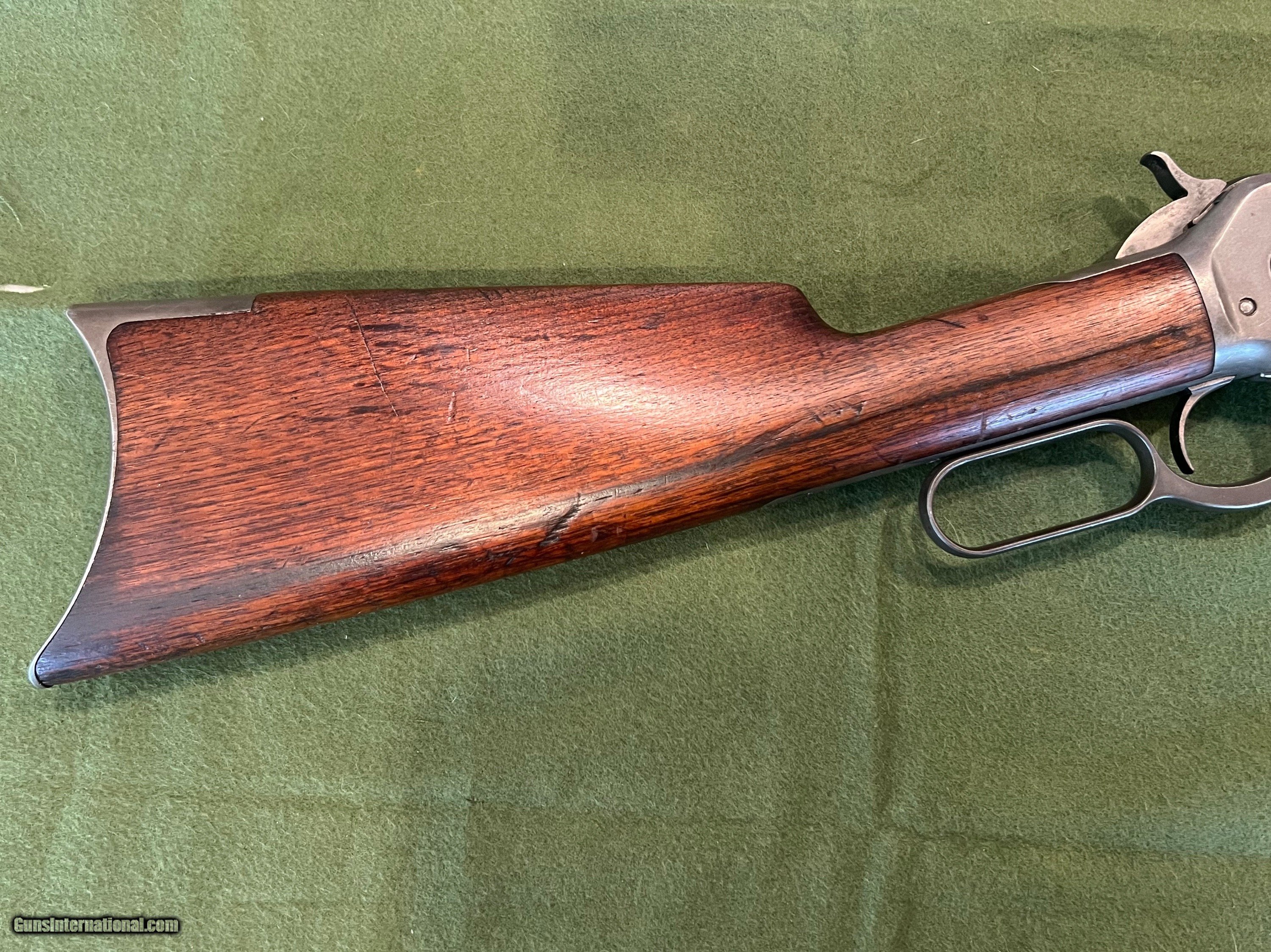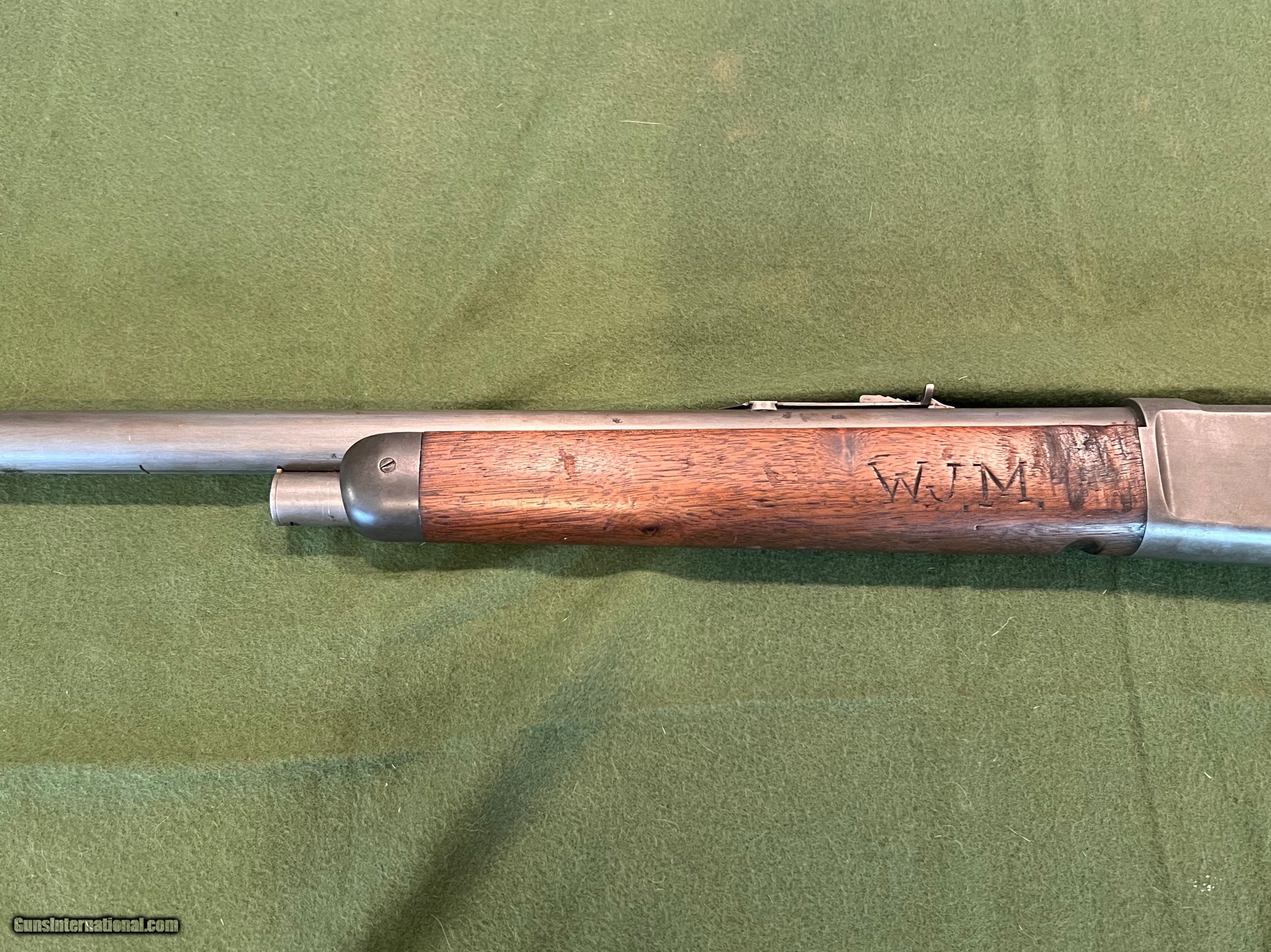 Description: I have a Winchester Model 1886 with a 26" round barrel in 40-65 manufactured in 1894. The 86 started life with a full length magazine tube but was shortened to look like a take down or for functionality. The change in the 86 looks to be done a ways back but was done correctly. The metal retains very little finish, but the metal is very smooth and shows almost zero pitting. The forearm has the initials WJM carved into the wood and a notch on the bottom of the forearm for a possible resting position. The action is strong and it has a very good bore. The bore is shiny with very little pitting, and I would say this 86 would be a great shooter SOLD Antique: Yes Rifle Caliber: .40-65 Winchester Manufacturer: Winchester Model: 1886 Serial Number: 85XXX Barrel Length: 26 inches Condition: Good Metal Condition: Smooth |