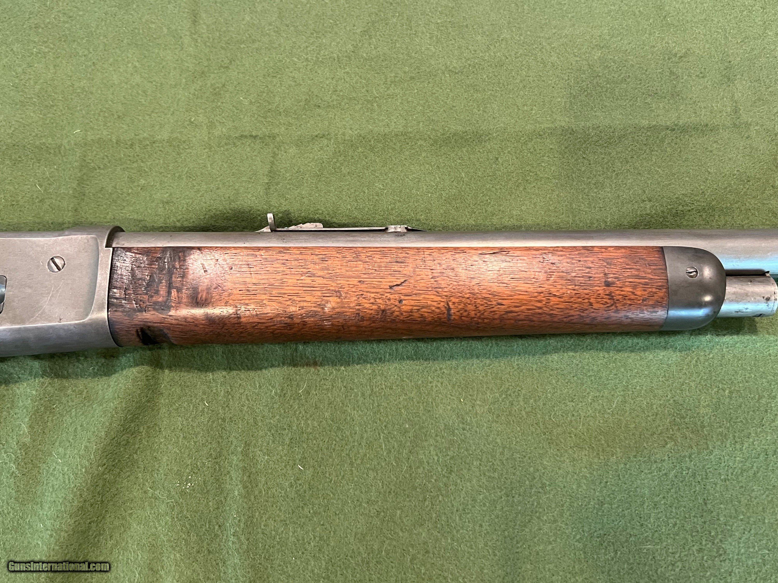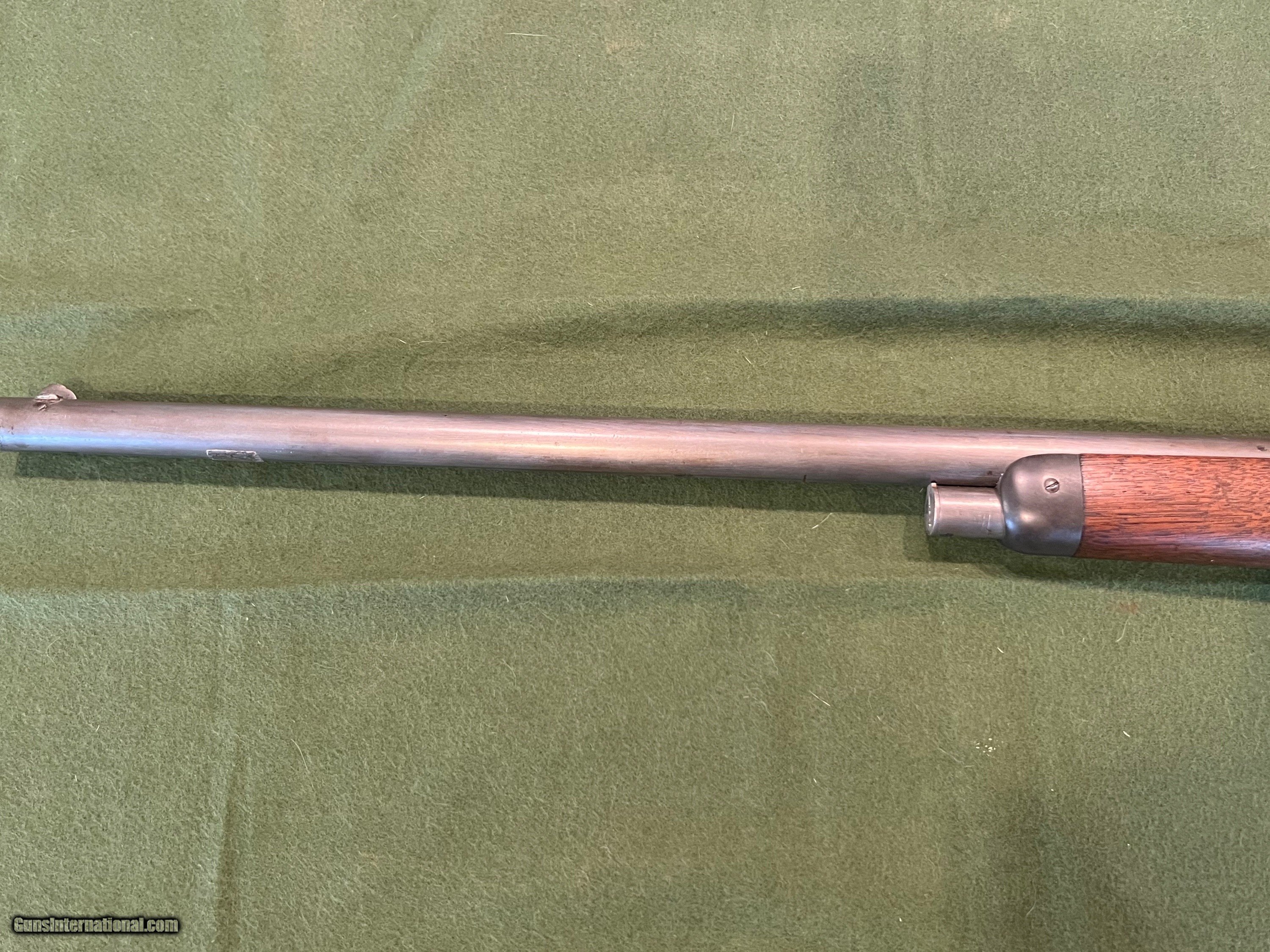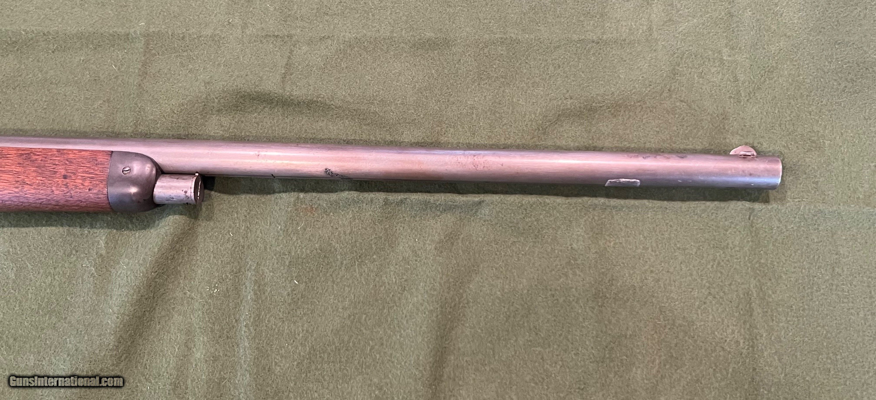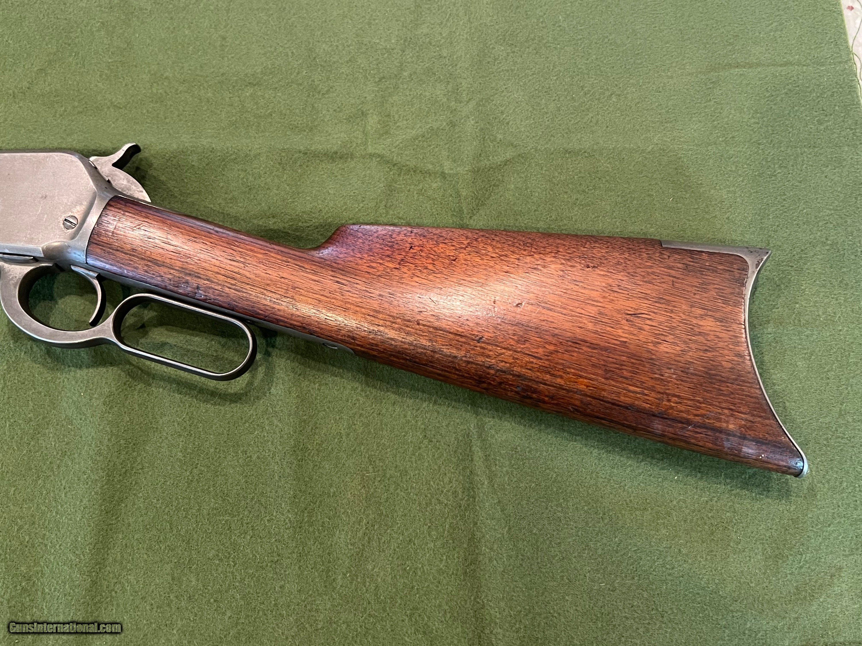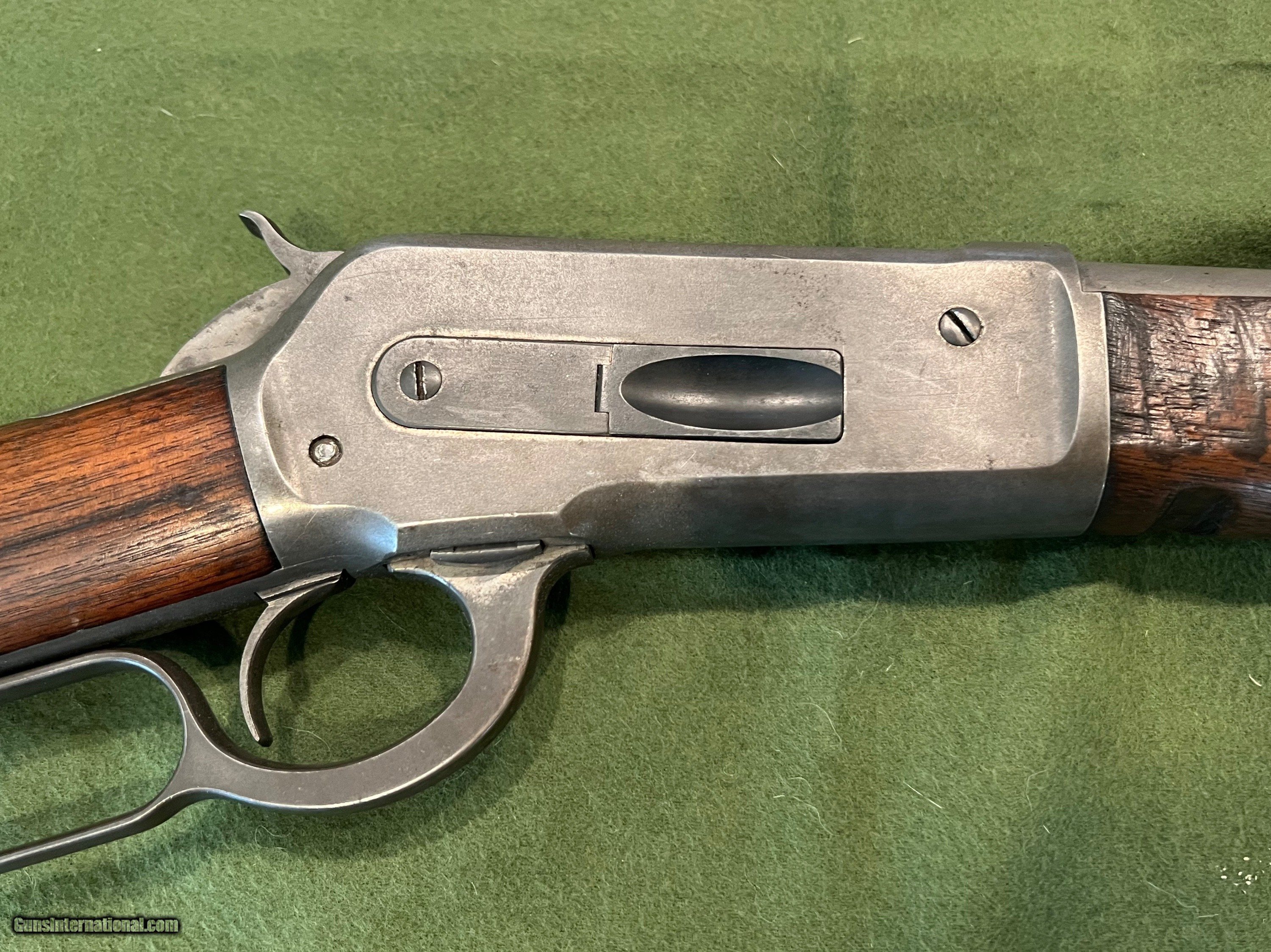 Description: I have a Winchester Model 1886 with a 26" round barrel in 40-65 manufactured in 1894. The 86 started life with a full length magazine tube but was shortened to look like a take down or for functionality. The change in the 86 looks to be done a ways back but was done correctly. The metal retains very little finish, but the metal is very smooth and shows almost zero pitting. The forearm has the initials WJM carved into the wood and a notch on the bottom of the forearm for a possible resting position. The action is strong and it has a very good bore. The bore is shiny with very little pitting, and I would say this 86 would be a great shooter SOLD Antique: Yes Rifle Caliber: .40-65 Winchester Manufacturer: Winchester Model: 1886 Serial Number: 85XXX Barrel Length: 26 inches Condition: Good Metal Condition: Smooth |