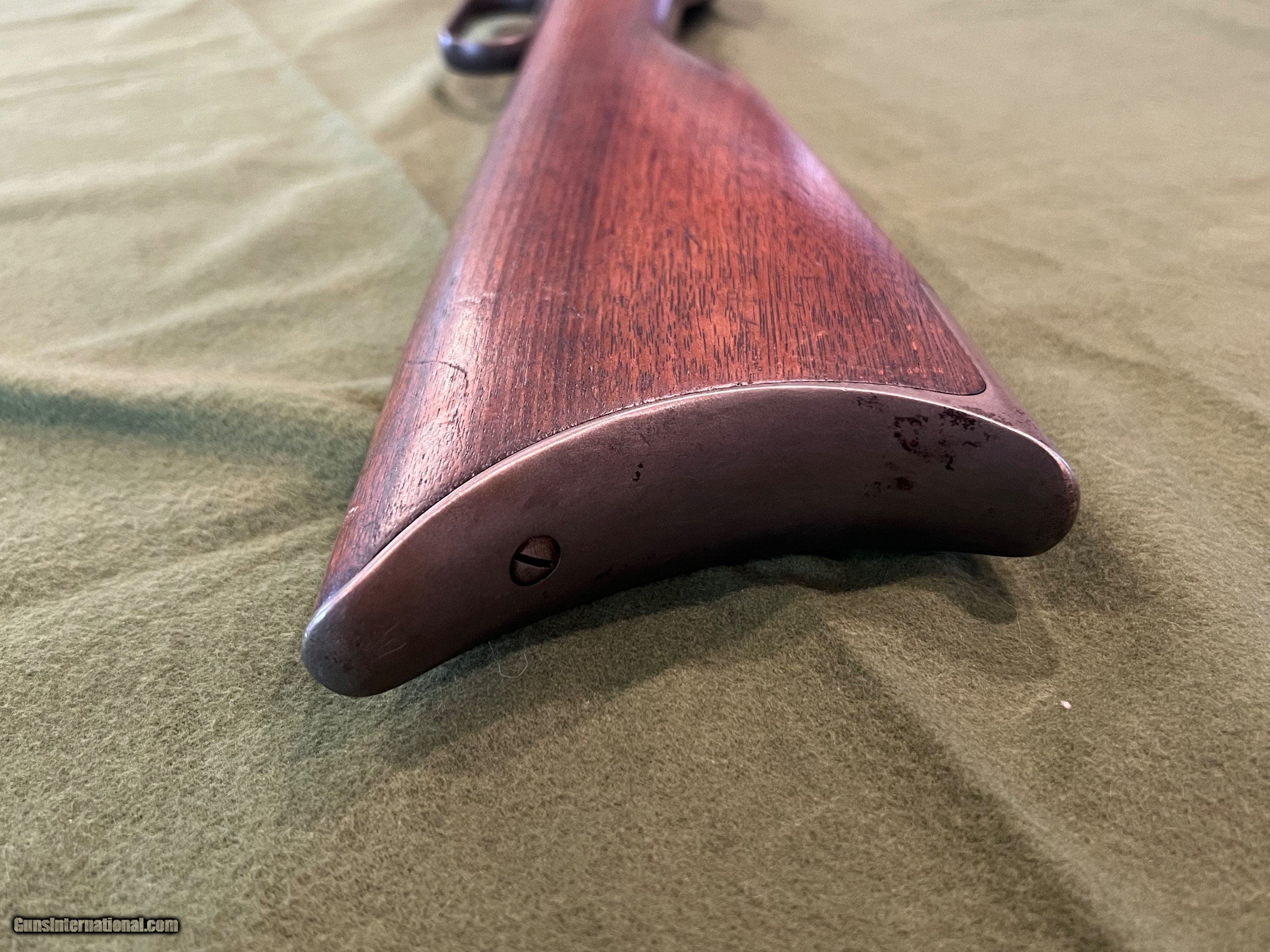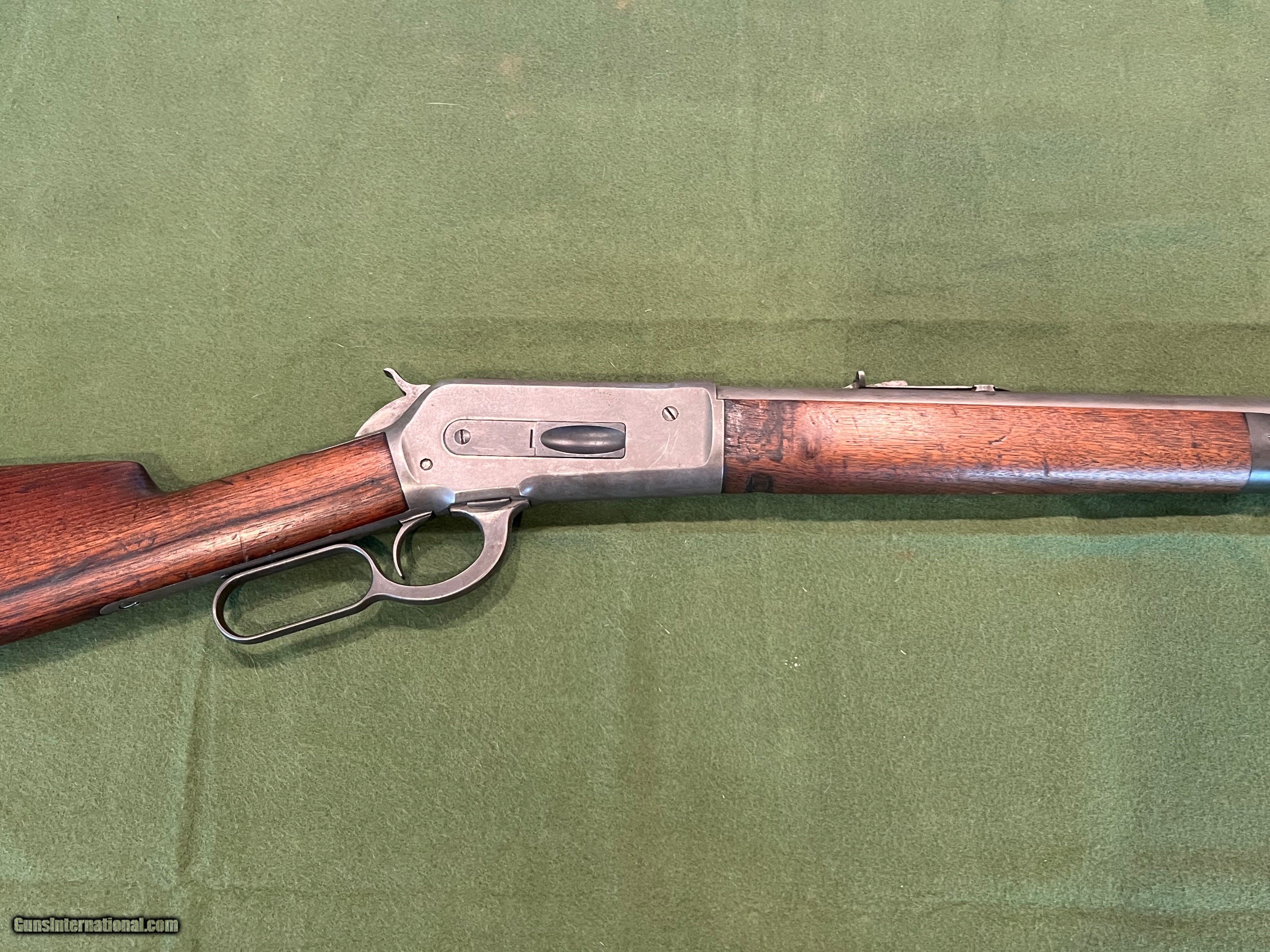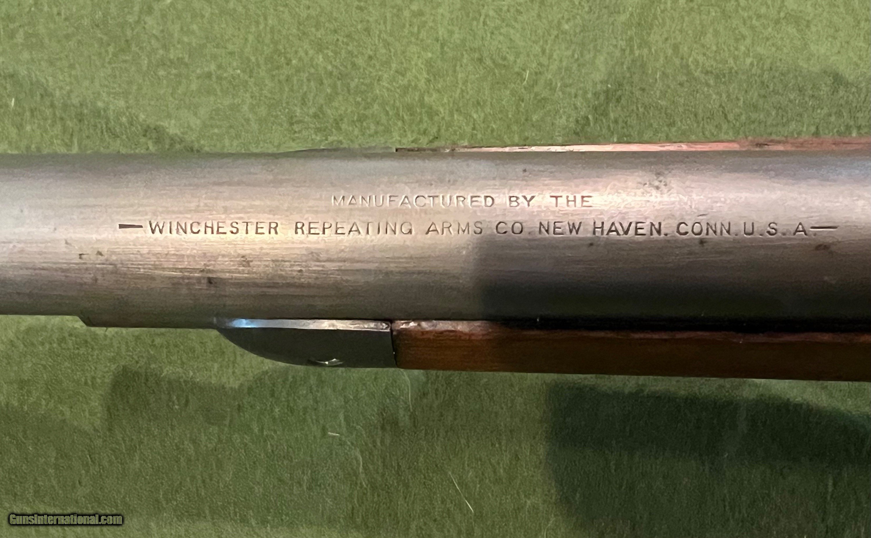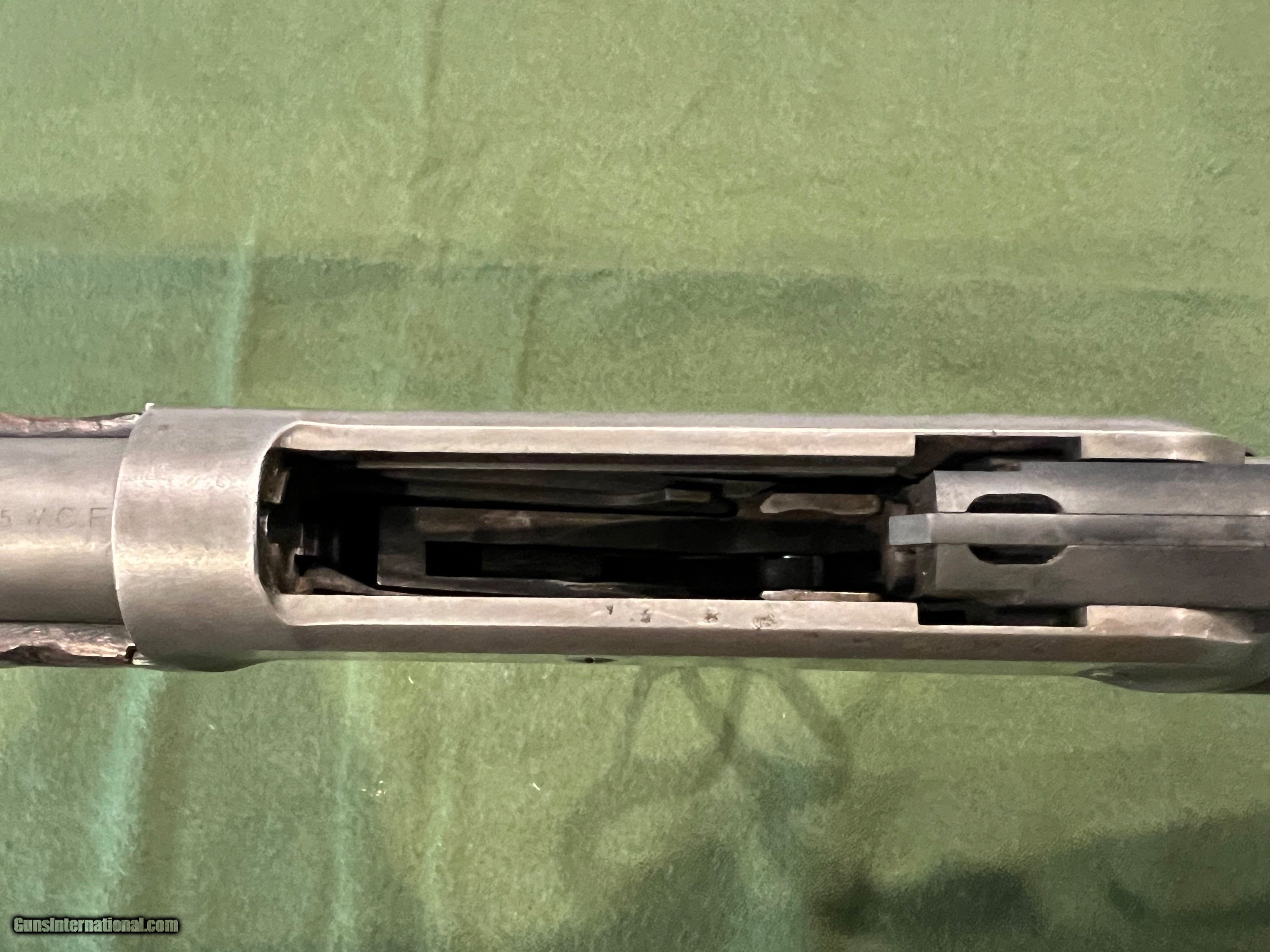 Description: I have a Winchester Model 1886 with a 26" round barrel in 40-65 manufactured in 1894. The 86 started life with a full length magazine tube but was shortened to look like a take down or for functionality. The change in the 86 looks to be done a ways back but was done correctly. The metal retains very little finish, but the metal is very smooth and shows almost zero pitting. The forearm has the initials WJM carved into the wood and a notch on the bottom of the forearm for a possible resting position. The action is strong and it has a very good bore. The bore is shiny with very little pitting, and I would say this 86 would be a great shooter SOLD Antique: Yes Rifle Caliber: .40-65 Winchester Manufacturer: Winchester Model: 1886 Serial Number: 85XXX Barrel Length: 26 inches Condition: Good Metal Condition: Smooth |