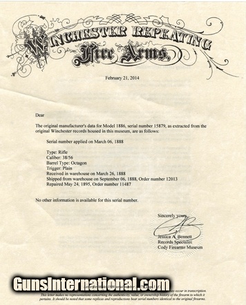 Winchester 1886 .38-56 caliber rifle. Made in 1888. Metal has a light brown patina and is nice and sharp. Wood is very good. Bore has strong rifling, but does have some pitting and is on the dark side. Nice clean Winchester 1886!
