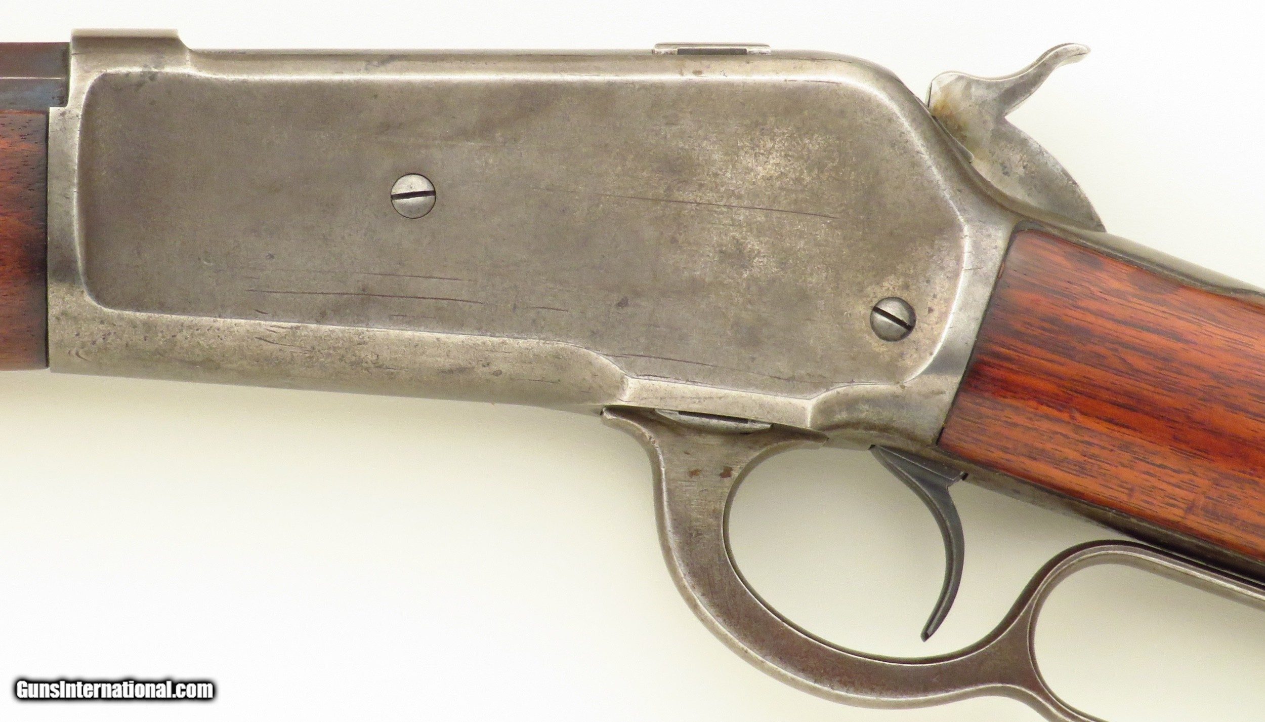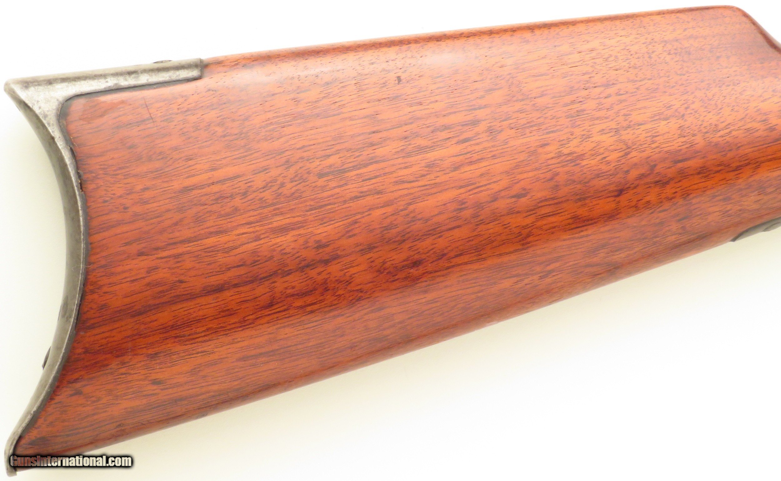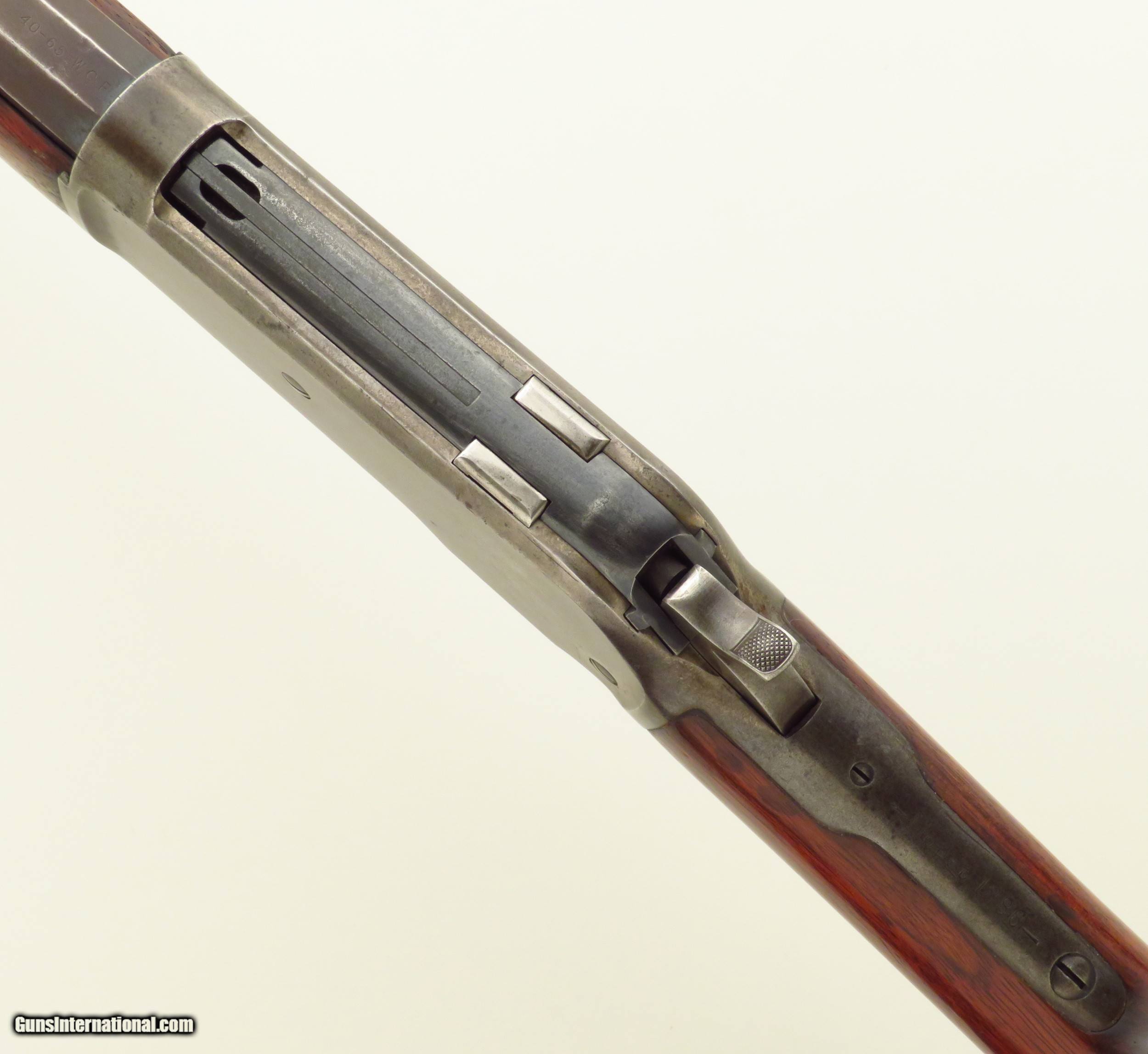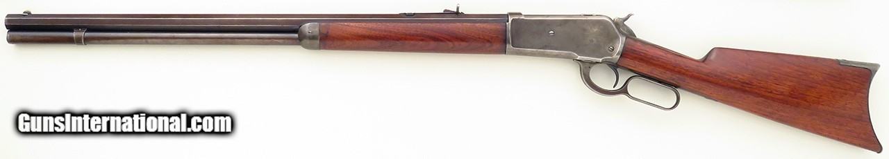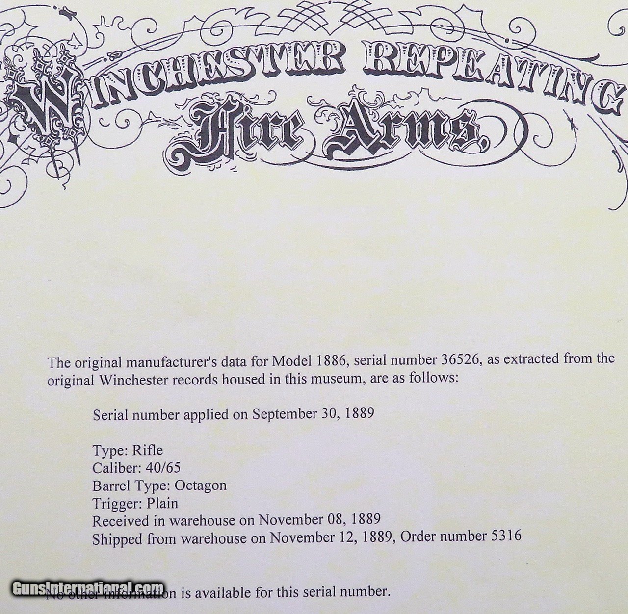 Description: Winchester Model 1886 .40-65. Made in 1889 per the included factory letter (copy), serial 36526 has a 26-inch octagon barrel (full-length magazine tube, blade front sight, adjustable rear sight) and a crescent butt plate. DIMENSIONS: Weight is 9.8 pounds and the length-of-pull is 13.0 inches. CONDITION: The bore shows general browning and moderate roughness, yet retains viable rifling. Barrel/tube finish has thinned and browned with areas of light tarnish. Receiver has browned. Wood has been sanded. Markings are sharp. Mechanics are good. The price is firm and layaway is available. $2,750 plus shipping. SOLD Antique: Yes Rifle Caliber: .40-65 Winchester |