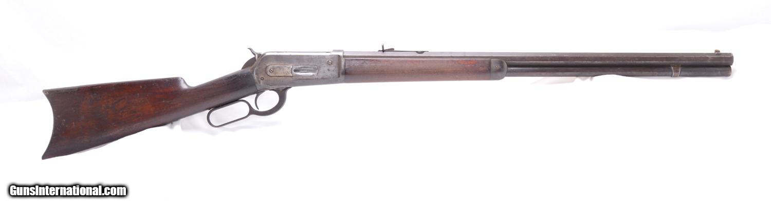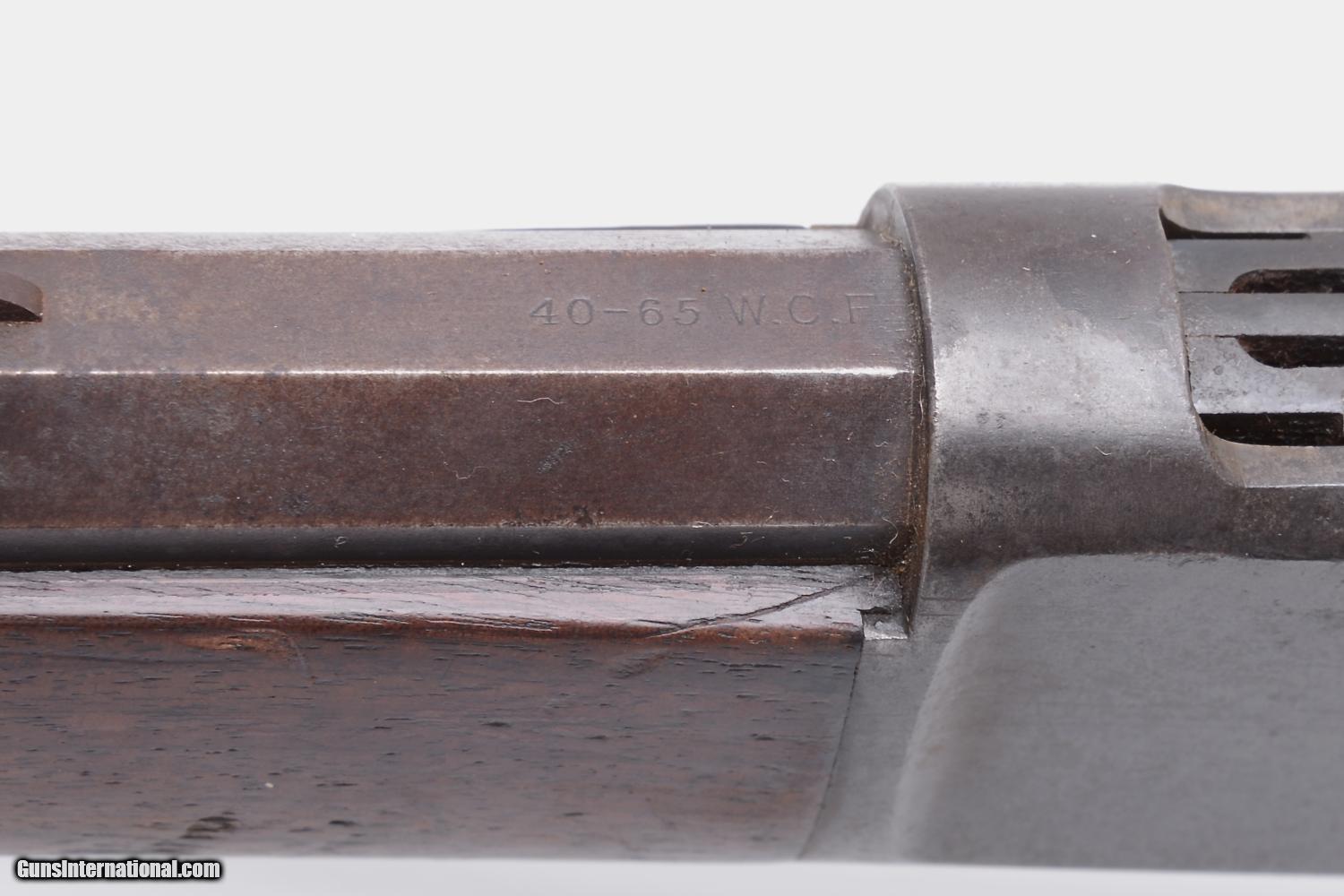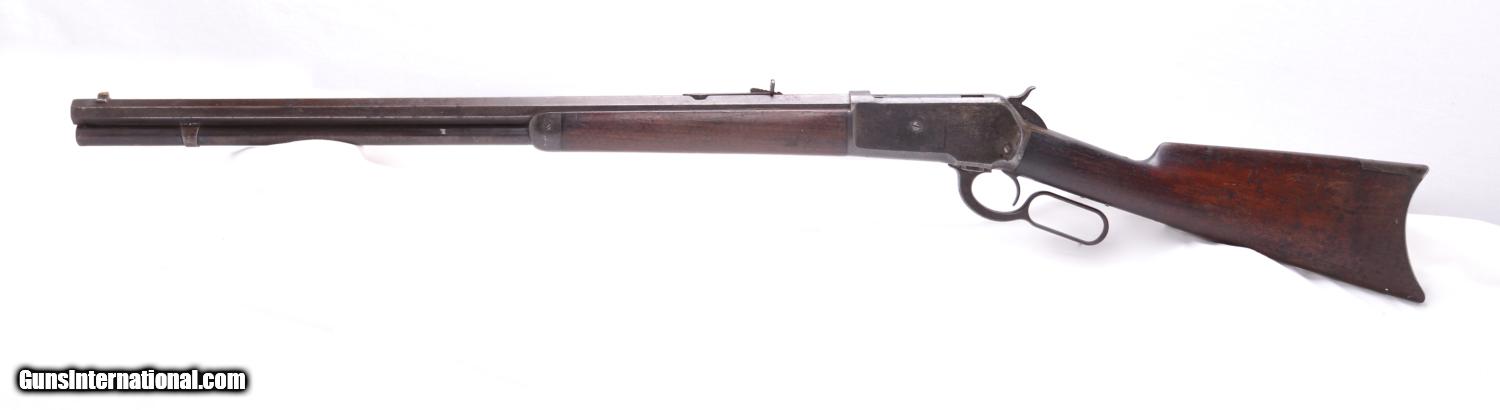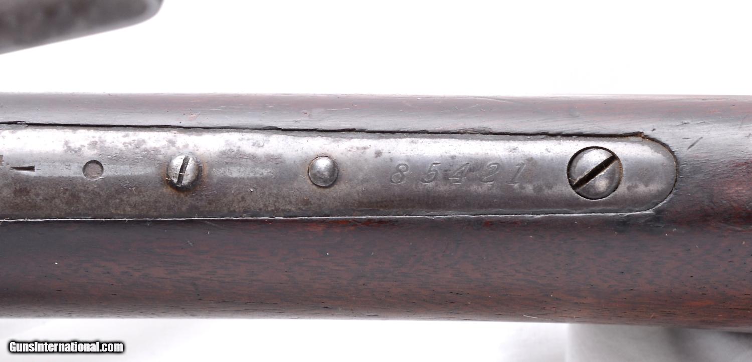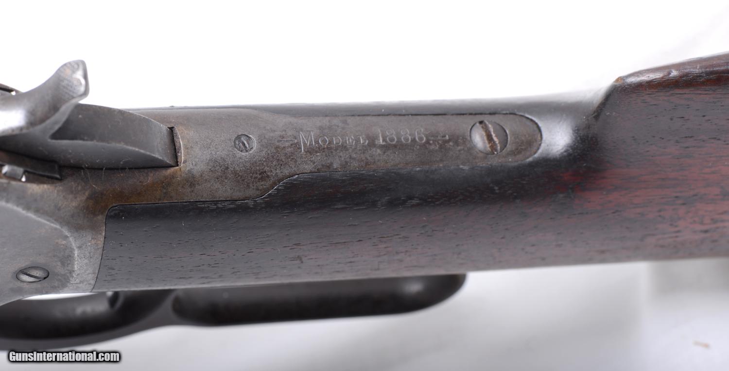Description: Winchester 1886 rifle in .40-65. This rifle was made in 1893. It is a standard '86 of the timel, 26" octagon barrel, full length magazine tube, crescent steel butt, etc. It is 100% original with the metal showing an overall antique "browning" and the wood finish, although still there, has dulled over the last 122 years! Mechanically it is very sound and the action is smooth and strong. The bore is strong, the rifling prominent but there is some uniform "frosting" and a little pitting...very shootable. No cracks in the wood, in fact not even a significant "ding" or dent. Original sights. All in all a nice original example of an 86. SOLD Antique: Yes |