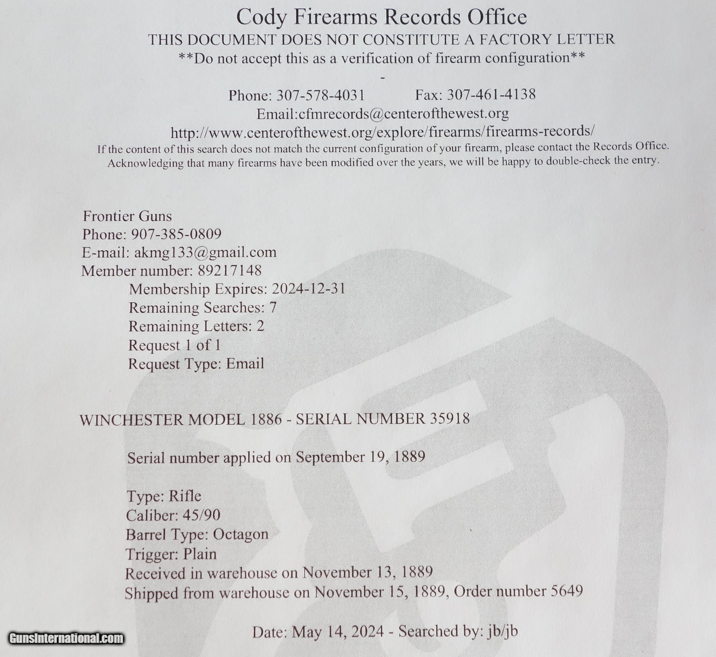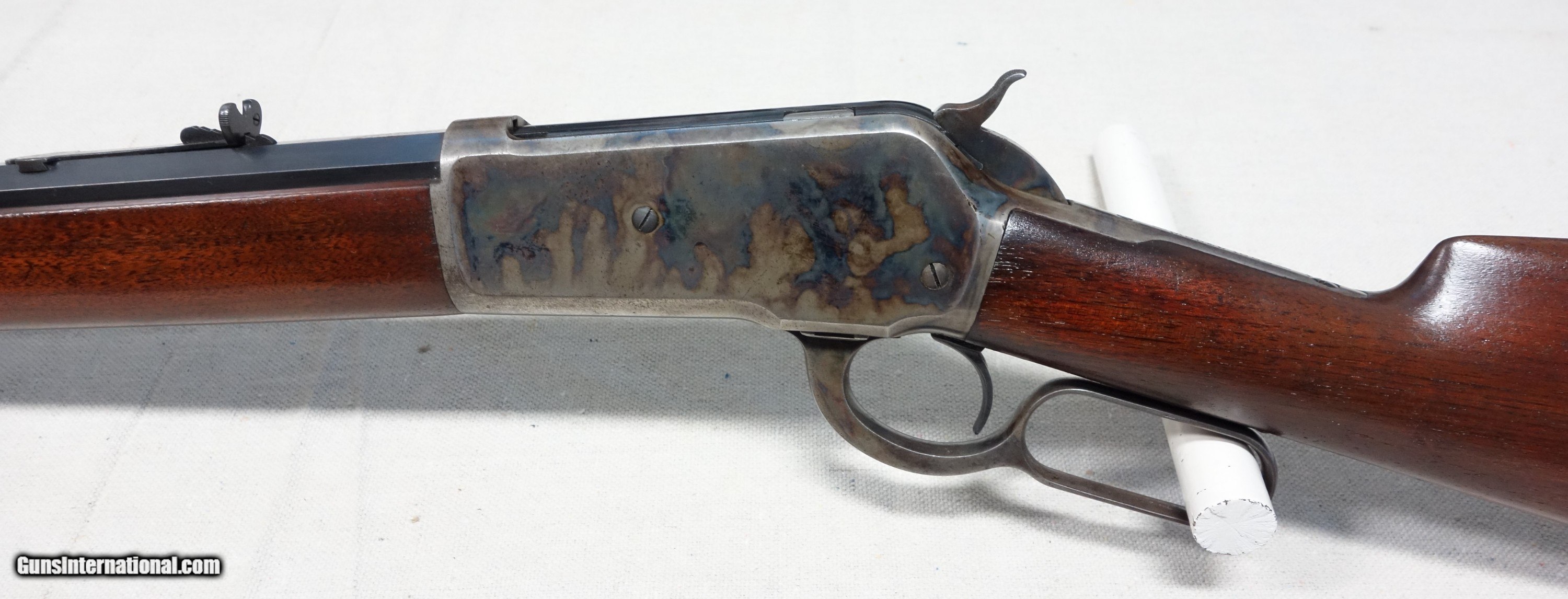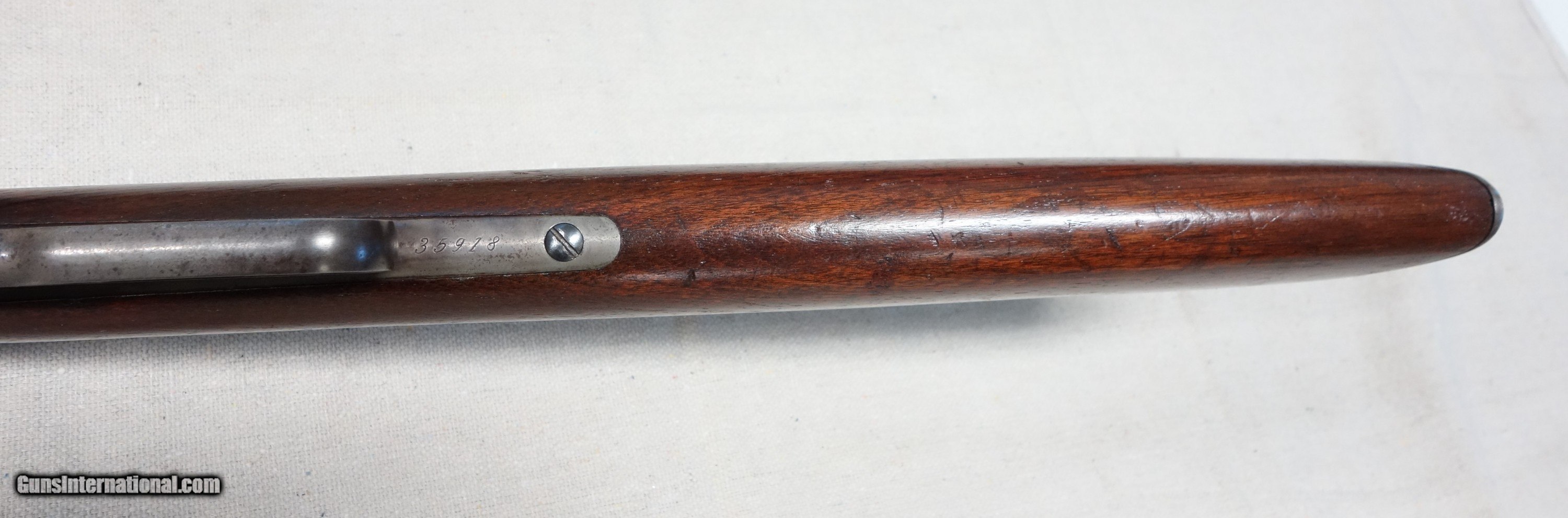 Description: ***SOLD*** Very sharp looking big bore Winchester 1886 in the desirable 45-90 caliber. S/N 35918 made in 1889. 26" Octagon barrel with an excellent bore. Full length mag tube. Crescent buttplate. Excellent condition throughout with strong original finishes and quite vivid case colors remaining on the receiver walls. Nice, even bluing with no notable discoloration or browning. The wood finish shows some light handling marks, dings and scrapes but presents very well in hand. The original sights consist of a Winchester folding combination 5B up front and a Winchester sporting rear. As mentioned, the bore is excellent, bright and shiny throughout with strong rifling, and the mechanical functions are as crisp and strong as new. A really nice '86. Comes complete with a supporting Cody Museum research letter. SOLD Antique: Yes |
