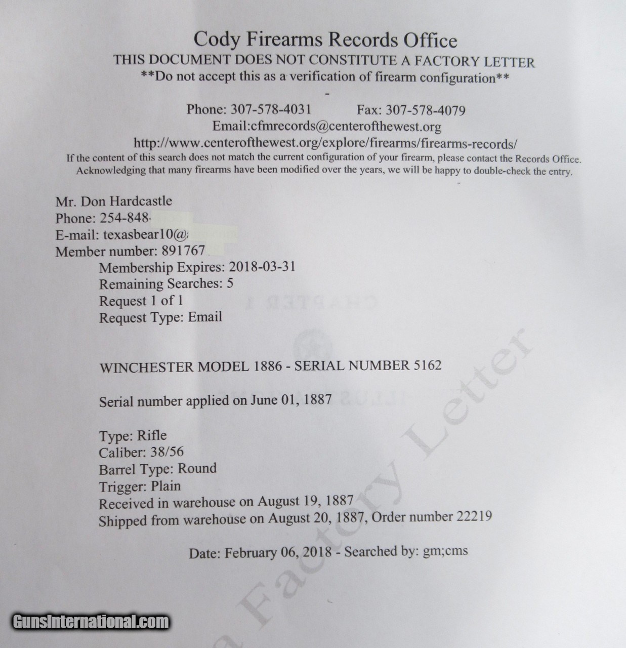Description: SOLD, GOING TO VERMONT!!! Winchester Model 1886; Serial No. 5162; Made 1887; 26” Round Barrel in 50-110 Caliber; Metal is Blue/Brown Patina; Nice Wood; Perfect Action and Bore; Originally in 38/56 Caliber but Changed to 50-110 in 1888 (“88” on Bottom of Barrel); Very Durable 135 Year-Old Winchester Lever Action Rifle with Documents; See All Photos for Condition; No Texts; Call (254)541-5765 or Email Only; PERSONAL PROPERTY of Harold Wieser; Price: $3,975 + $75 S&H Via USPS PRIORITY MAIL; Payment Address: Harold Wieser - 1466 U.S. Hwy 77 - Rosebud, TX 76570; SEND PAYMENTS VIA USPS PRIORITY MAIL; BEWARE of SCAMS!!! – DO NOT SEND MONEY or CORRESPONDENTS ELECTRONICALLY UNLESS YOU HAVE SPOKEN to HAROLD WIESER FIRST! 254-541-5765 SOLD Manufacturer: Winchester Model: 1886 Serial Number: 5162 |