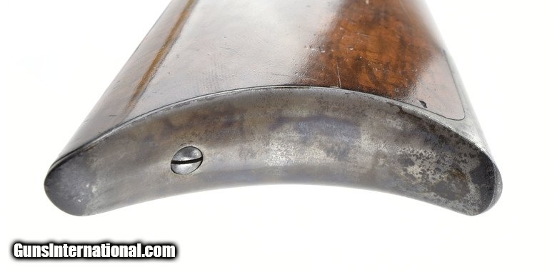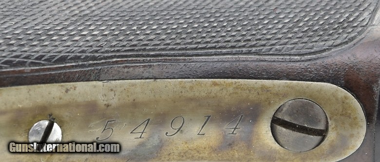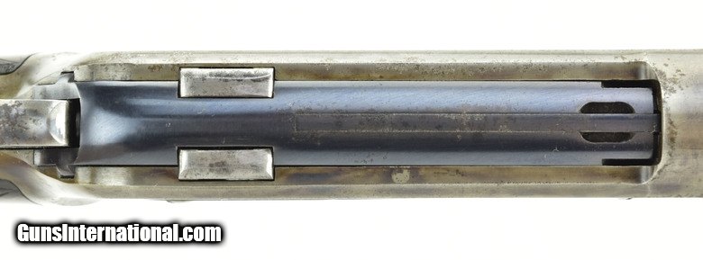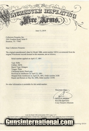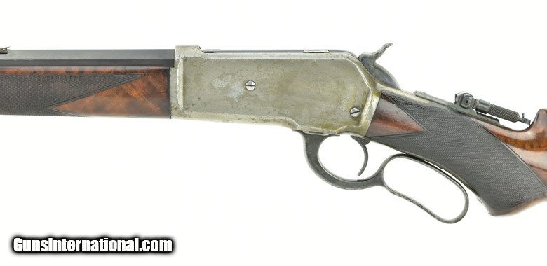 Description: Winchester 1886 Deluxe .38-56 caliber rifle. Made in 1891. Beautiful gun in .38-56 caliber. Blue on barrel is excellent. Frame has about 40% case colors. Right-hand side of frame has all case colors and left-hand side retains very little. We believe someone cleaned this side and accidentally removed them. Wood is excellent with nice figure. Very fine beautiful Winchester 1886 Deluxe!