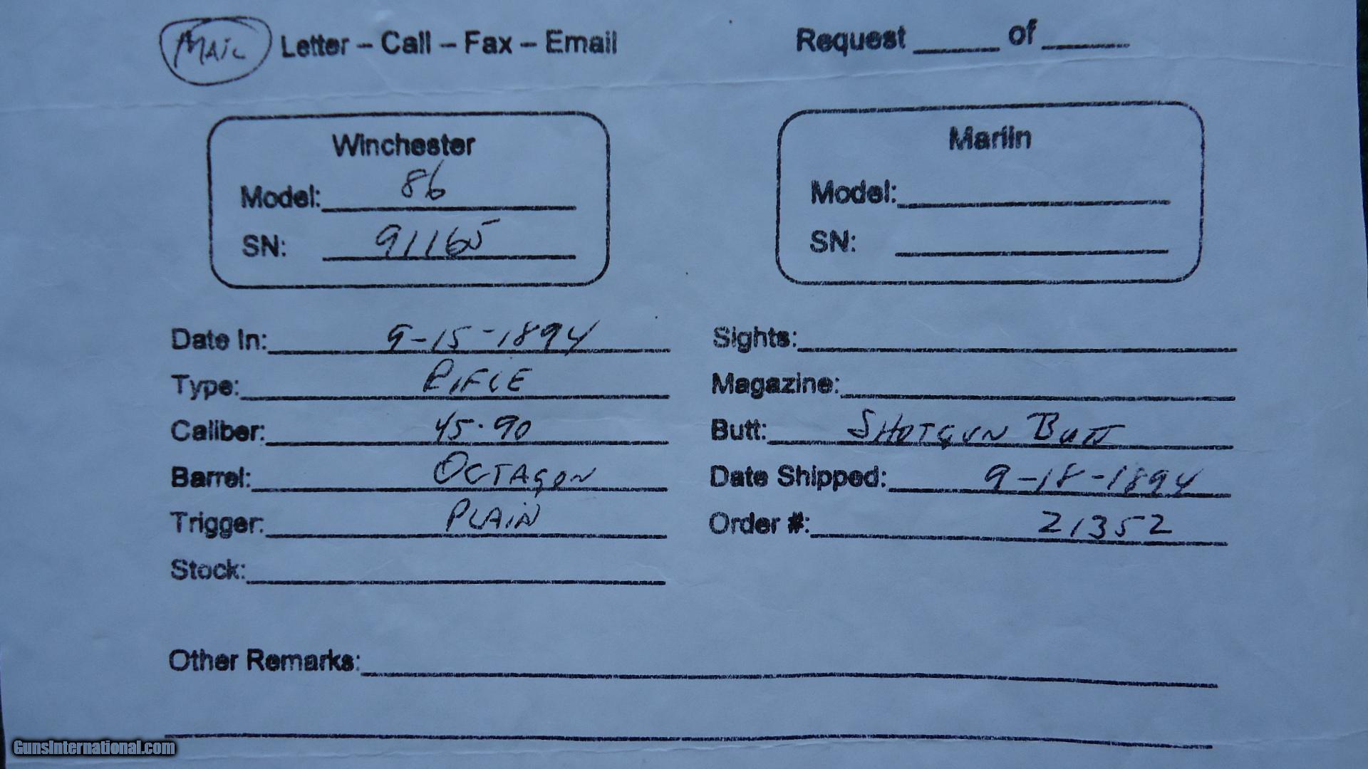 Description: 26 inch full octagon barrel chambered in 45-90 WCF caliber. Full length mag tube and steel shot gun butt plate. Action is fine and the bore is good with some light roughness throughout. All metal surfaces are brown/gray patina. German silver front and a sporting rear sight. Wood has some dings and dents but is solid with no cracks. A research form accompanies the rifle stating the 45-90 caliber as well as the octagon barrel and shotgun butt. An antique Winchester from 1894 in a desirable caliber. Leroy Merz Antique Firearms specializes in antique and vintage Winchesters and other fine American firearms. Since 1965 Mr. Merz has taken part in the world of firearms and has been a contributor to many well known reference books. Just recently we mailed the 127th edition of our privately-published catalog. We have hundreds of additional guns in every price range at our home online. Search for Merz Antiques in google. SOLD Antique: Yes |