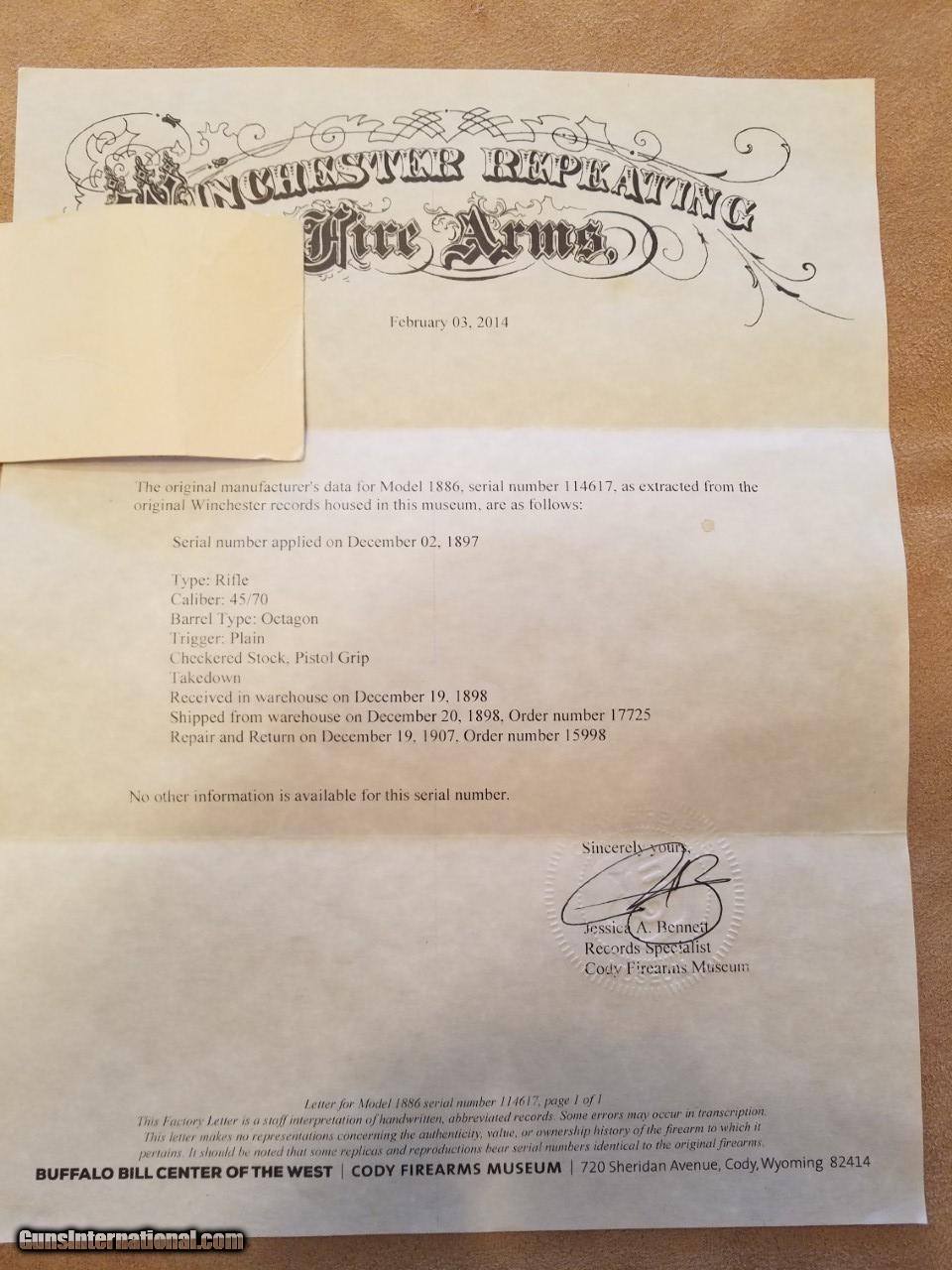 Description: This is a nice 1886 Deluxe with the desirable 45-90 caliber with octagon barrel and takedown. It was received ine warehouse Dec. 19, 1898 and shipped Dec. 20, 1898 thus making it a antique status. The nicely figured walnut wood has very good original finish with few blemishes. Checkering is sharp with little wear.The barrel address and caliber stamps are crisp with strong bluing. The bore is excellent..no spotting and very bright strong riflings. A marbles rear elevated sight. Action is tight and gun feels like new to operate the action and trigger. asking $8900.00 Thanks for looking. SOLD Antique: Yes Bore Condition: excellent Barrel Type: Octagon Manufacture Date: 1898 |