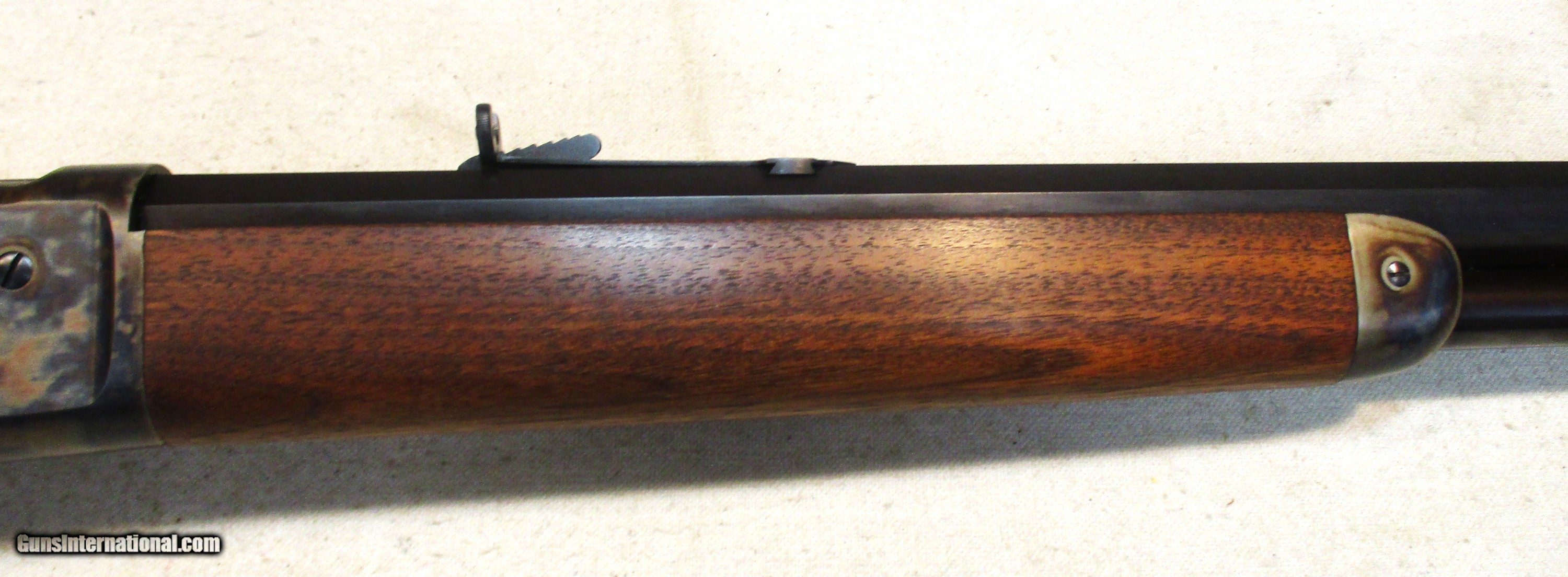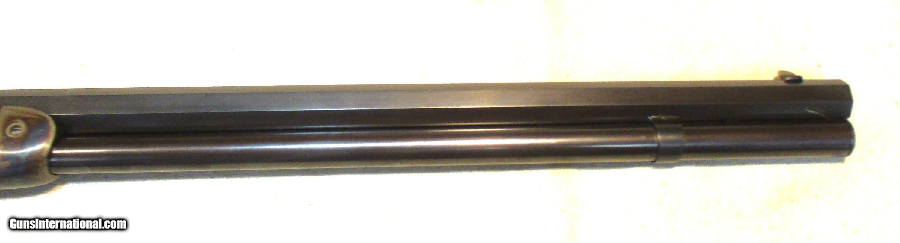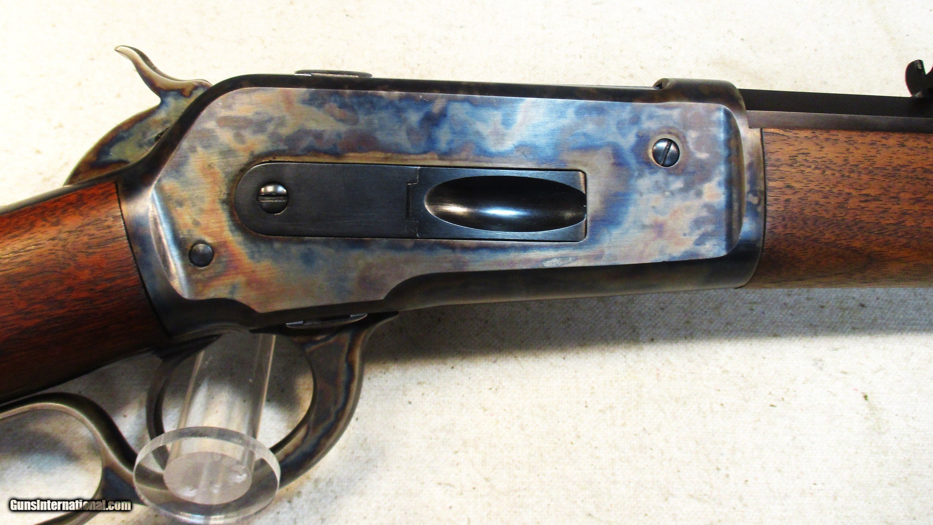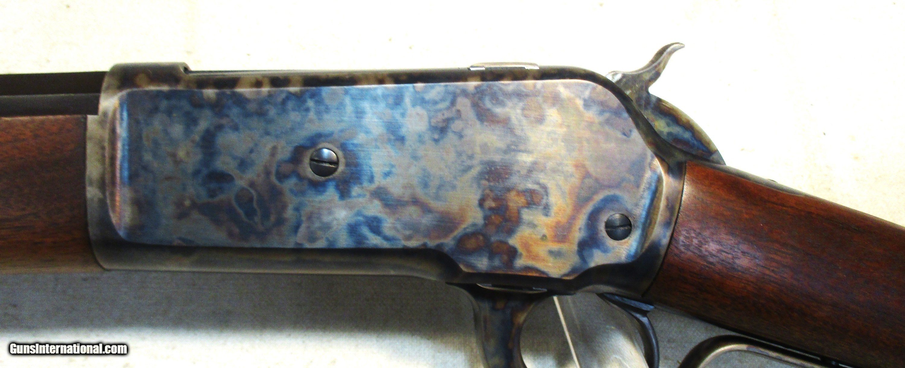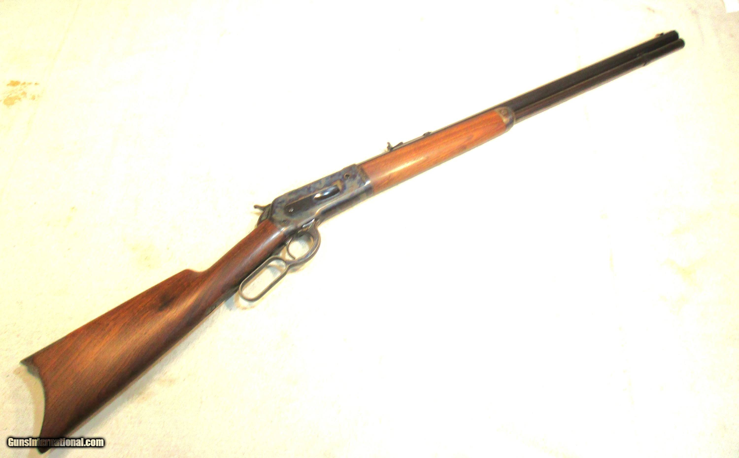 Description: Custom Restored Winchester 1886 .45-70 Sporting rifle Manufactured in 1894. Rifle has a case-hardened metal butt plate, walnut straight grip stock and plain forearm, case hardened receiver, lever, trigger and hammer, 25” octagon blued barrel, Full length magazine tube, and adjustable rear buckhorn and blade front sight. Top of barrel has 2 line roll stamped register MANUFACTURED BY THE-WINCHESTER REPEATING ARMS CO NEW HAVEN CONN. U.S.A. . 45-70 stamped in front of receiver. Bottom tang stamped PAT. OCT. 14. 1884. -JAN. 20.1885. 90992 serial number. Top tang stamped- MODEL 1886- Rifle was restored in 1996 by Charles H. Jones, Firearms Restoration, Kerrville, Texas. The rifle comes with a letter detailing all the restoration, and upgrade work done on the rifle.