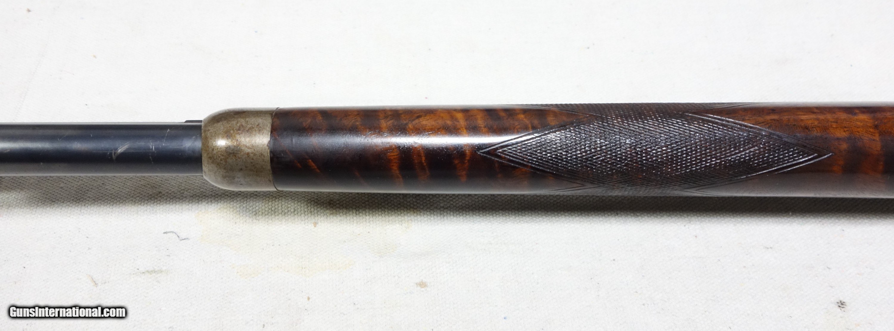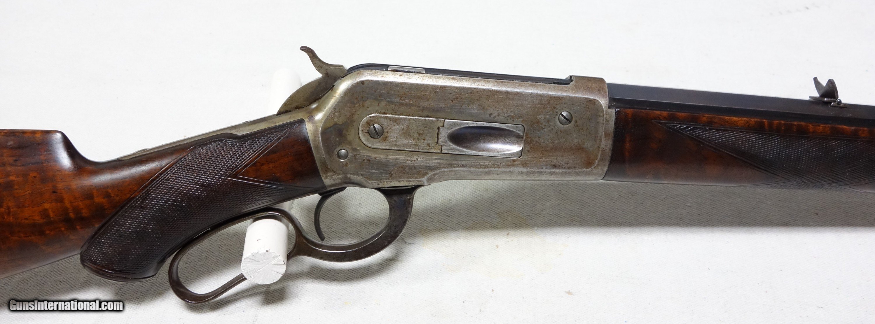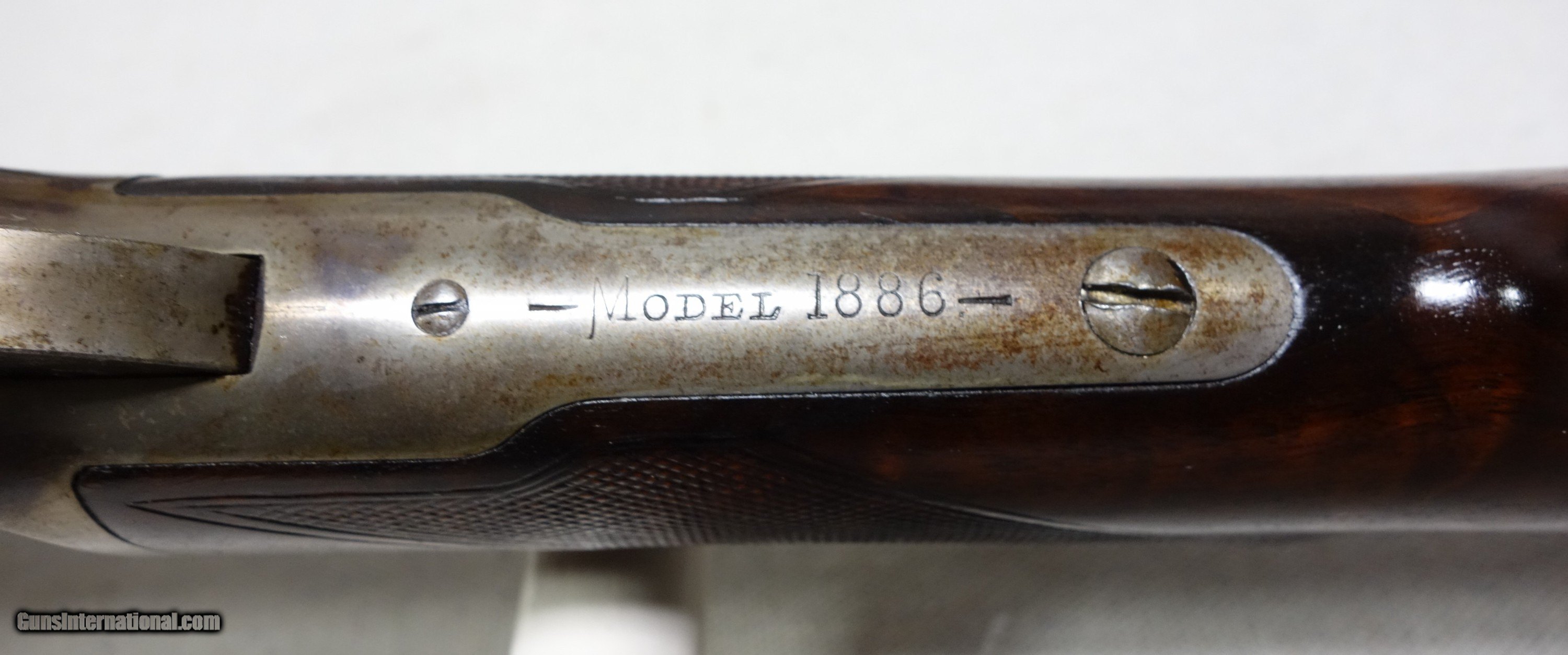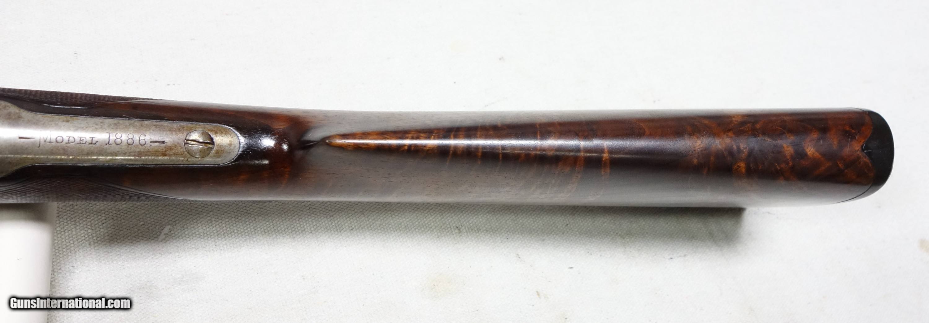 Description: ***SOLD*** Winchester 1886 Deluxe rifle in 45-70 caliber S/N 109528 made in 1896 26" half octagon barrel. Bore looks good inside front half, reflective with strong rifling, grooves are darker/rougher from midpoint to frame but still showing some bright rifling throughout. Strong original blue about 90%. Some fading case colors remain on receiver and hammer along with light surface oxidation. 2/3 length magazine tube. Beautiful 3x wood set with little to no wear showing some light surface maintenance over the years, but does not appear to have been monkeyed with otherwise. Deluxe checkering, pistol grip cap, composite buttplate with widow's peak heel. Sights consist of a Lyman ivory bead up front and a Winchester 2 leaf folding rear. Great mechanical functions. Please add $100 for expedited and fully insured shipping from Alaska in a custom cut, foam lined box for added protection. SOLD Antique: Yes Rifle Caliber: .45-70 Government |